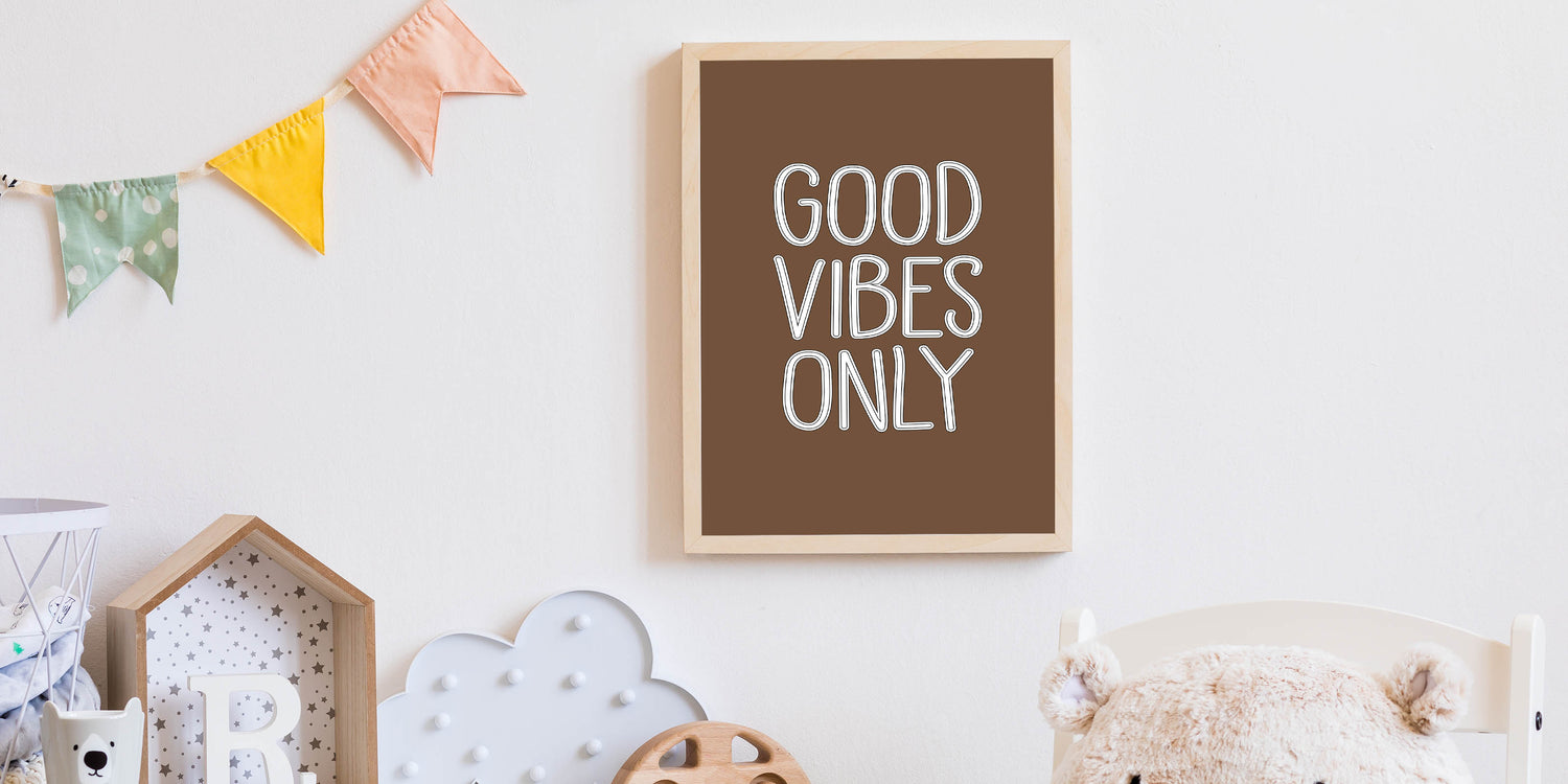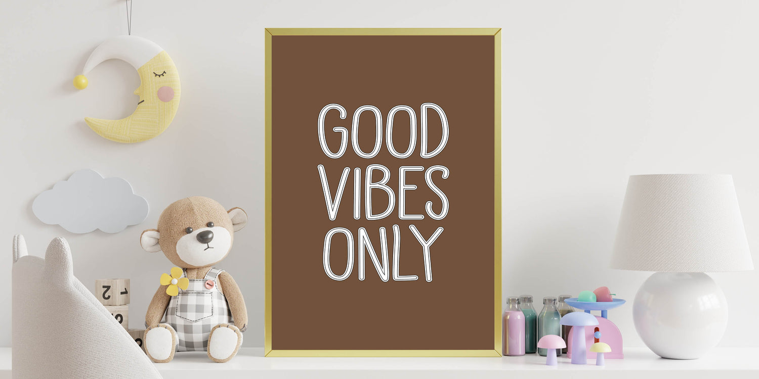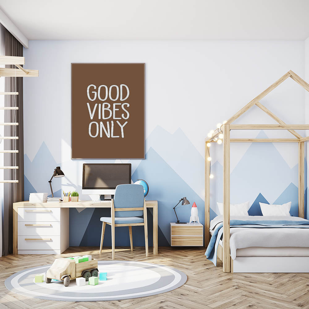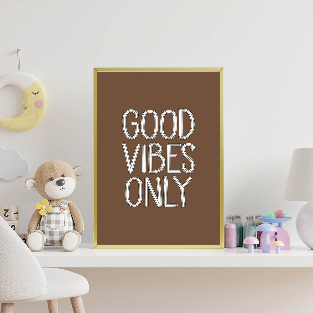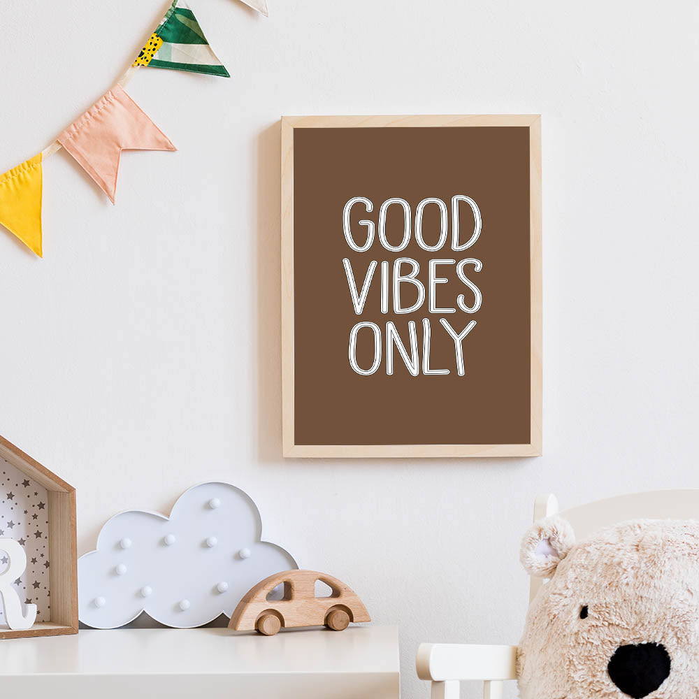 Create a positive and inspiring atmosphere in your child’s space with this Good Vibes Only wall art. Featuring bold white typography on a warm brown background, this motivational print is perfect for adding a stylish and uplifting touch to any boys' bedroom, playroom, or nursery.