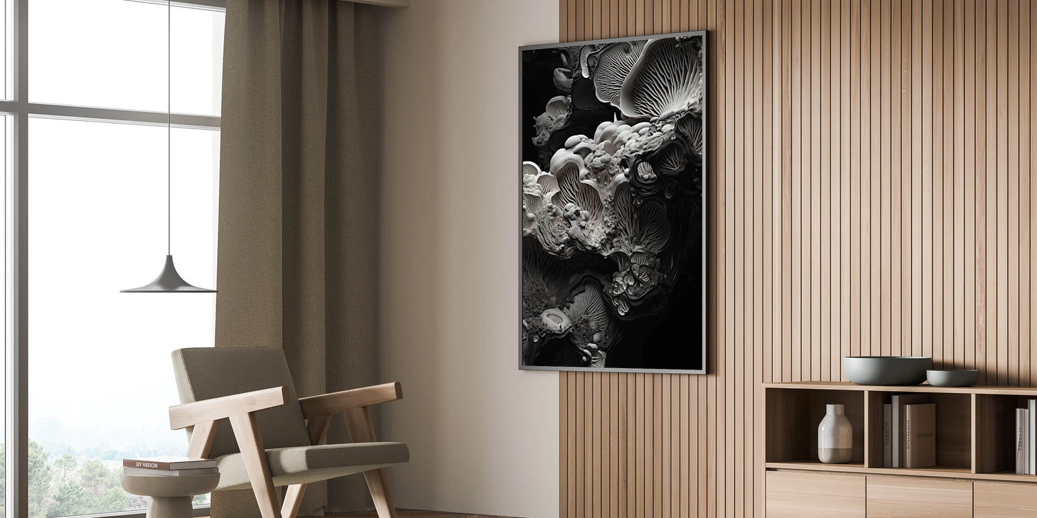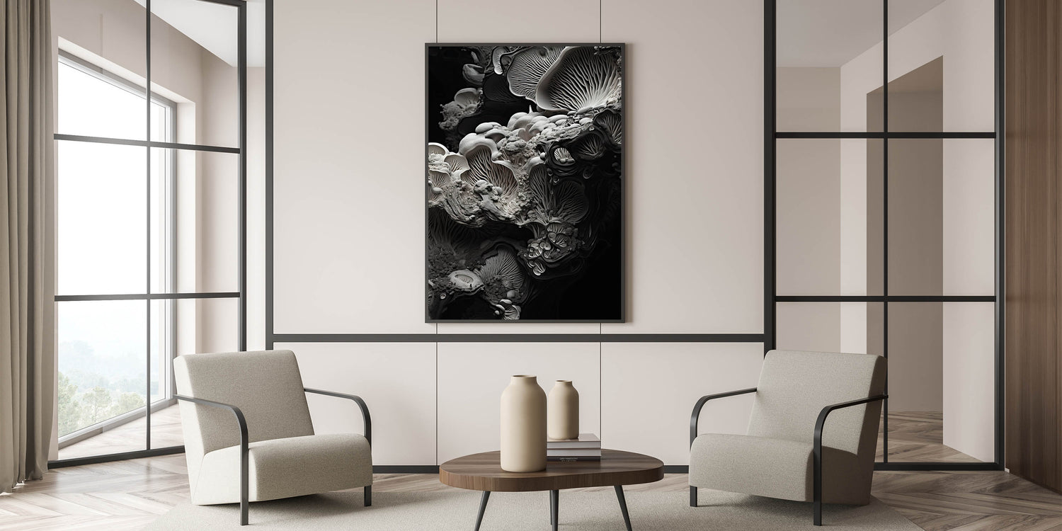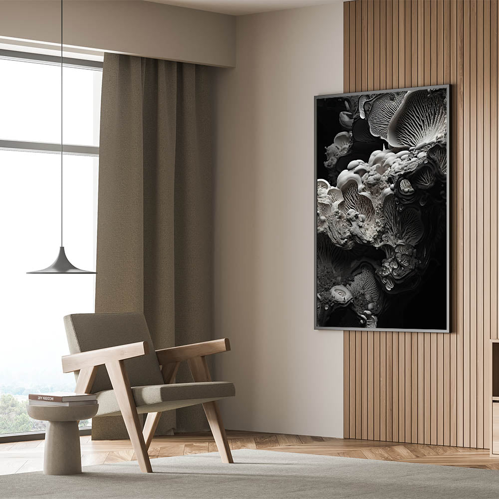 Discover the serene elegance of nature with this grayscale mushroom macro wall art. Featuring a detailed closeup of mushroom gills and textured fungi, the artwork highlights the delicate forms and flowing patterns found in nature’s hidden corners. The monochrome palette adds a timeless, sophisticated touch, while the deep shadows and intricate highlights create a captivating visual contrast.