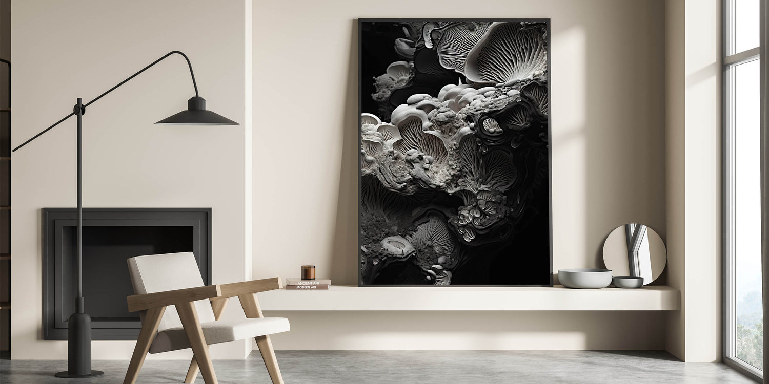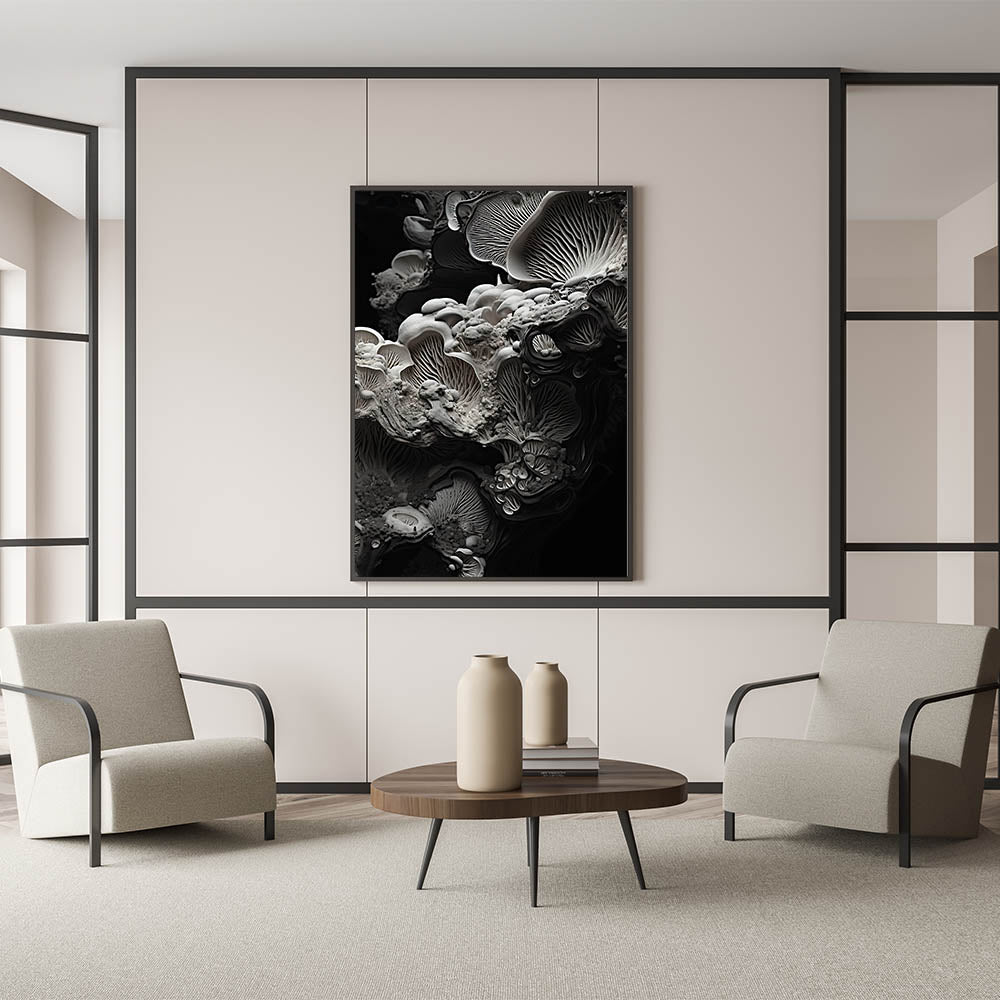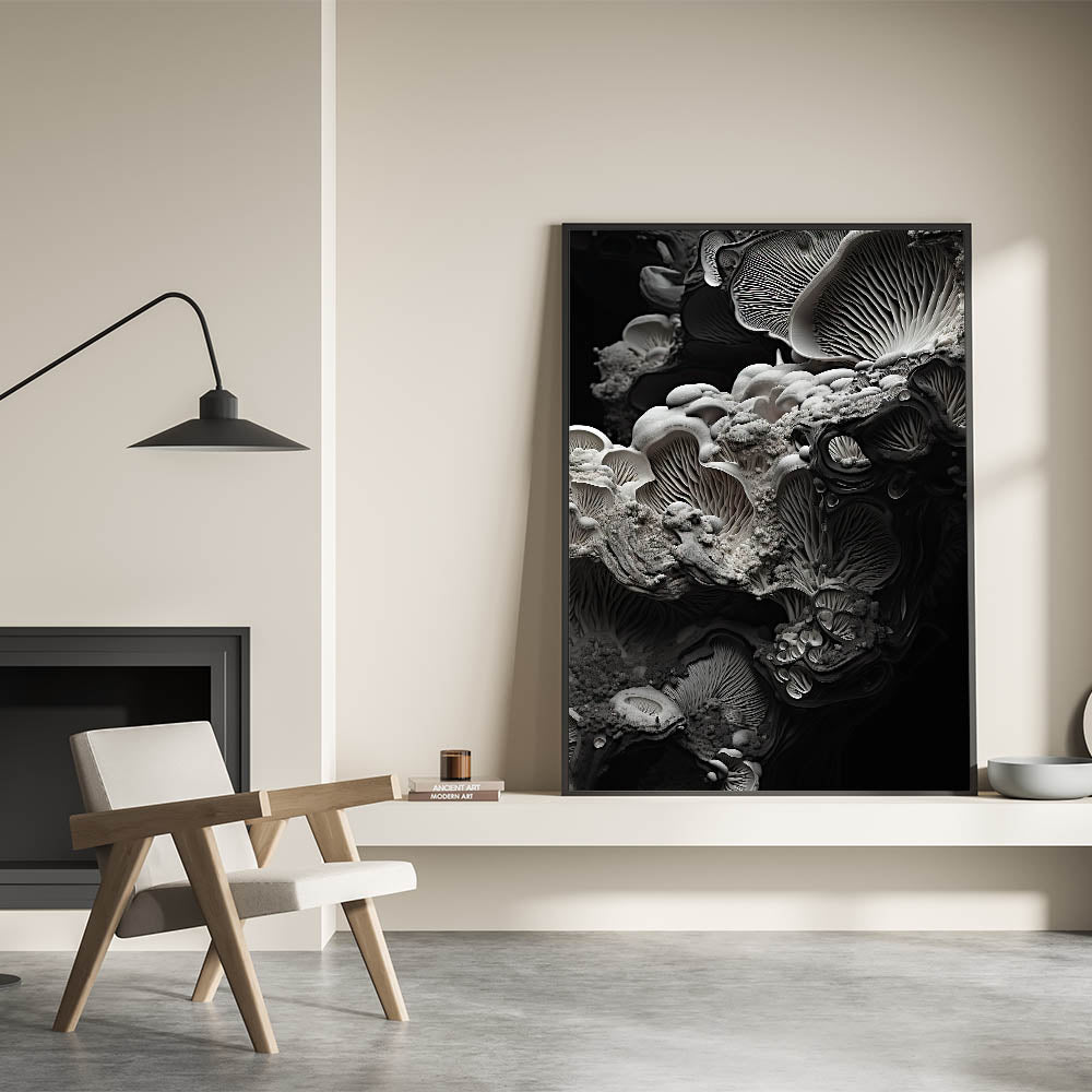 Grayscale Mushroom Macro Art – Elegant Monochrome Nature Wall Decor