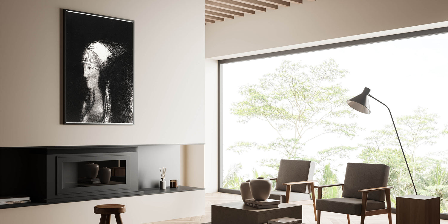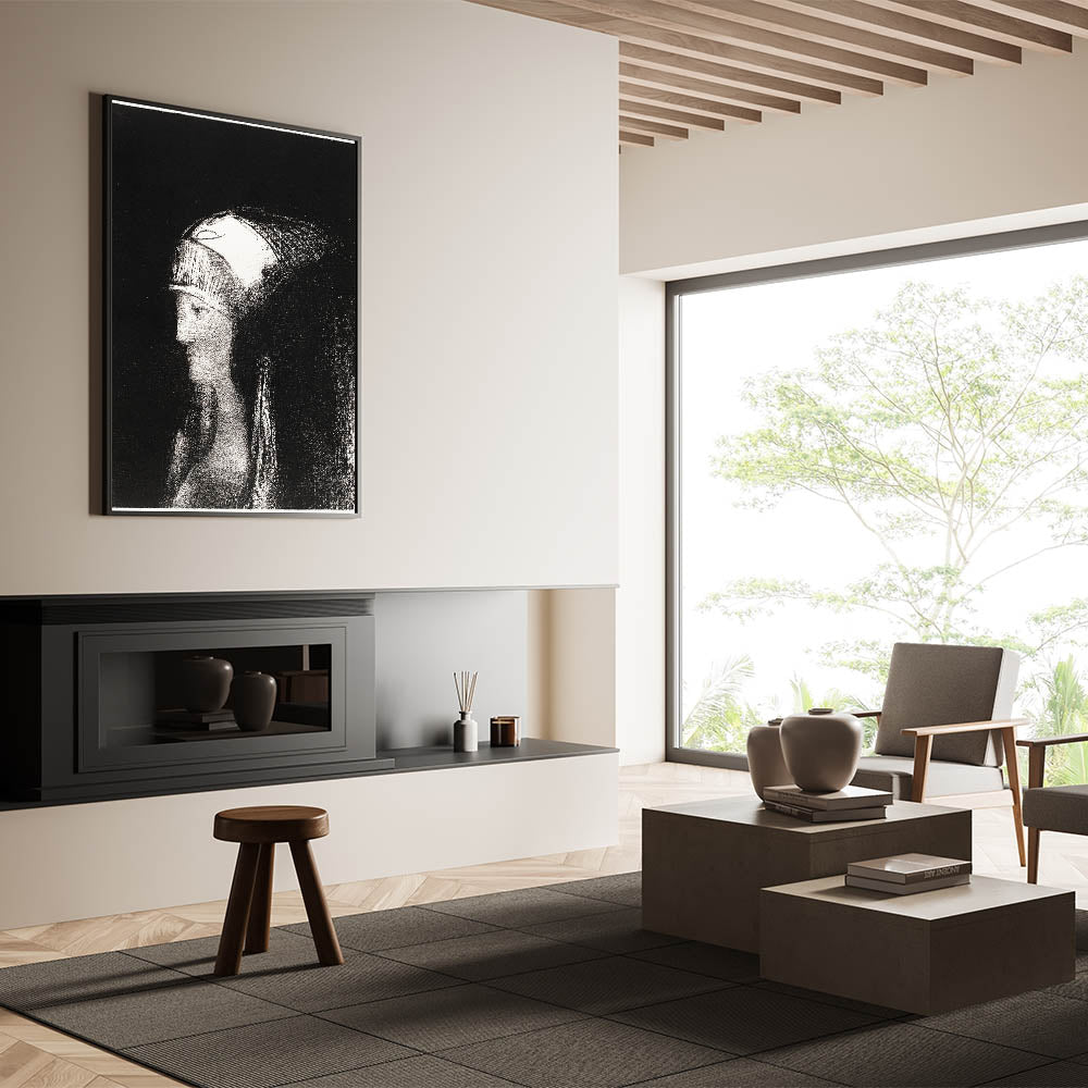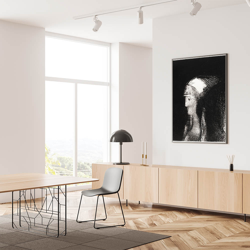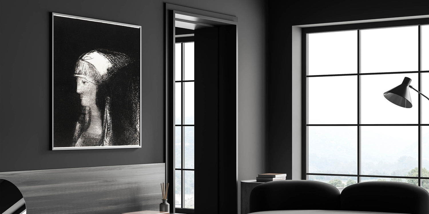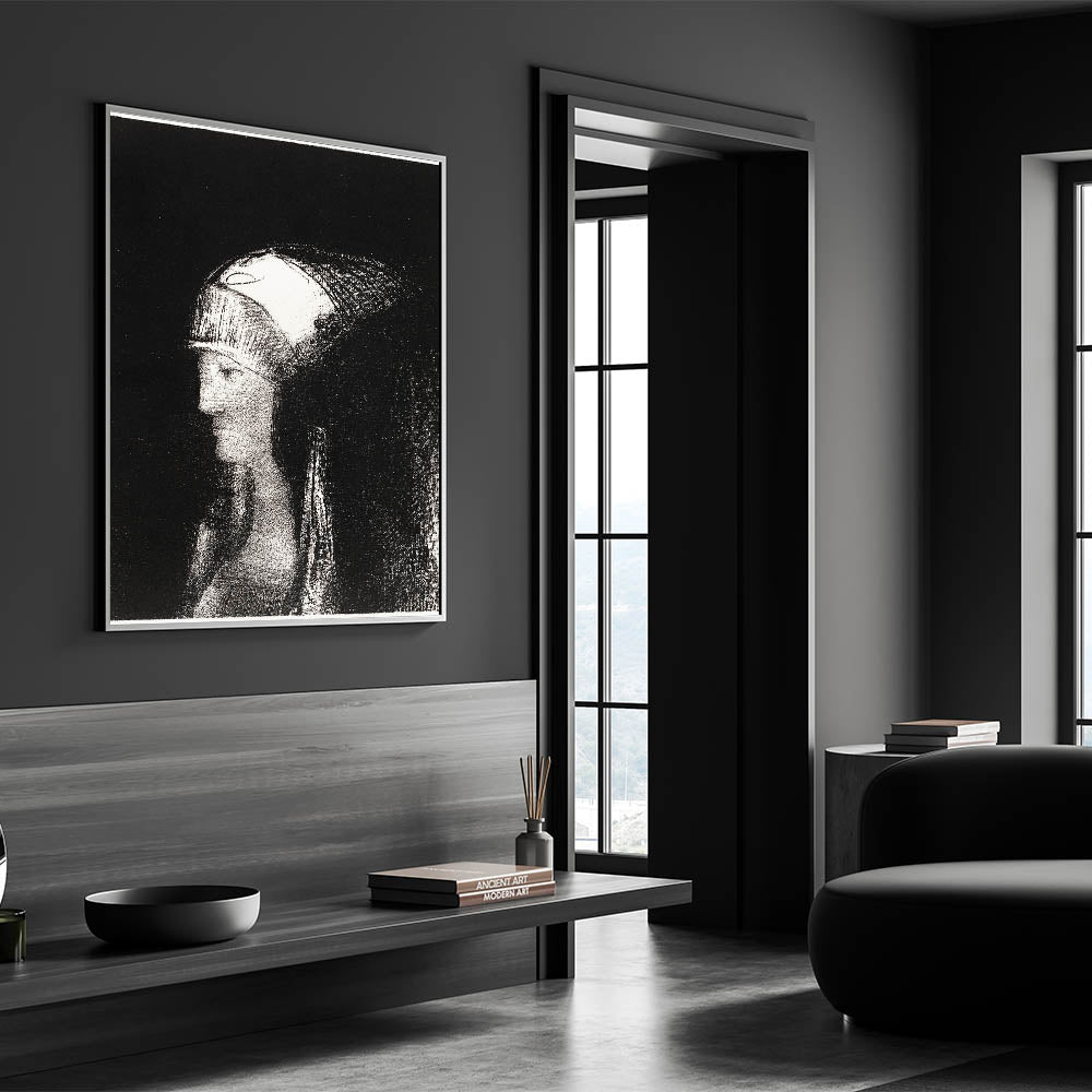 Bring a touch of mystique to your space with this hauntingly beautiful portrait wall art by Odilon Redon. This monochromatic piece, featuring an ethereal woman set against a dark background, creates a striking, otherworldly atmosphere that adds depth and sophistication to any room.