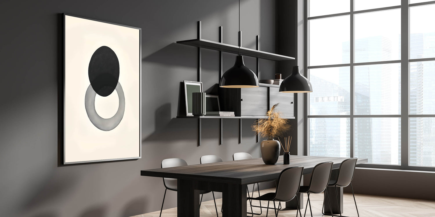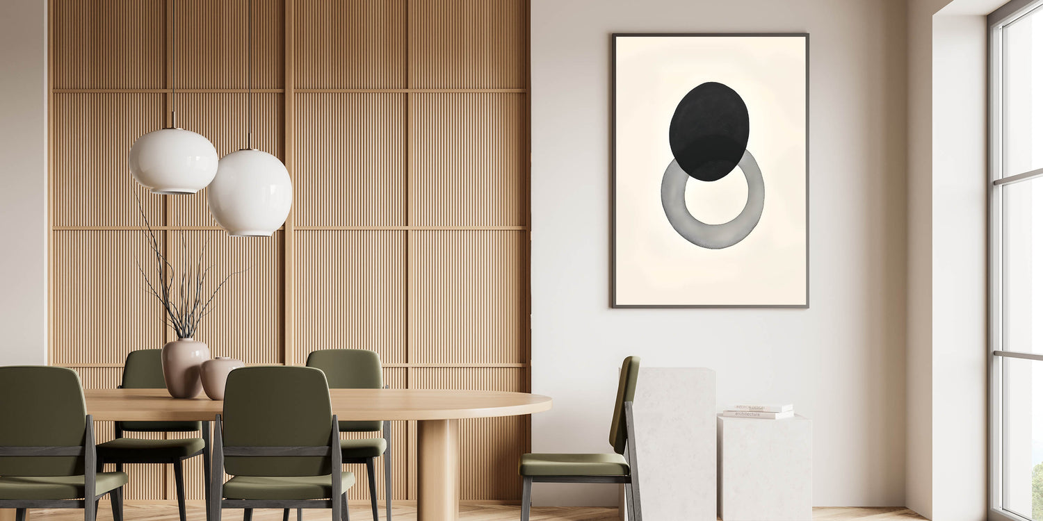 Elevate your dining space with high-quality canvas art for dining rooms, featuring a minimalist abstract composition in black and gray tones. This elegant dining room wall art blends simplicity and sophistication, making it an ideal focal point for contemporary interiors.
