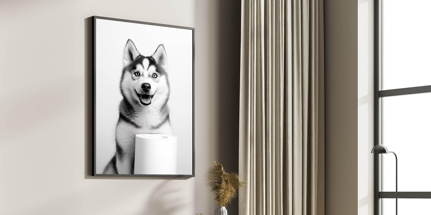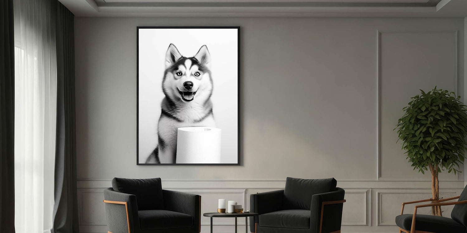 Add personality and charm to your bathroom with this Husky Bathroom Wall Art. Featuring a striking black-and-white portrait of a cheerful husky accompanied by a roll of toilet paper, this artwork combines a playful vibe with minimalist sophistication. The sharp monochrome palette makes it a versatile piece for any modern or classic bathroom decor.