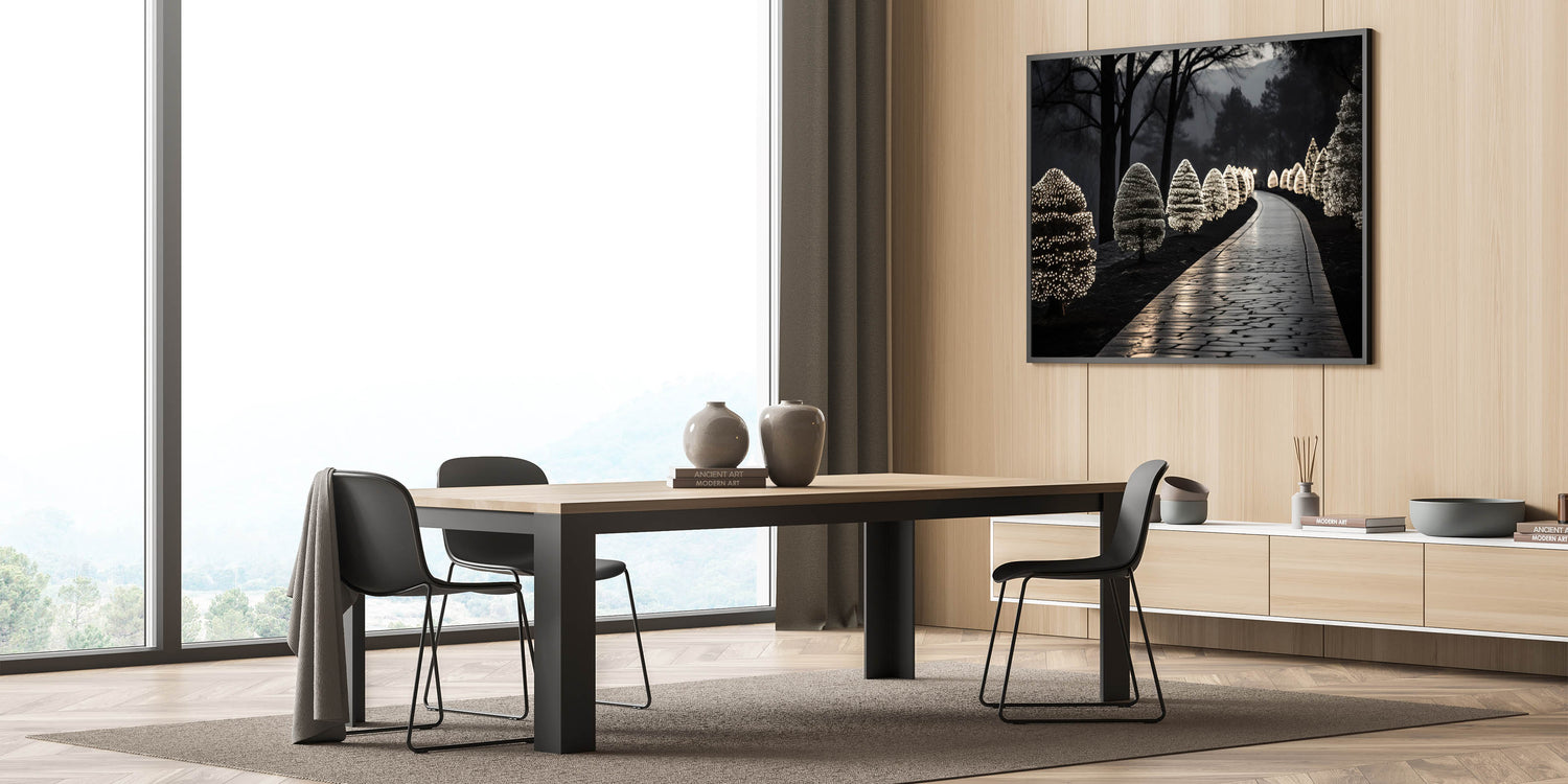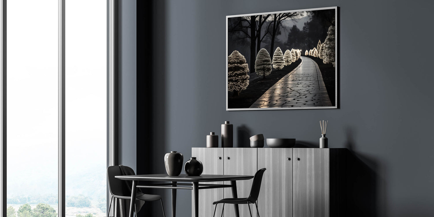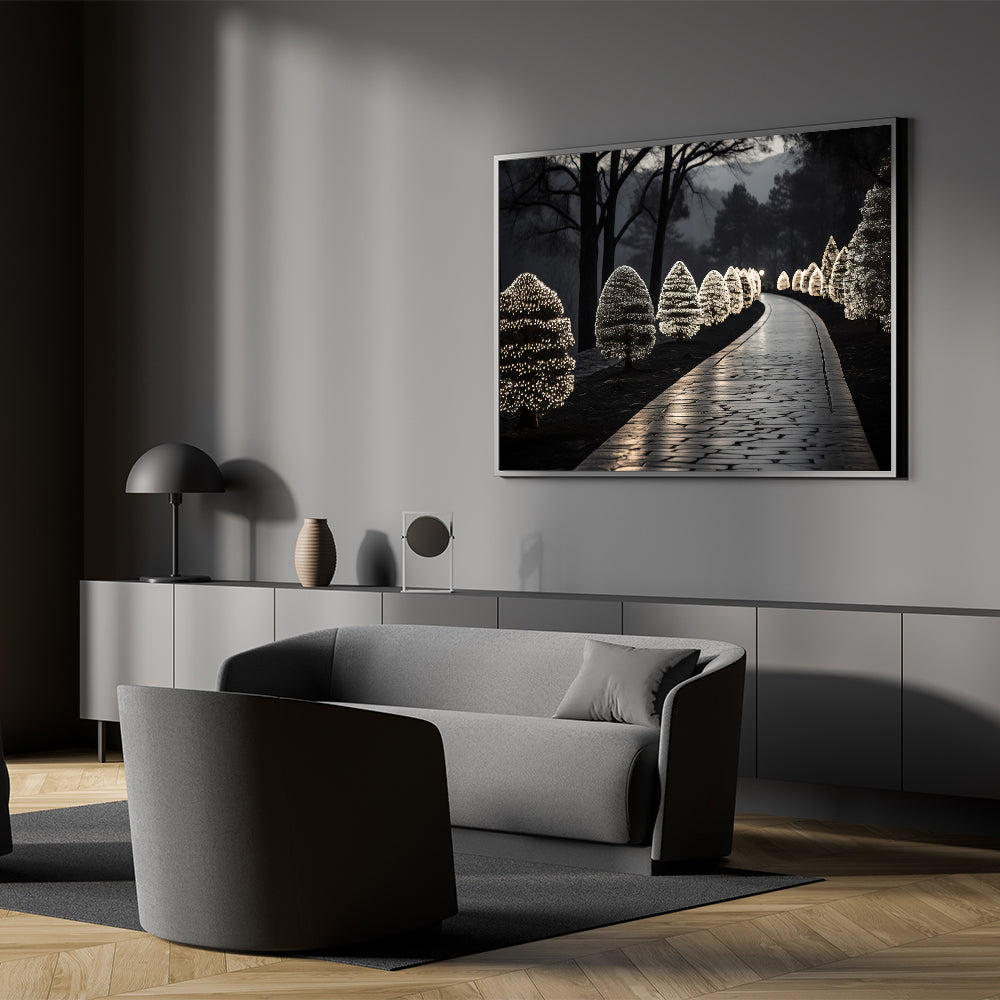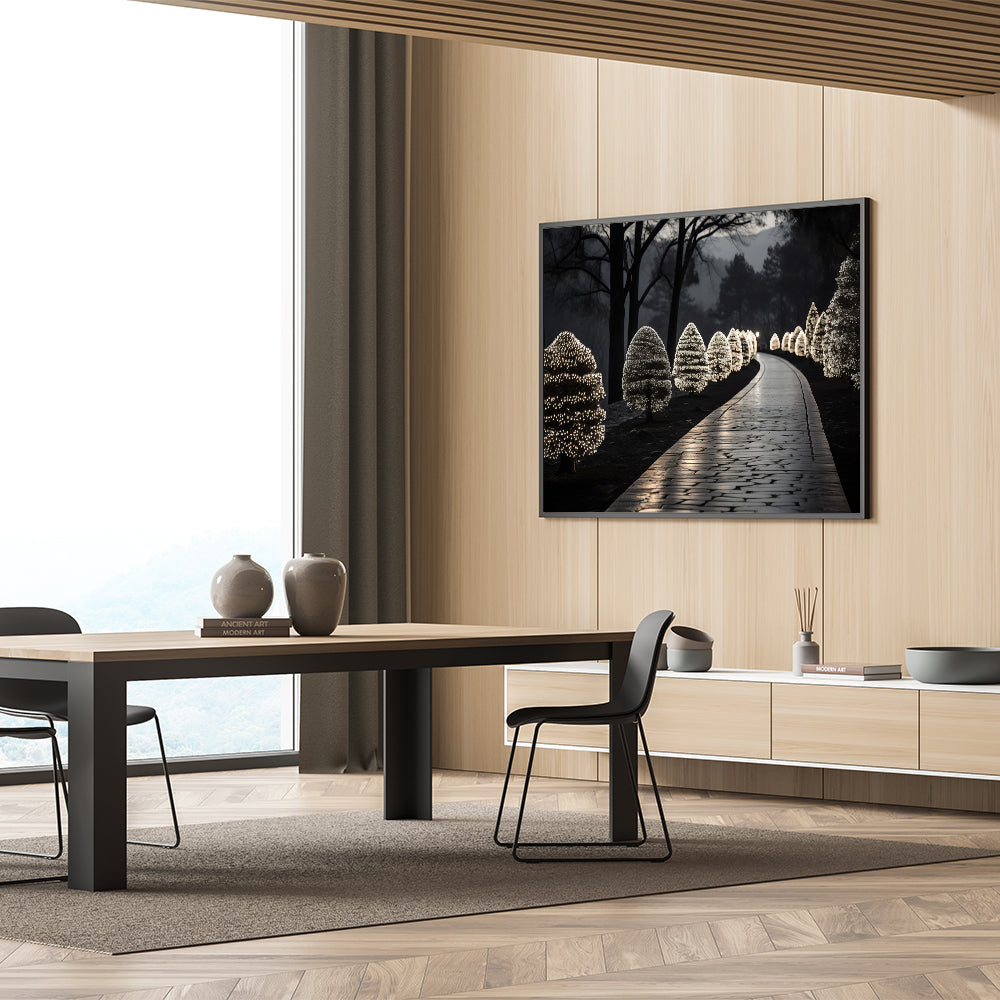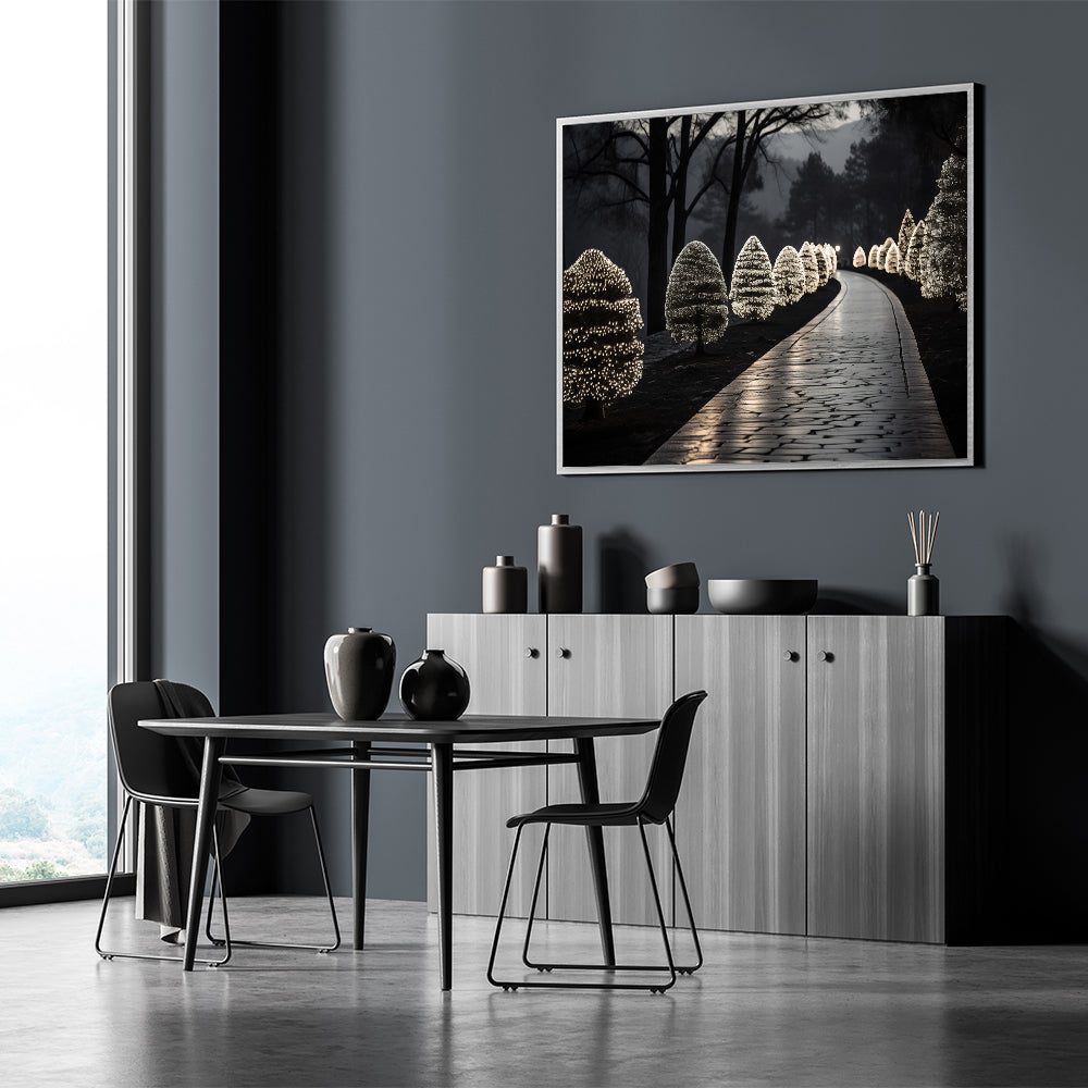 Transform your space with the enchanting beauty of this illuminated tree pathway wall art. This stunning piece captures a serene nightscape, featuring a glowing walkway flanked by brilliantly lit trees. The warm lighting contrasts beautifully against the shadowy background, evoking a sense of tranquility and modern elegance.