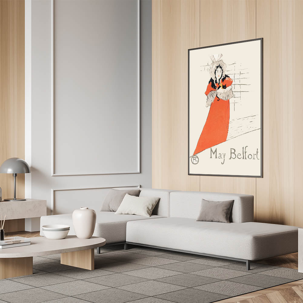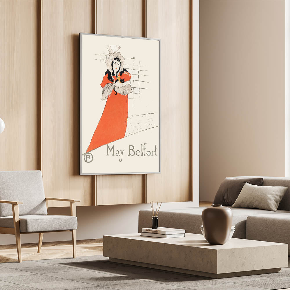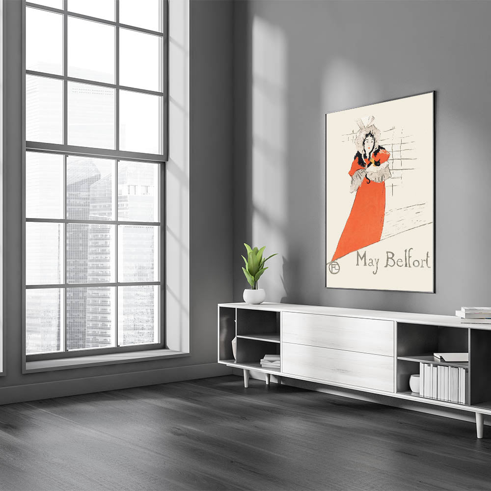 Bring the charm of Parisian nightlife into your home with "May Belfort" by Henri de Toulouse-Lautrec. This iconic poster captures the performer May Belfort in a striking red dress, holding a black cat, embodying the lively and theatrical world of Toulouse-Lautrec’s art. His bold lines and simplified forms highlight the unique character of the subject, making this piece a captivating addition to any space.