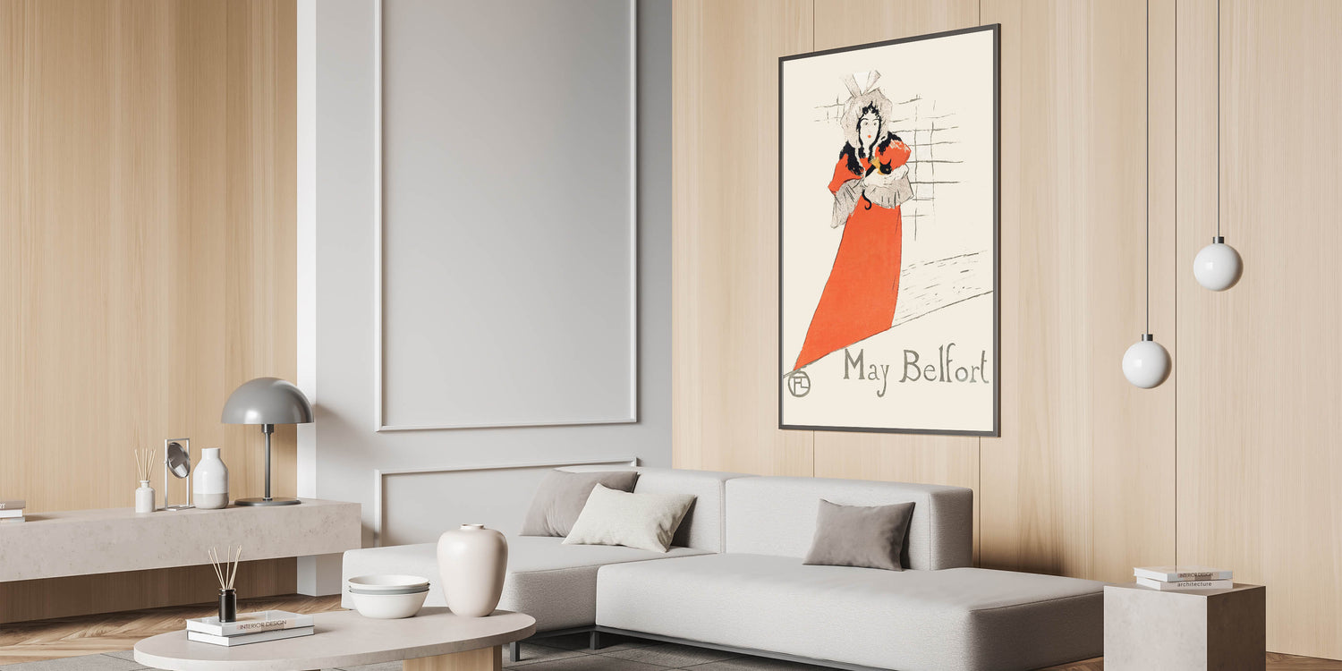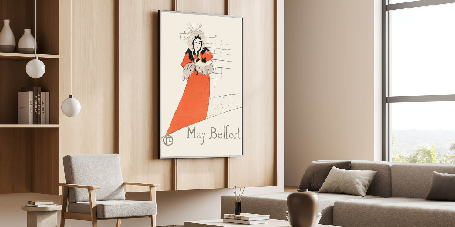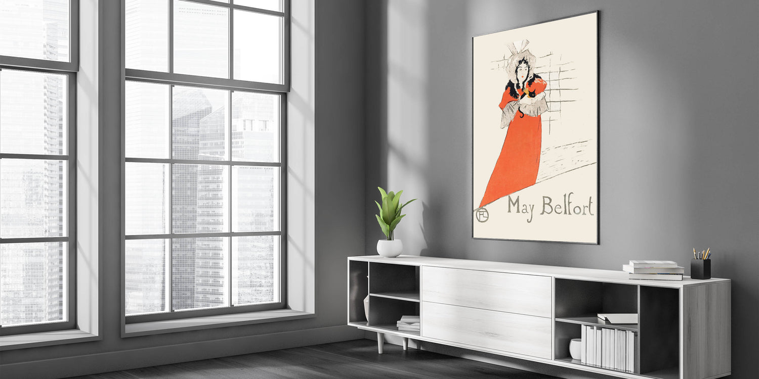 Bring the charm of Parisian nightlife into your home with "May Belfort" by Henri de Toulouse-Lautrec. This iconic poster captures the performer May Belfort in a striking red dress, holding a black cat, embodying the lively and theatrical world of Toulouse-Lautrec’s art. His bold lines and simplified forms highlight the unique character of the subject, making this piece a captivating addition to any space.
