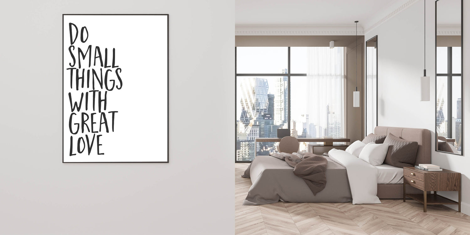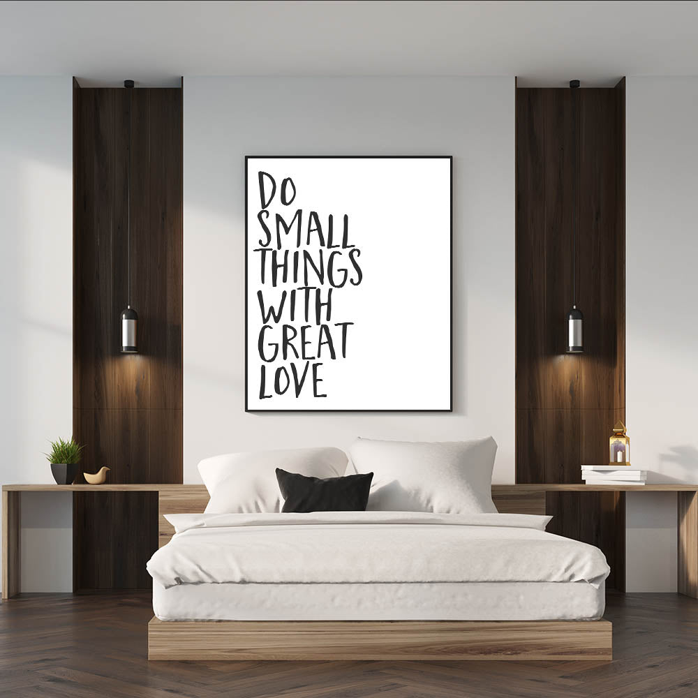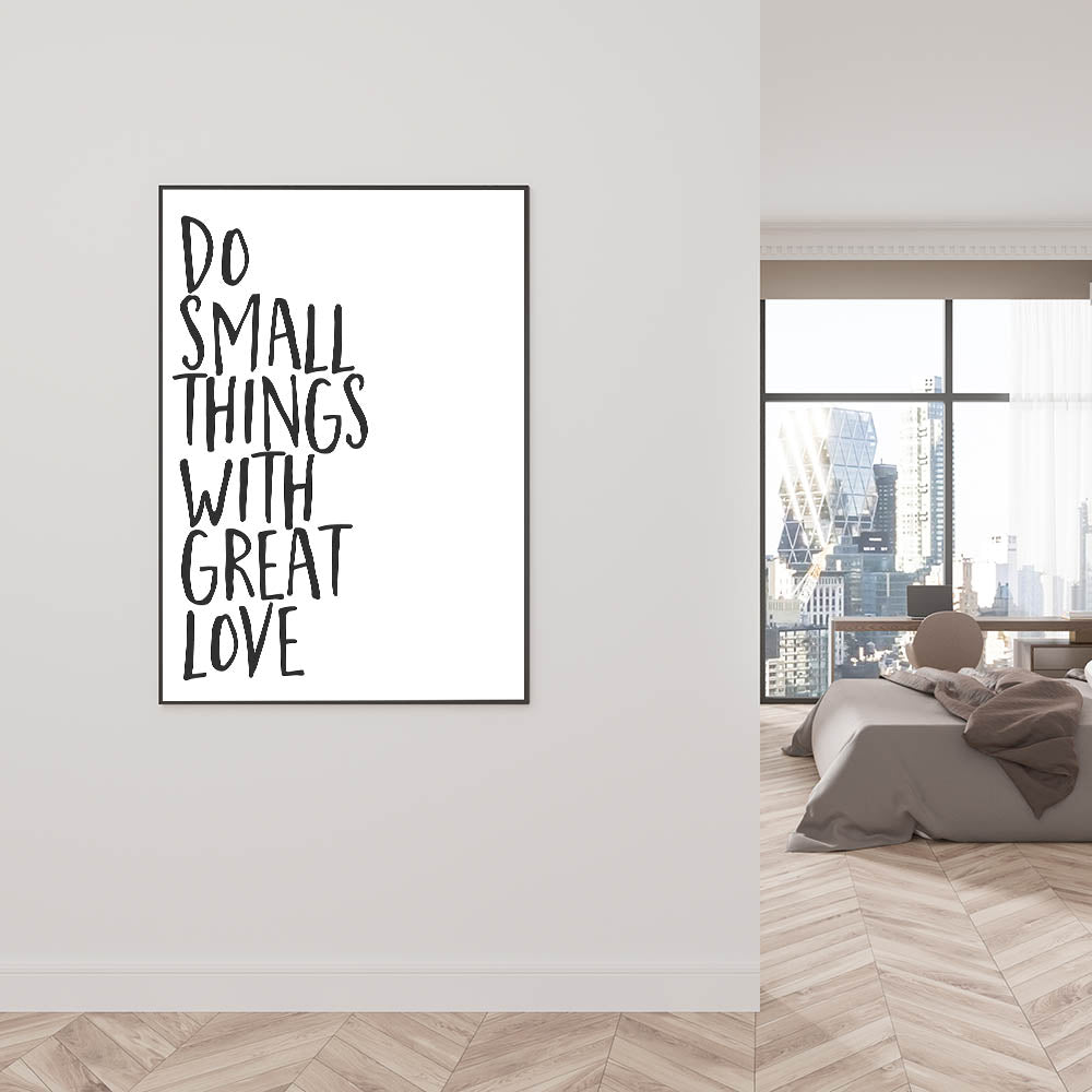 Inspire kindness and positivity with our Inspirational Typography Poster featuring the heartfelt message, "Do Small Things with Great Love." This minimalist black-and-white design uses artistic lettering to convey a powerful reminder for daily life. Its clean lines and neutral tones make it a versatile piece for any room, from living spaces to home offices. Ideal for those who appreciate motivational quote wall art, this print adds both style and meaning to your decor.