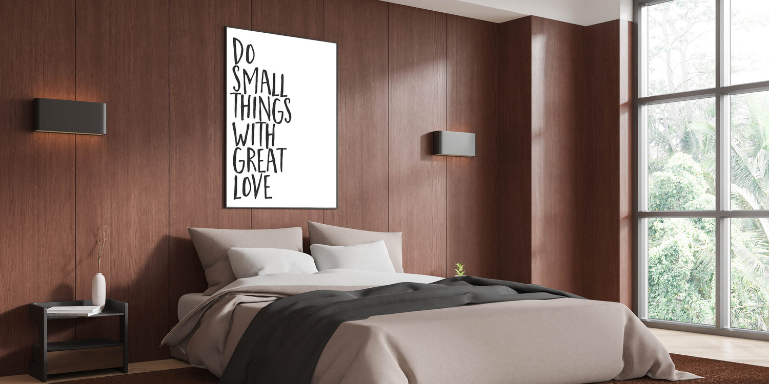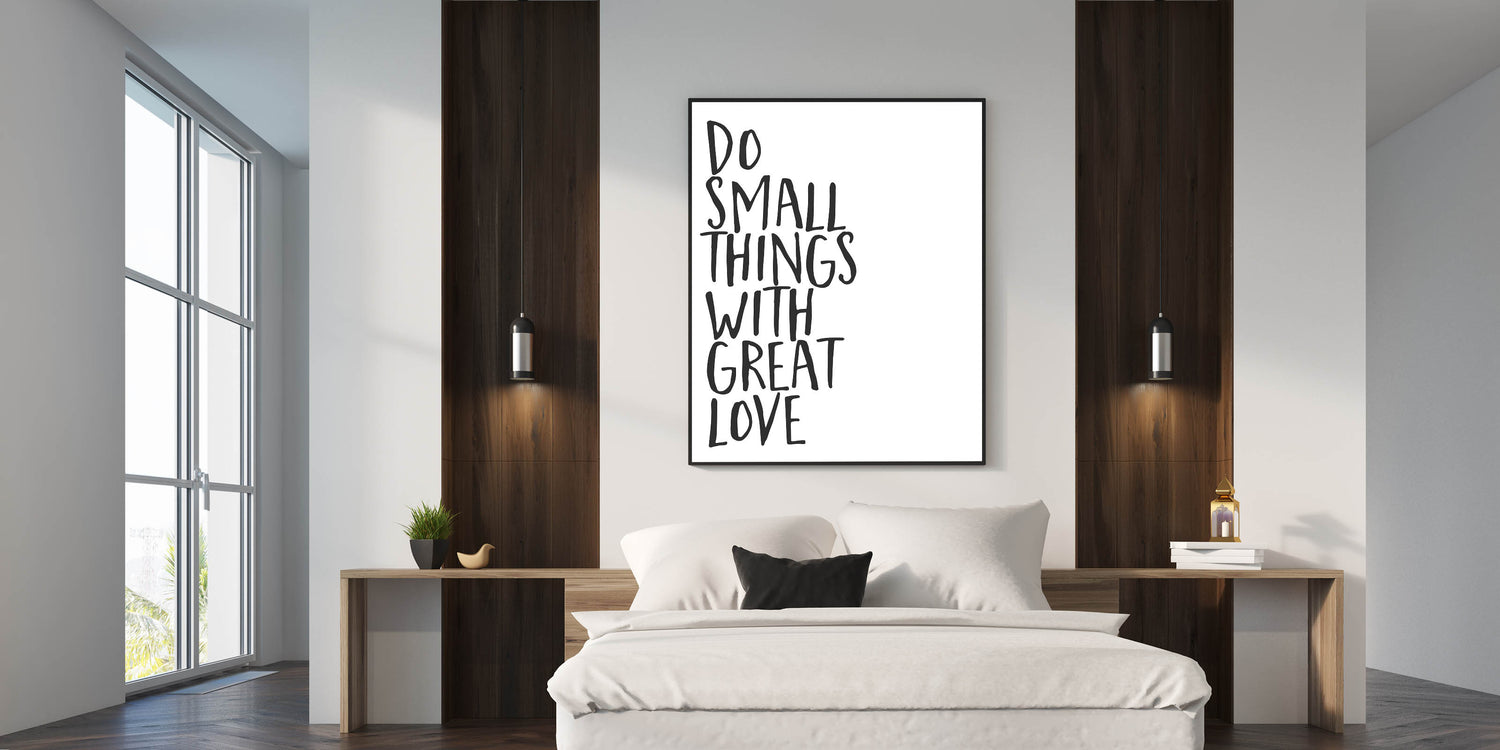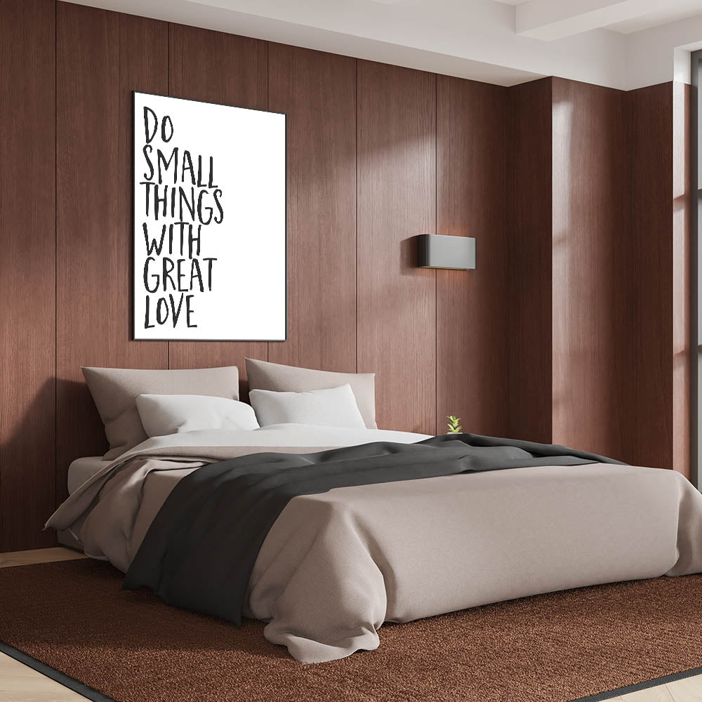 Inspire kindness and positivity with our Inspirational Typography Poster featuring the heartfelt message, "Do Small Things with Great Love." This minimalist black-and-white design uses artistic lettering to convey a powerful reminder for daily life. Its clean lines and neutral tones make it a versatile piece for any room, from living spaces to home offices. Ideal for those who appreciate motivational quote wall art, this print adds both style and meaning to your decor.