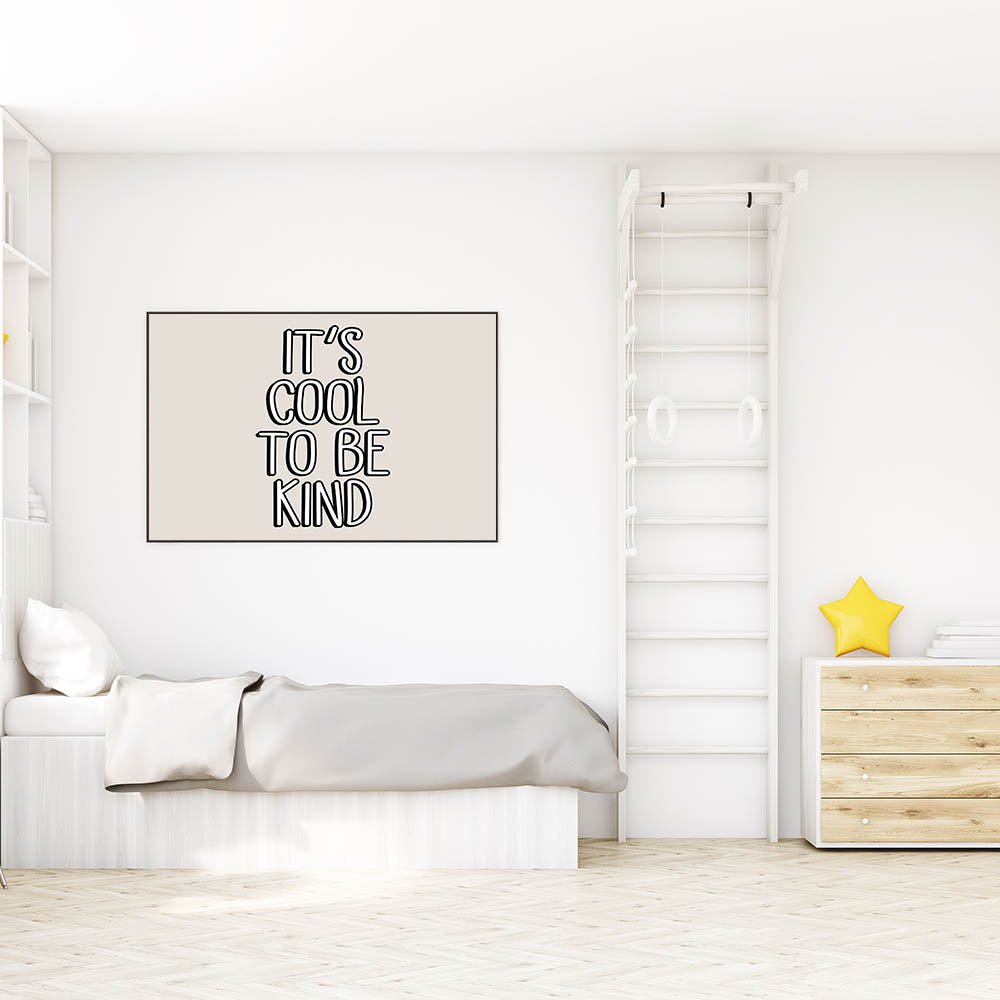 Promote kindness and positivity in your child's space with this modern typography wall art, featuring the uplifting phrase "IT'S COOL TO BE KIND." The simple yet stylish design, with bold black-and-white lettering on a neutral beige background, makes it a perfect decor piece for boys' bedrooms, nurseries, and playrooms.