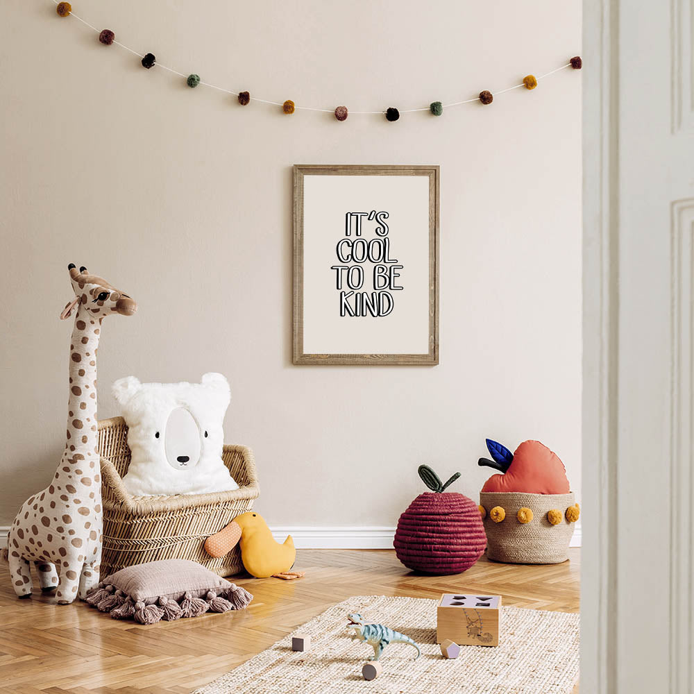 Encourage kindness and positivity with this It's Cool to Be Kind wall art, a stylish and uplifting addition to any boys' bedroom, playroom, or nursery. Featuring bold black typography on a warm beige background, this modern and motivational design serves as a daily reminder to spread kindness and joy. Perfect for parents who want to create an inspiring space, this artwork complements minimalist, boho, and modern interiors.