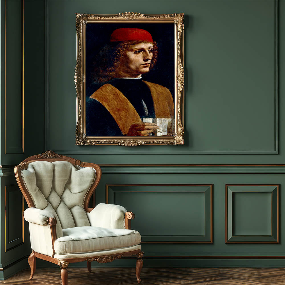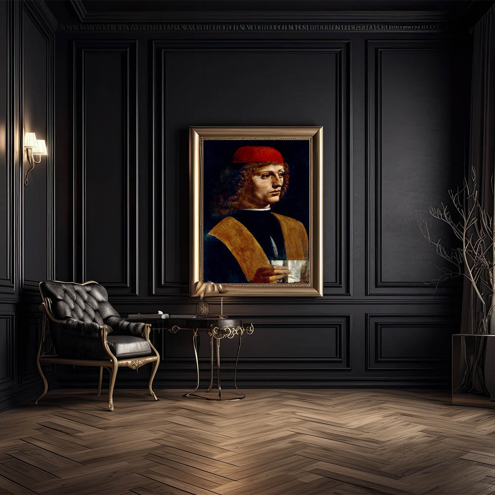 Celebrate the genius of Leonardo da Vinci with the "Portrait of a Musician", one of his most intriguing Renaissance masterpieces. This captivating artwork features a young man, presumed to be a musician, holding a sheet of music while gazing contemplatively into the distance. The rich contrast between the musician's bright red cap and dark background exemplifies Leonardo's mastery of chiaroscuro, making this painting a timeless symbol of artistic brilliance.