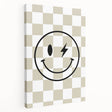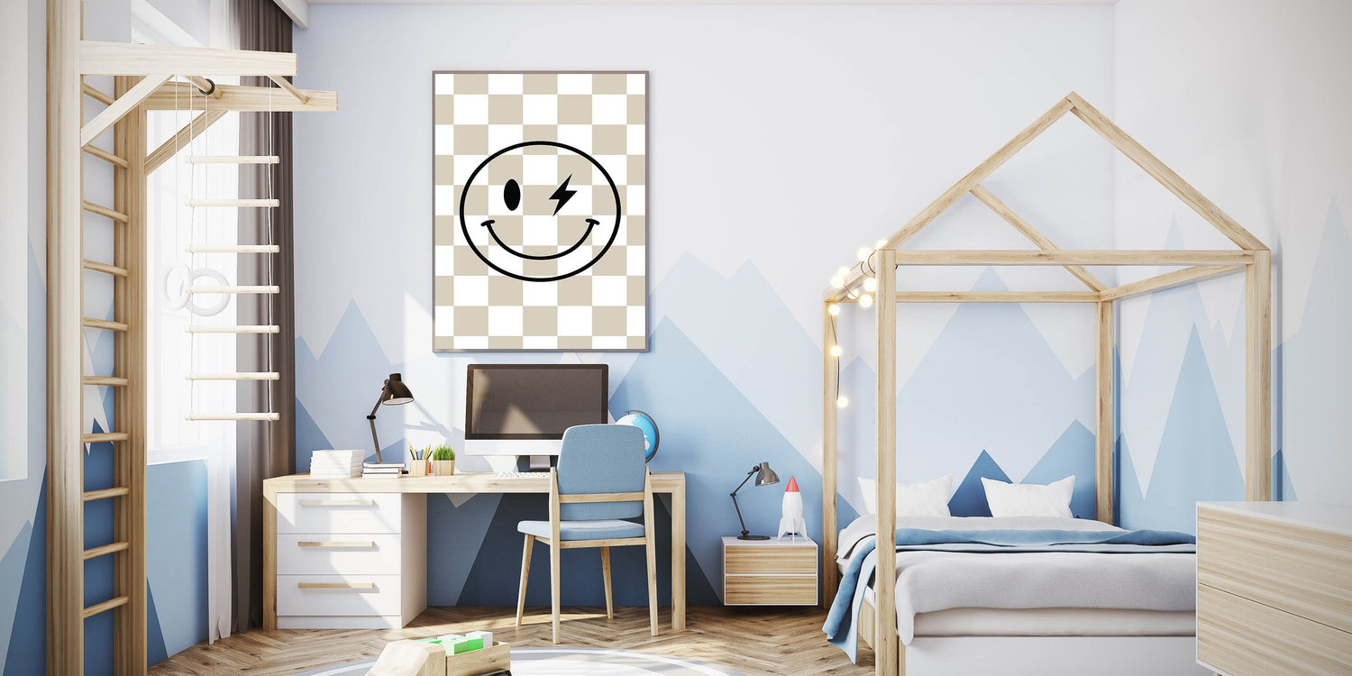Add a fun and edgy touch to your child’s space with this modern lightning smiley face wall art. Featuring a bold black smiley with a lightning bolt eye over a stylish beige-and-white checkered background, this artwork blends retro and modern aesthetics to create a playful and cool decor piece for boys' bedrooms, nurseries, or playrooms.