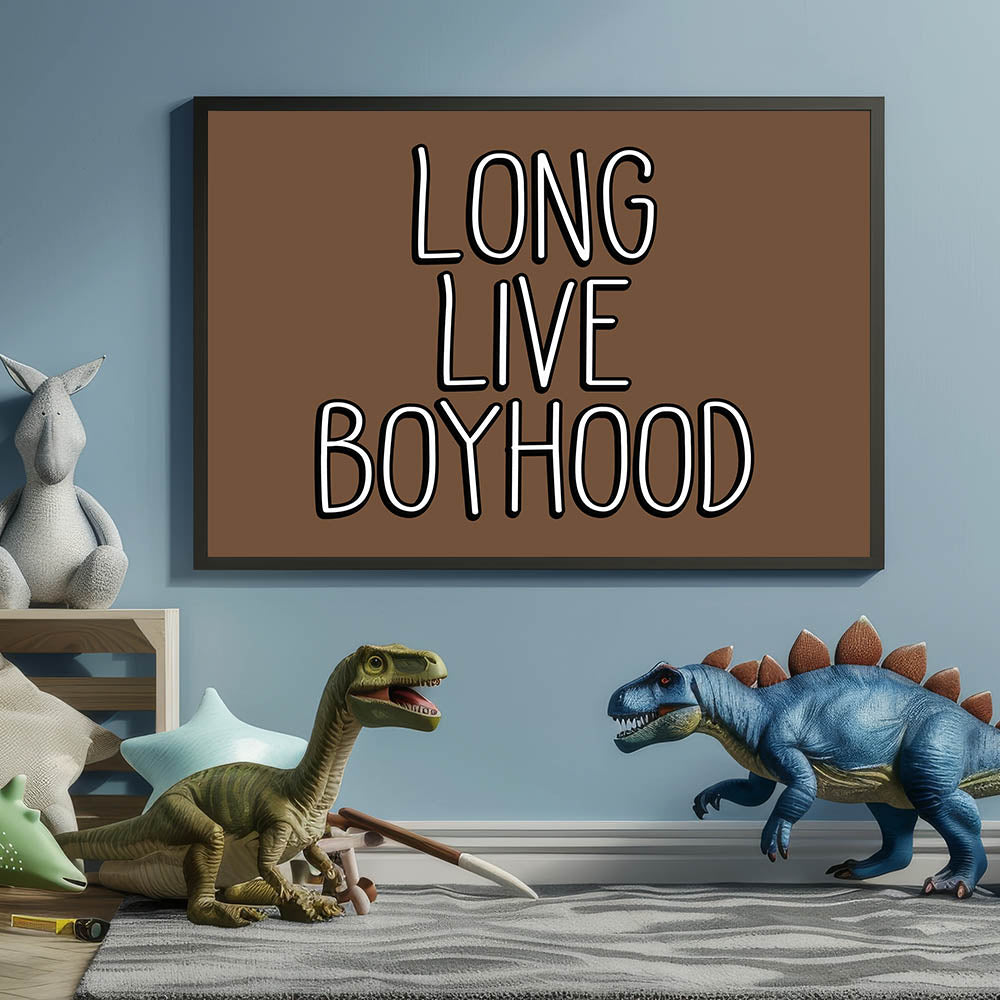 Celebrate the joy and adventure of childhood with this bold and inspiring typography wall art, featuring the phrase "LONG LIVE BOYHOOD." Designed with a rich brown background and bold black-and-white lettering, this piece adds warmth and character to any boys' bedroom, nursery, or playroom. The minimalist yet expressive design blends well with a variety of interior styles, from modern to rustic decor.