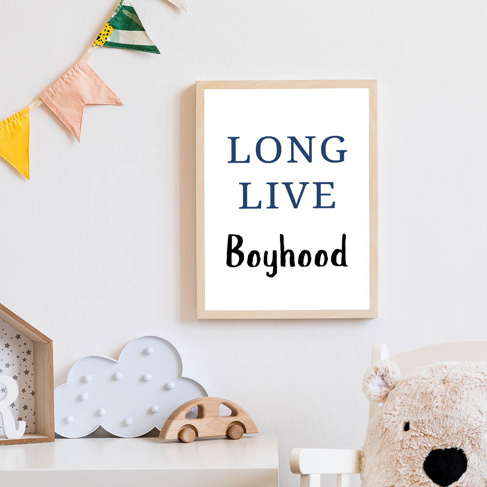 Celebrate the energy and adventure of childhood with this Long Live Boyhood wall art print! Featuring a bold navy blue and black typography design on a crisp white background, this artwork is a stylish yet meaningful addition to any boys' bedroom, nursery, or playroom. The mix of classic serif and playful handwritten fonts creates a timeless look that captures the spirit of youth, imagination, and freedom.