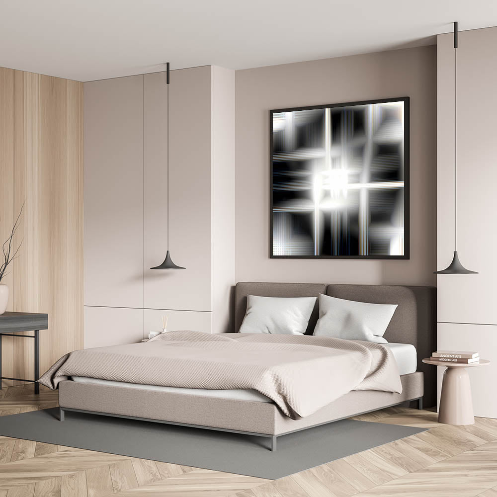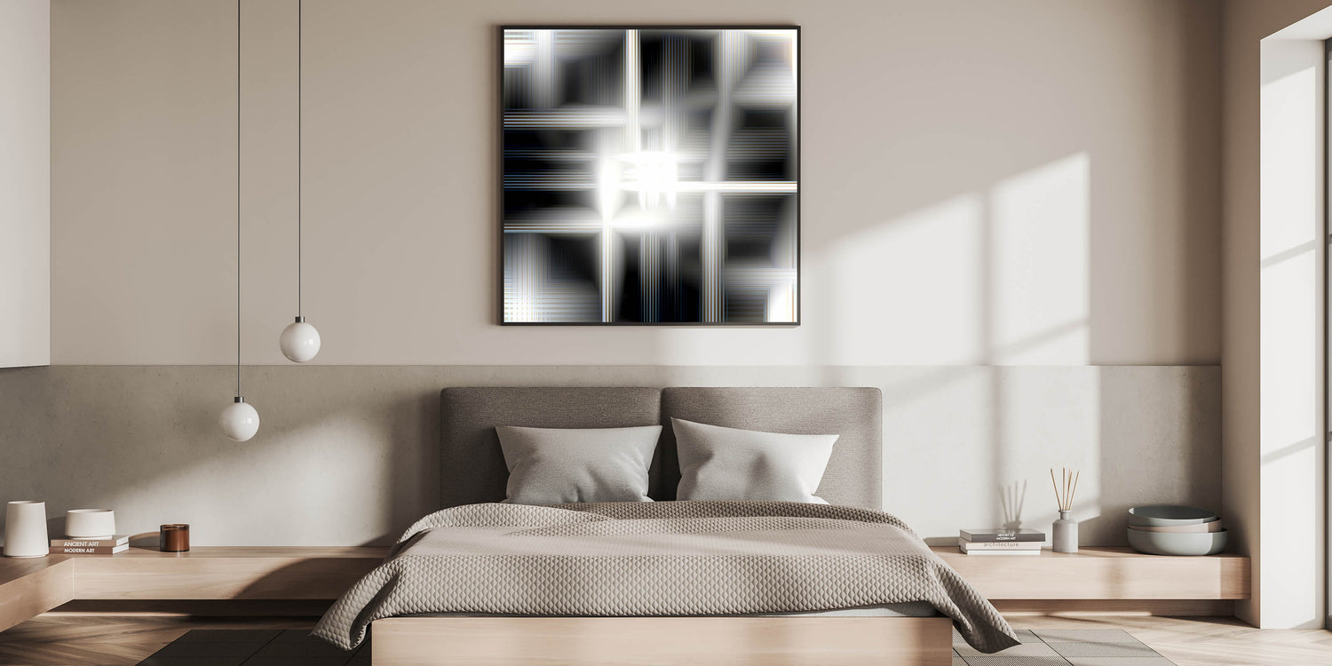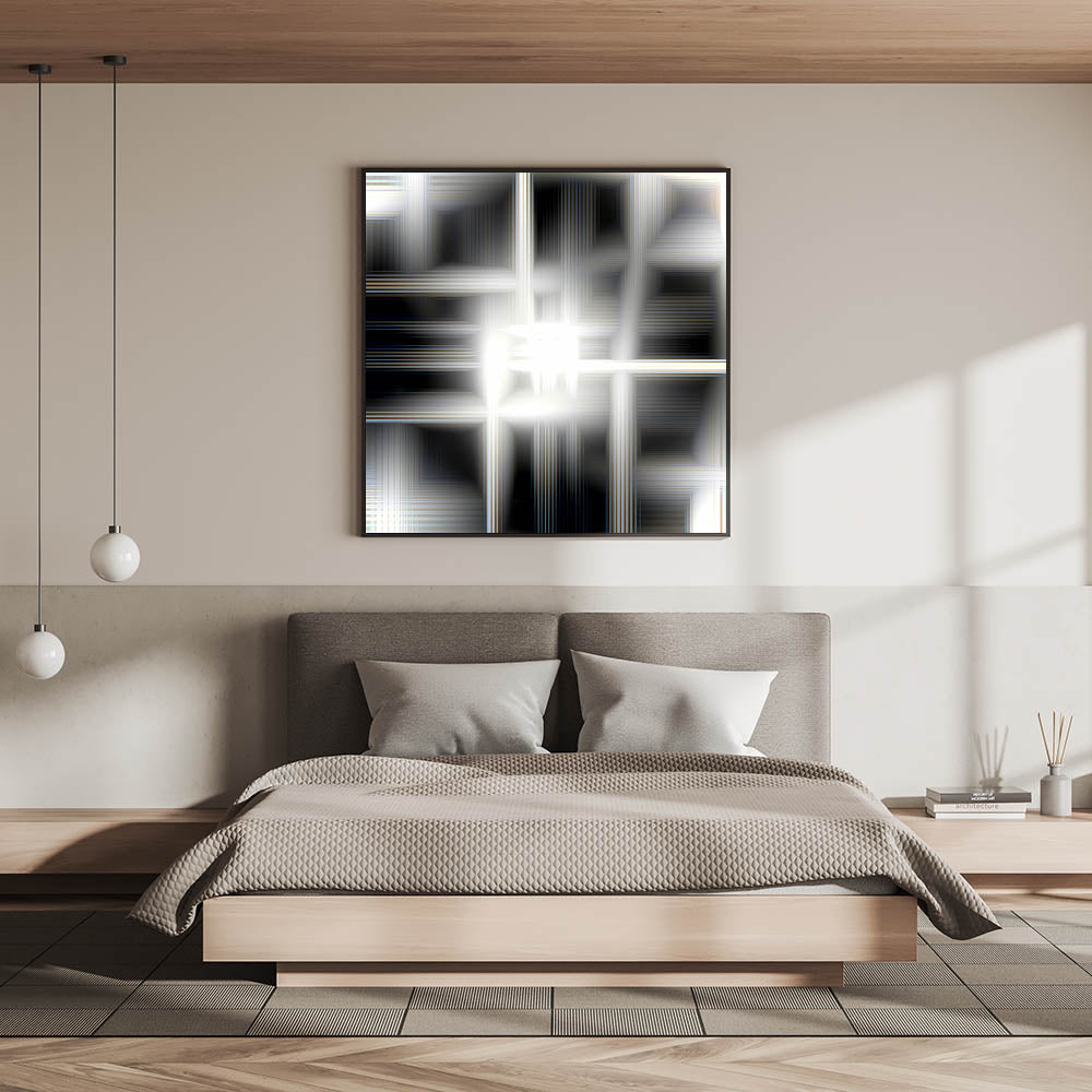 Add a touch of futuristic elegance to your bedroom with this modern luminous abstract wall art. The mesmerizing blend of black, white, and silver tones creates a glowing effect, making it a sophisticated statement piece for contemporary interiors. Whether displayed as a stretched canvas, framed bedroom art, acrylic glass, or rolled print, this customizable bedroom wall art is perfect for enhancing a stylish and refined space.