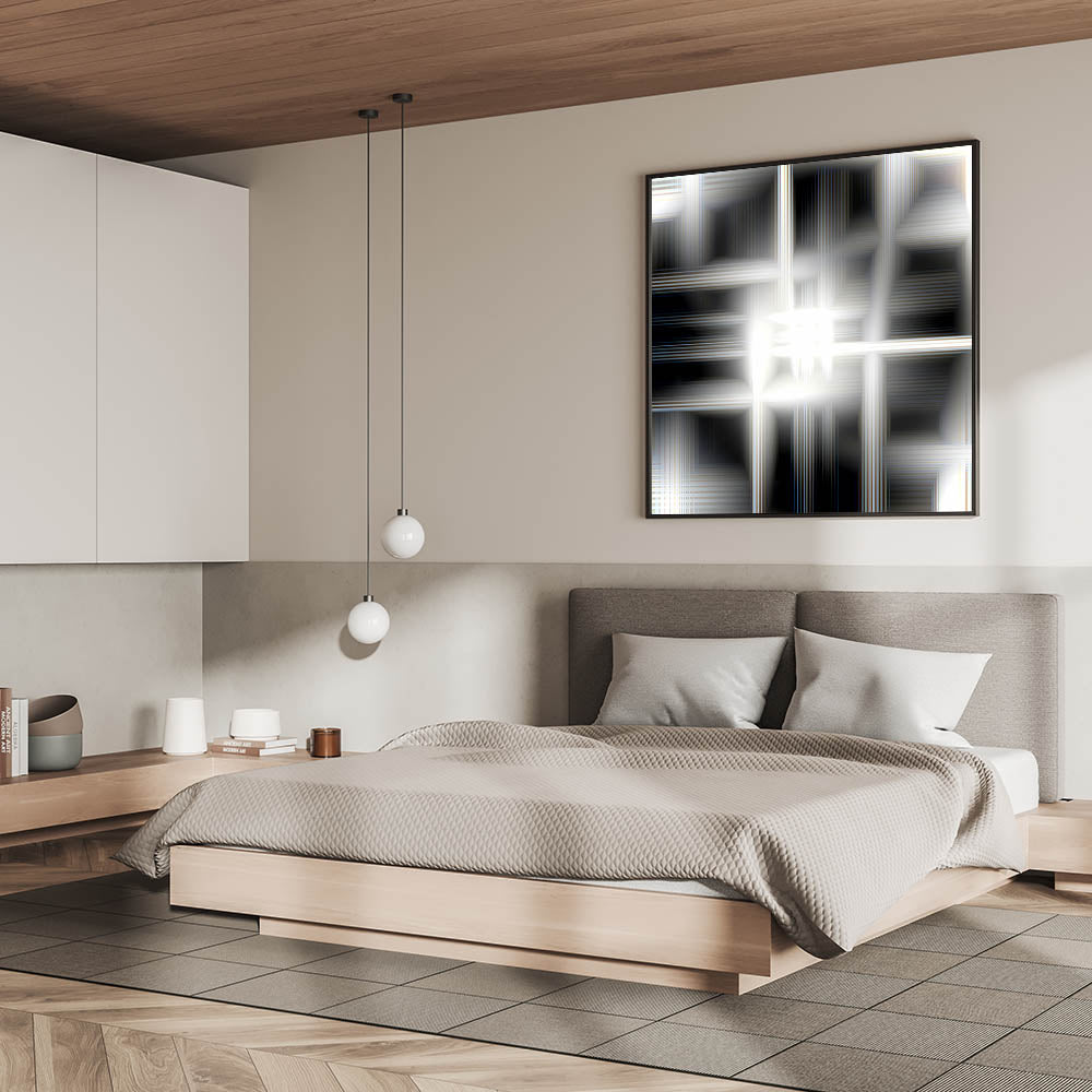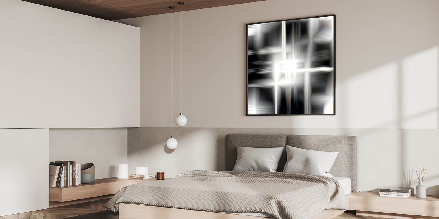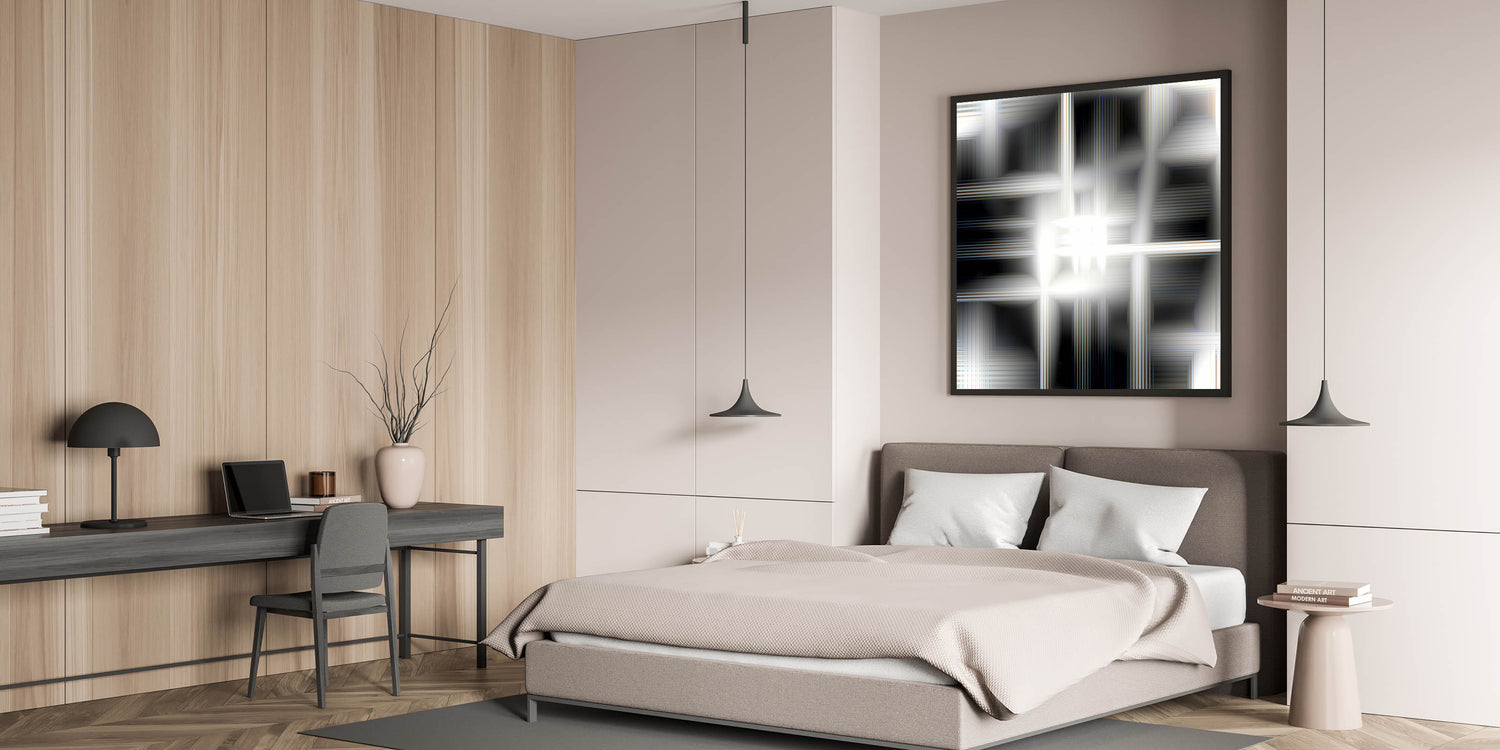 Add a touch of futuristic elegance to your bedroom with this modern luminous abstract wall art. The mesmerizing blend of black, white, and silver tones creates a glowing effect, making it a sophisticated statement piece for contemporary interiors. Whether displayed as a stretched canvas, framed bedroom art, acrylic glass, or rolled print, this customizable bedroom wall art is perfect for enhancing a stylish and refined space.