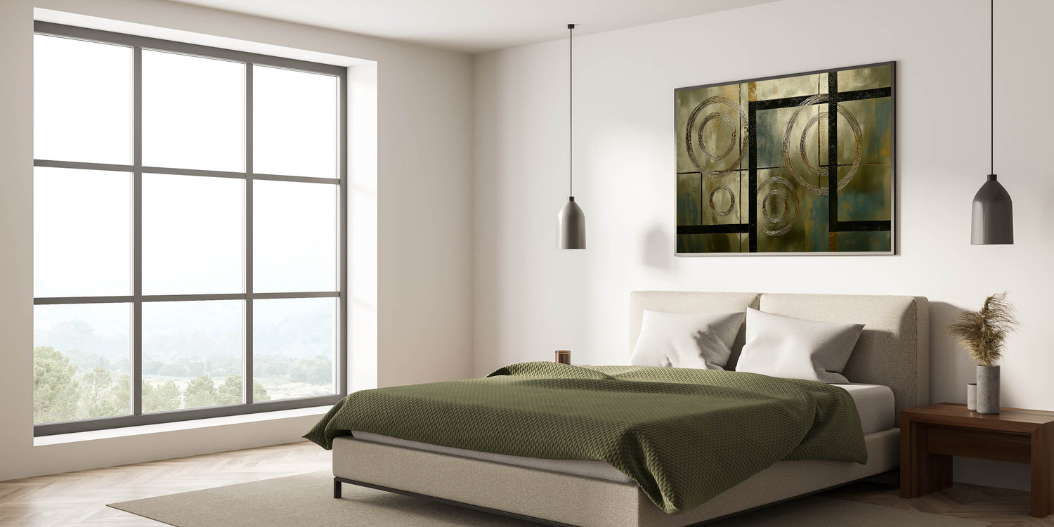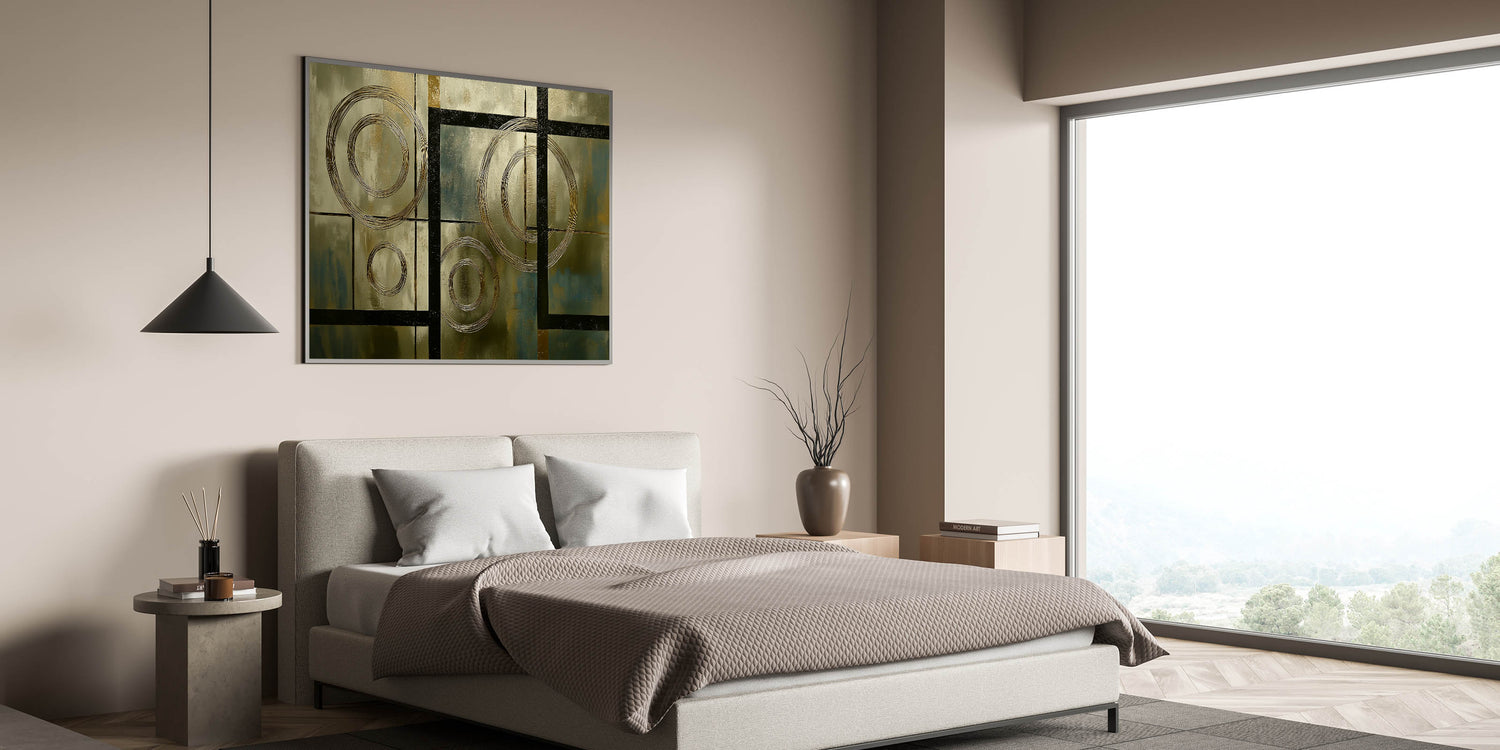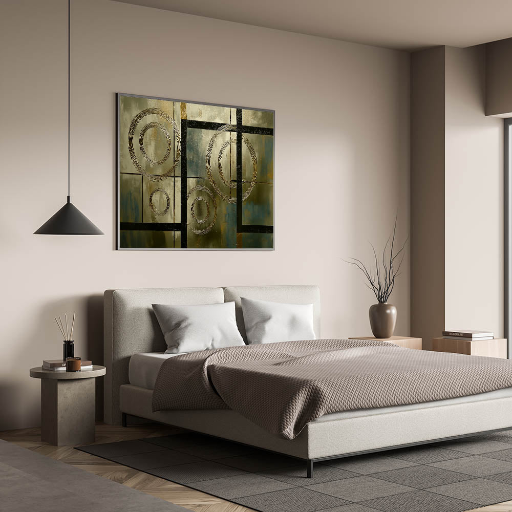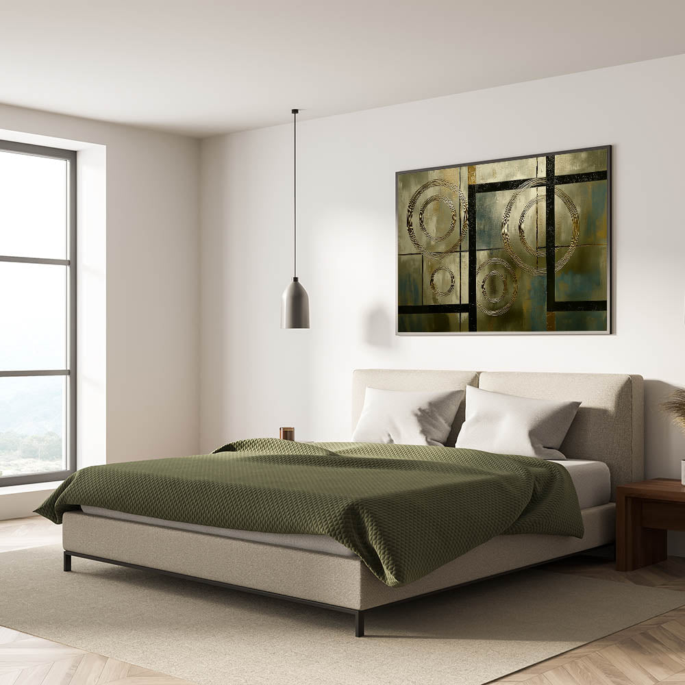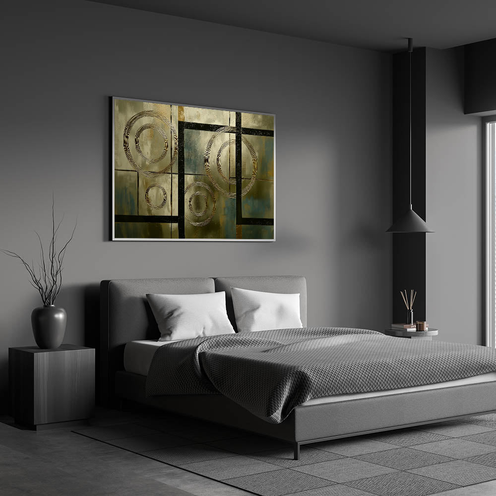Elevate your bedroom with this luxury geometric bedroom wall art, featuring an elegant composition of gold, black, and deep green hues. The intricate circular patterns and bold intersecting lines create a sophisticated and contemporary design, making this piece perfect for modern and upscale interiors. This customizable bedroom wall art blends rich metallic tones with structured geometric elements, bringing depth and refinement to any space.