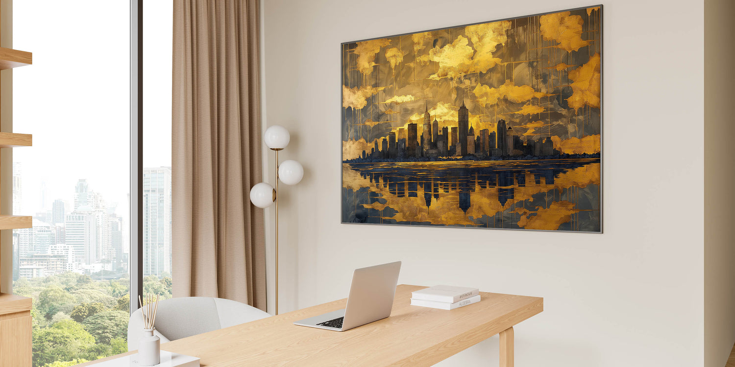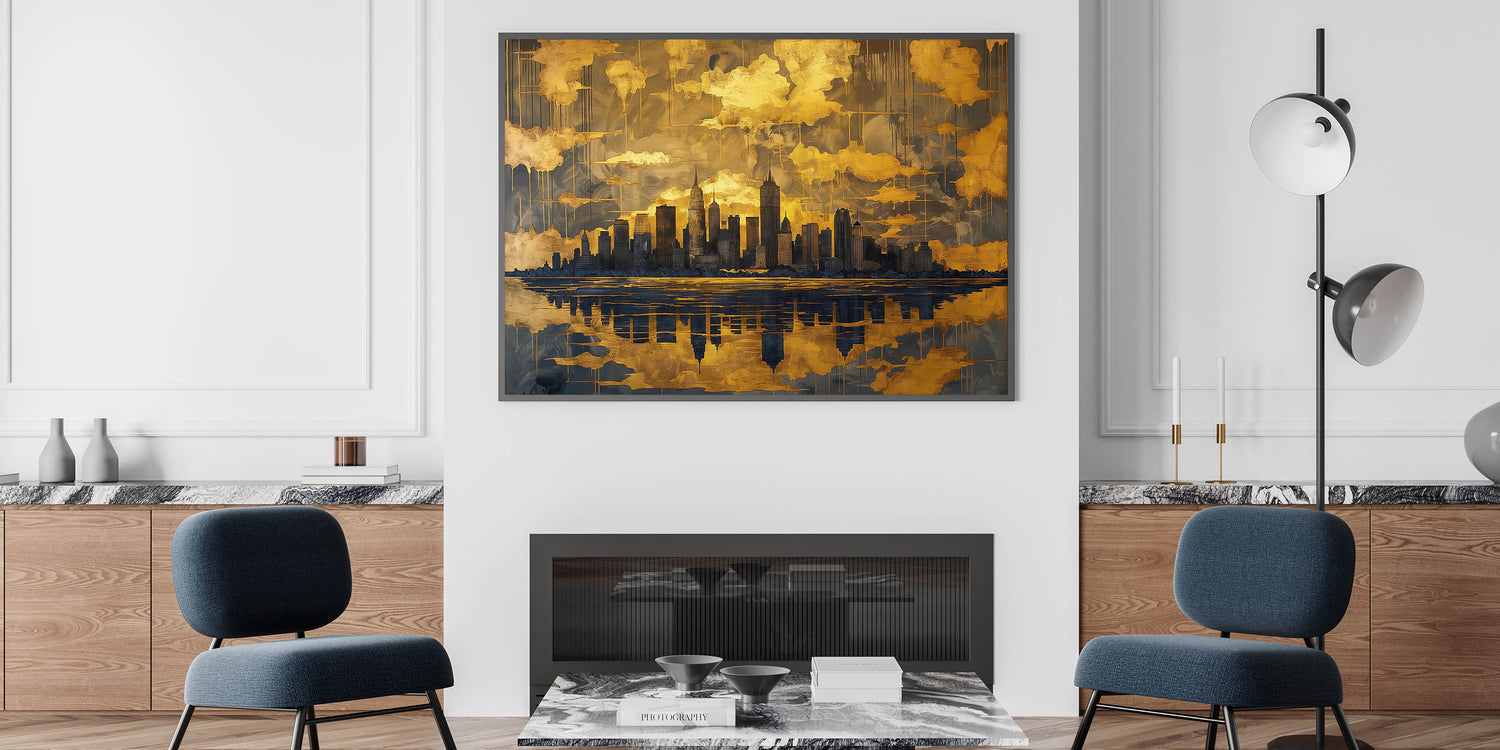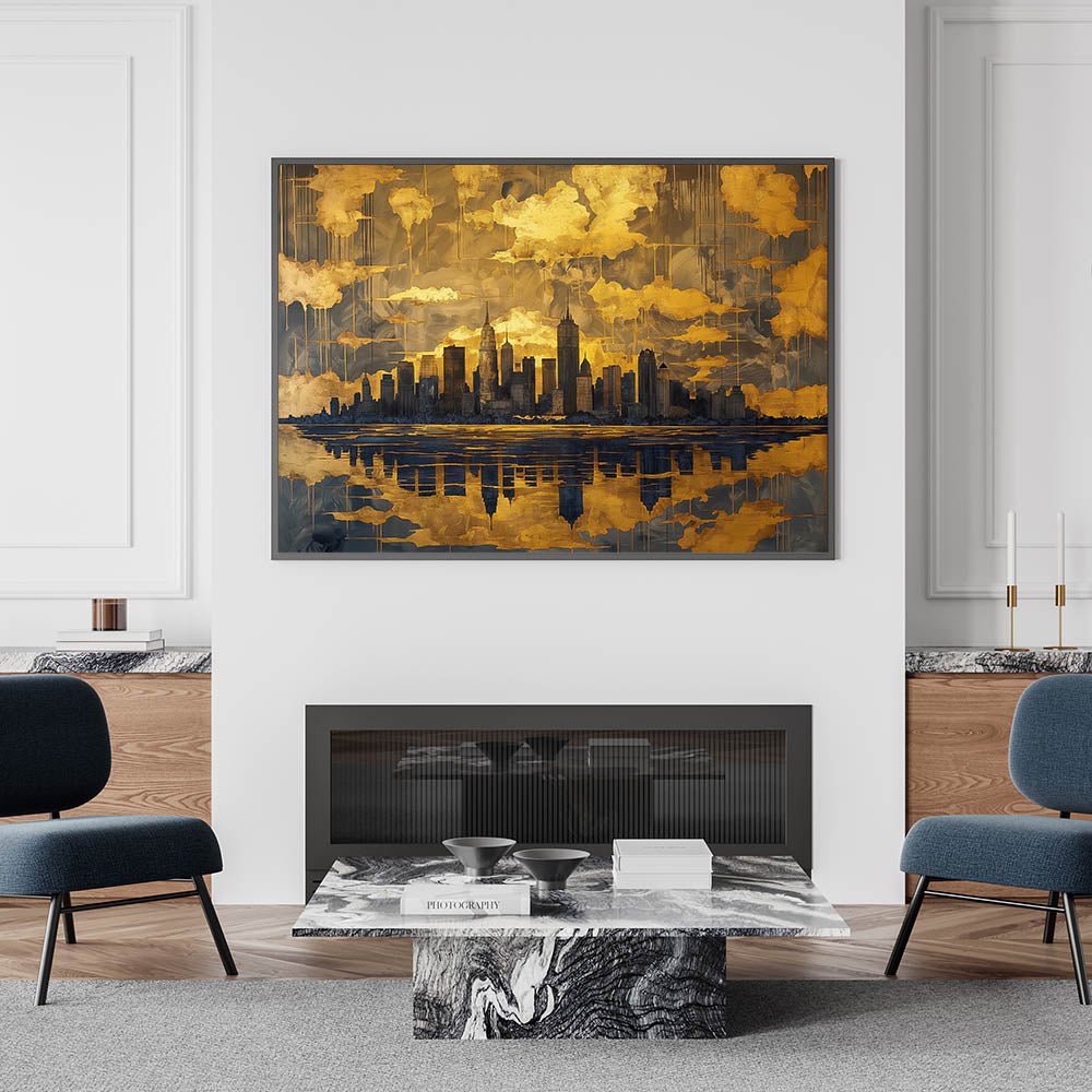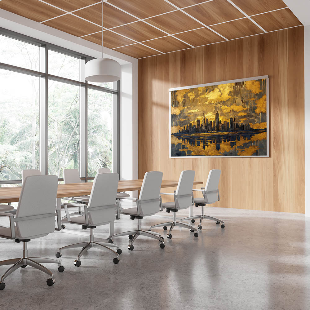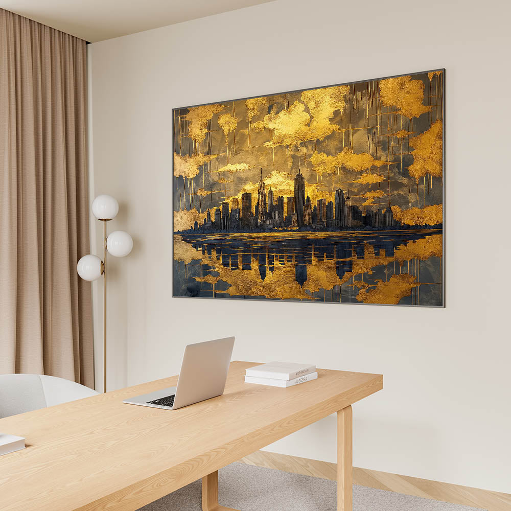 Transform your office space with this luxurious office wall art, featuring a striking skyline design in gold and black tones. This modern office art adds an elegant touch to any professional setting, making it a perfect choice for corporate wall décor. The intricate details and reflective elements create a stunning visual effect, enhancing the ambiance of executive offices, conference rooms, and contemporary workspaces.