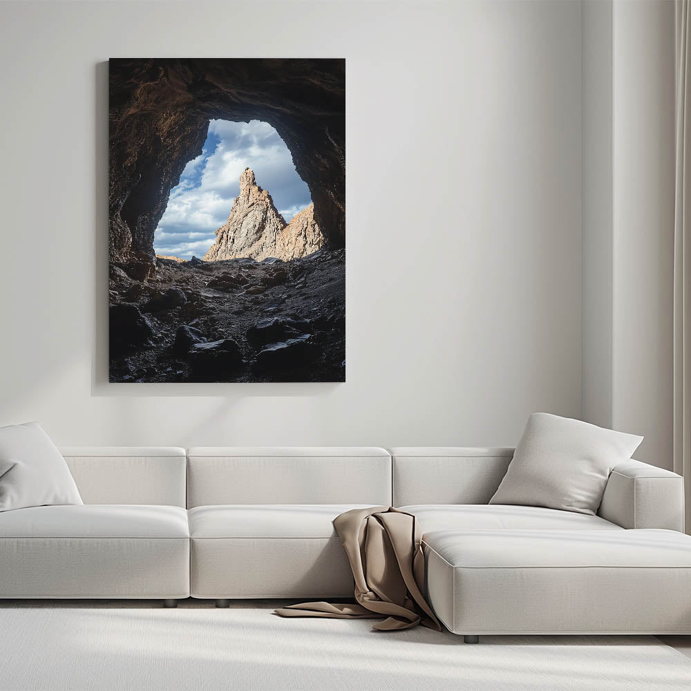 Transform your space with this captivating cave wall art featuring a stunning view of a majestic rock formation framed by the rugged entrance of a cave. The contrast of the dark cave interior with the bright, dramatic sky and sunlit rock creates a visually striking composition that brings nature’s grandeur into your home.