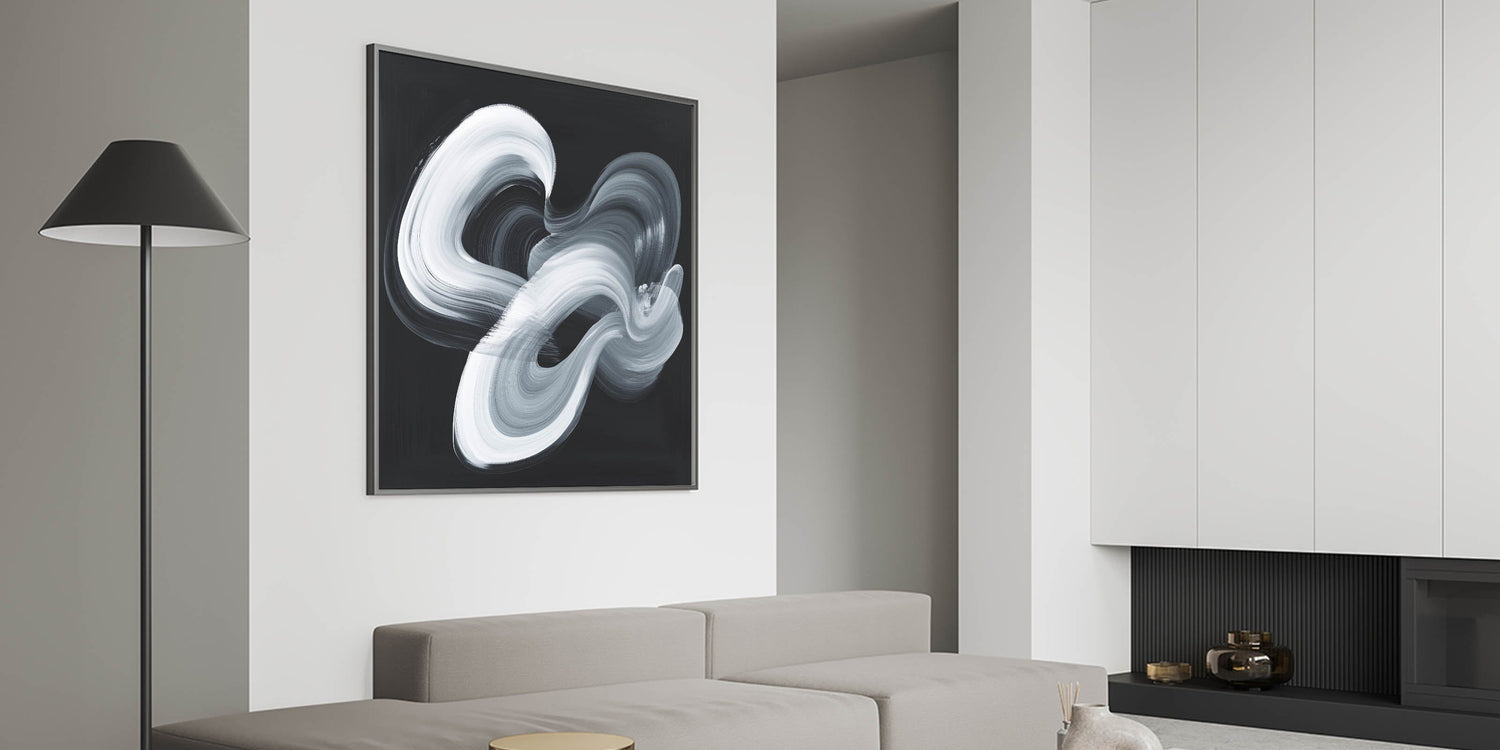 Add dramatic contrast and motion to your space with this minimalist abstract wall art, where bold white and light gray brushstrokes flow powerfully across a deep black backdrop. The artwork embraces a modern monochrome aesthetic, perfect for sleek, contemporary interiors.