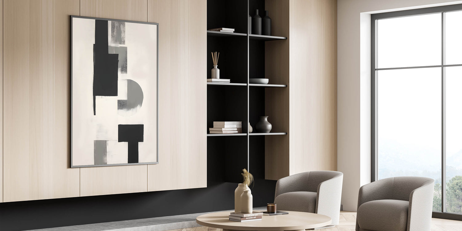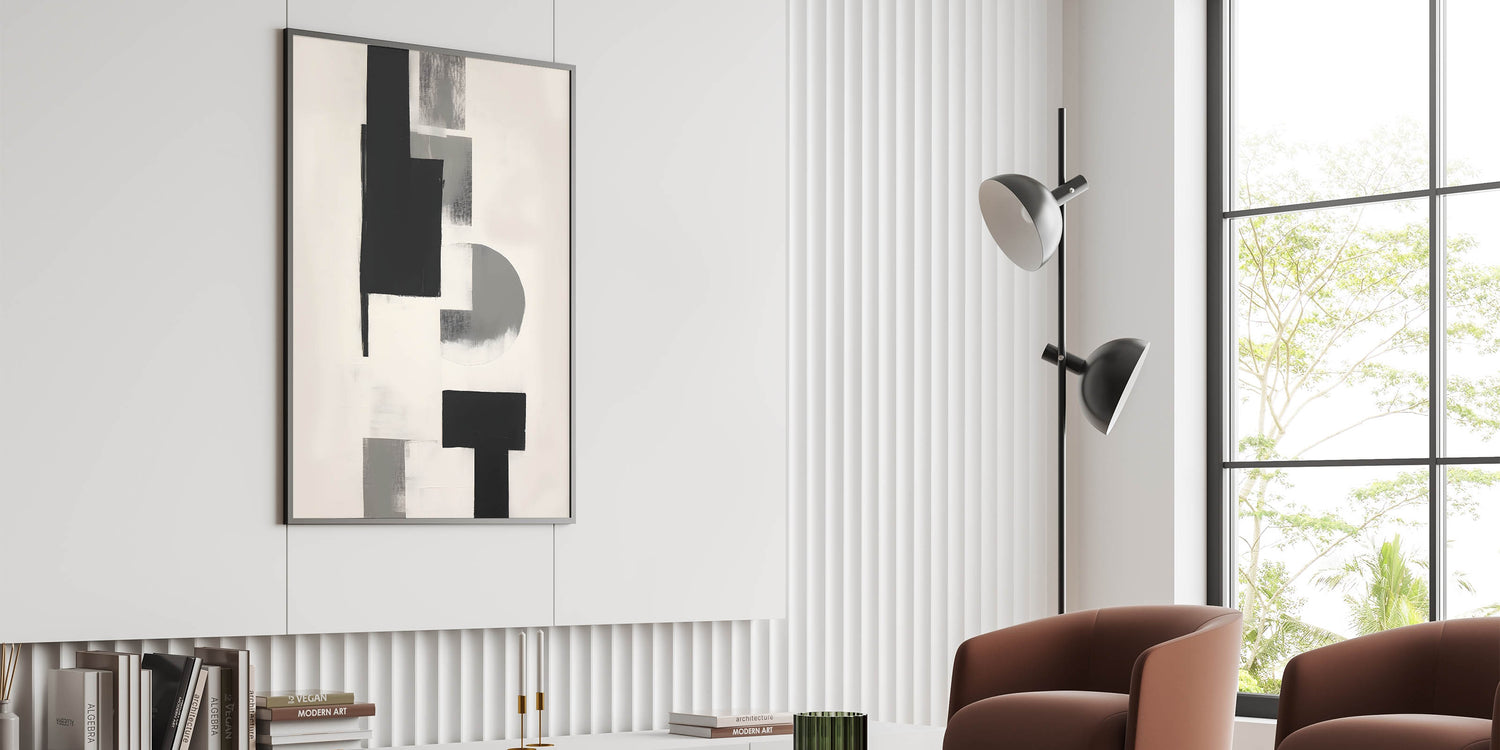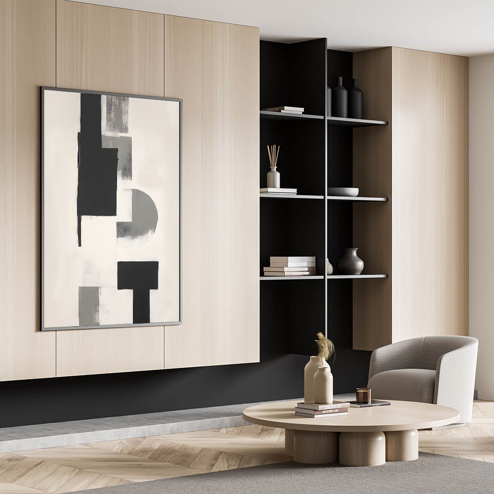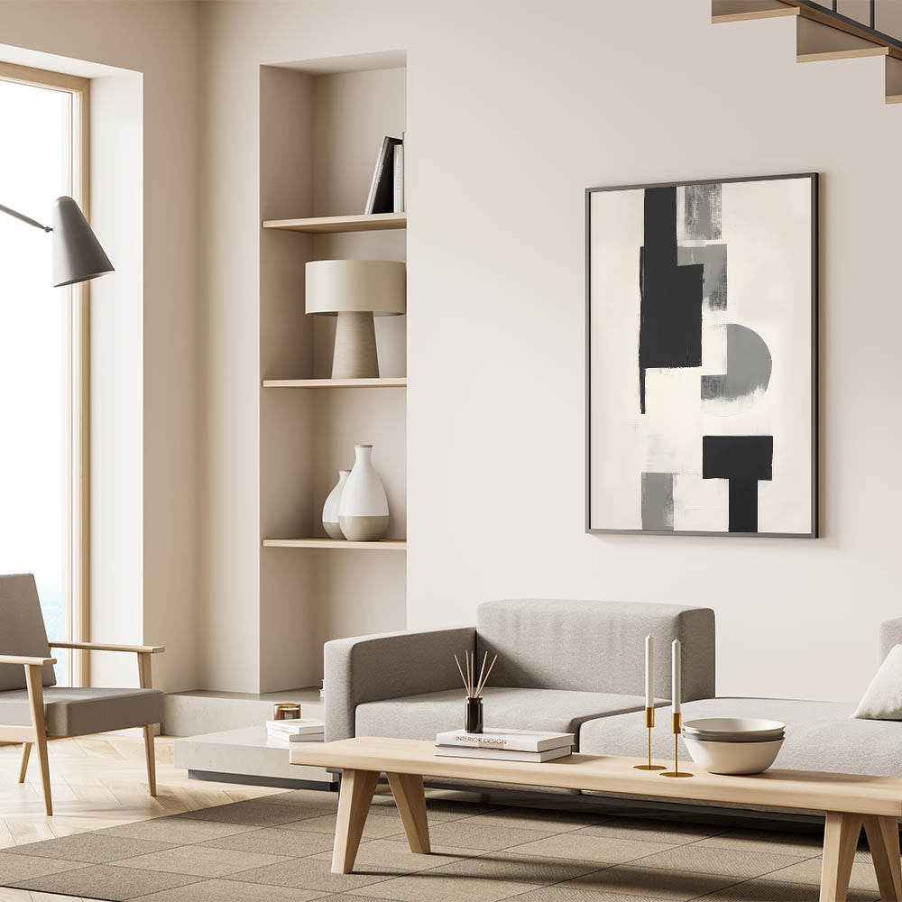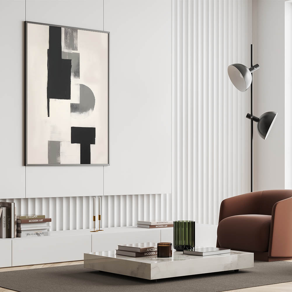This minimalist geometric art piece is an elegant addition to any space, bringing a modern edge with its sleek, structured forms. Perfect for those who appreciate simple yet impactful designs.
