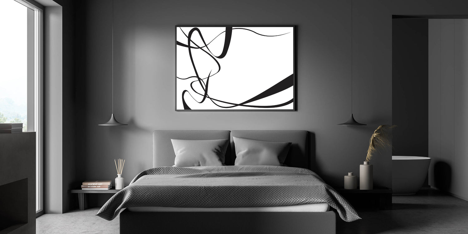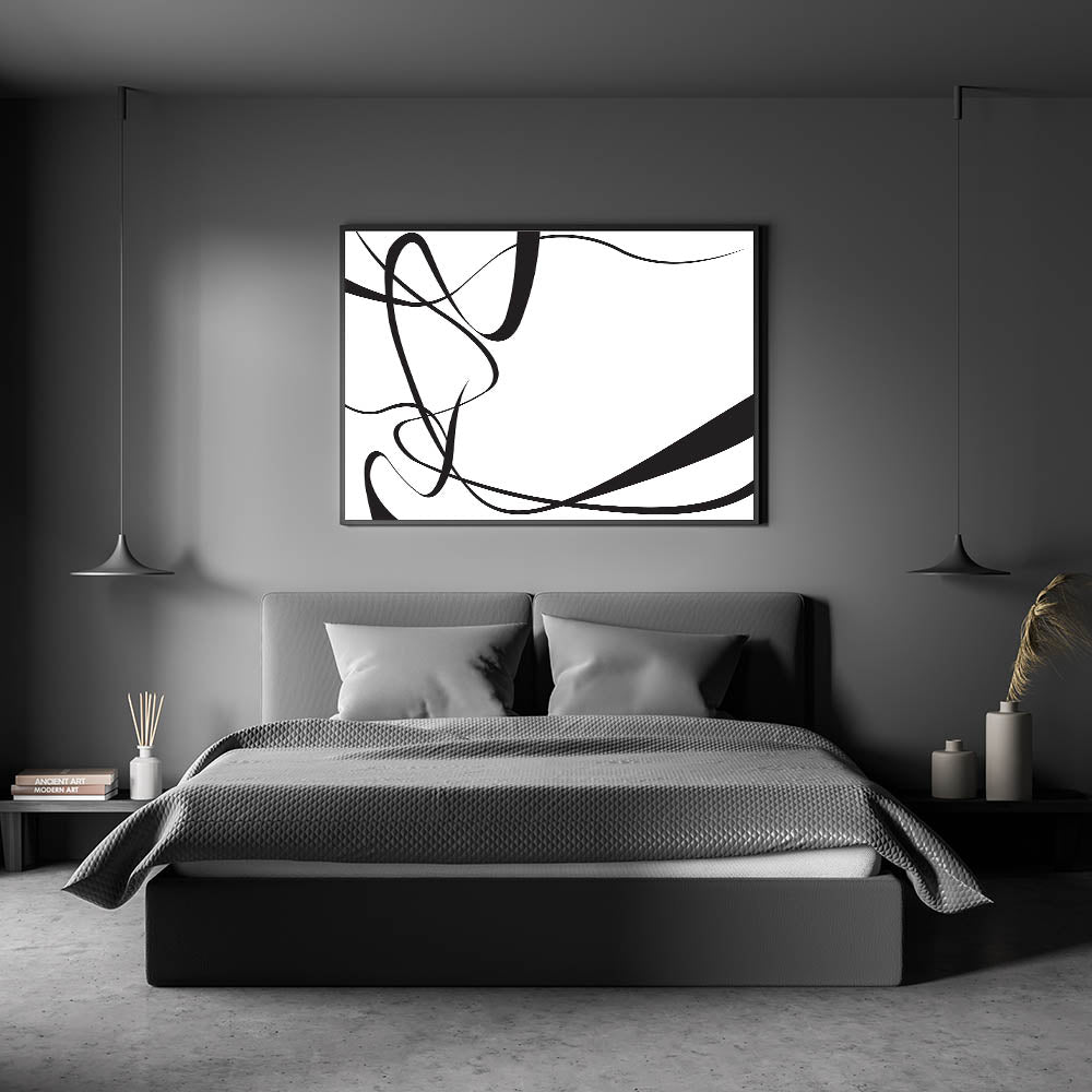 Enhance your bedroom with this minimalist black and white line art, designed for those who appreciate elegant simplicity. The fluid, abstract strokes create a sophisticated and modern aesthetic, making it a perfect choice for contemporary bedroom decor.