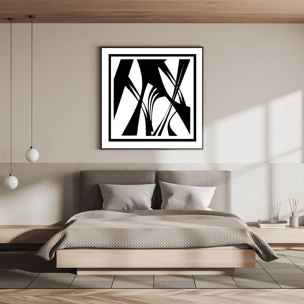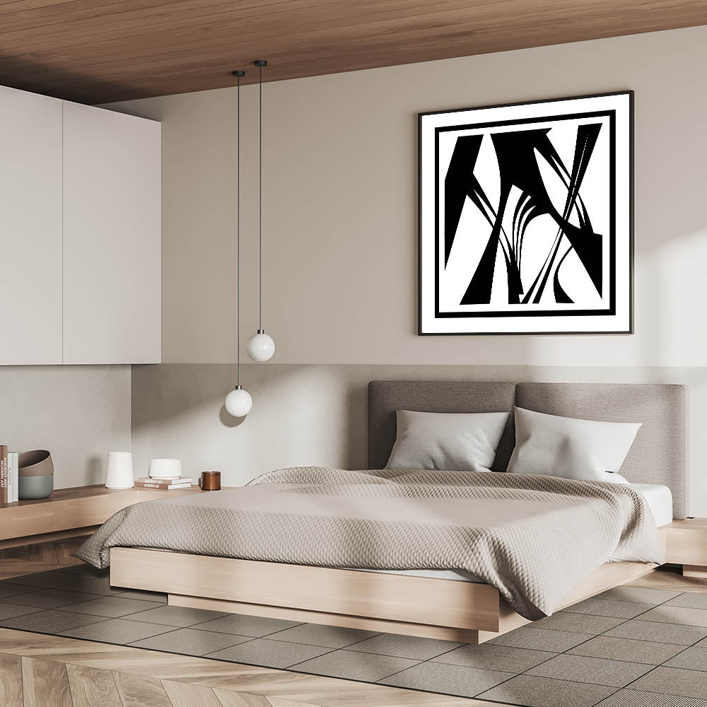 Make a bold statement with this minimalist black and white abstract wall art, featuring striking geometric shapes and flowing lines. This high-contrast modern design is perfect for those who love sleek, contemporary aesthetics and is an ideal addition to customizable bedroom wall art collections.