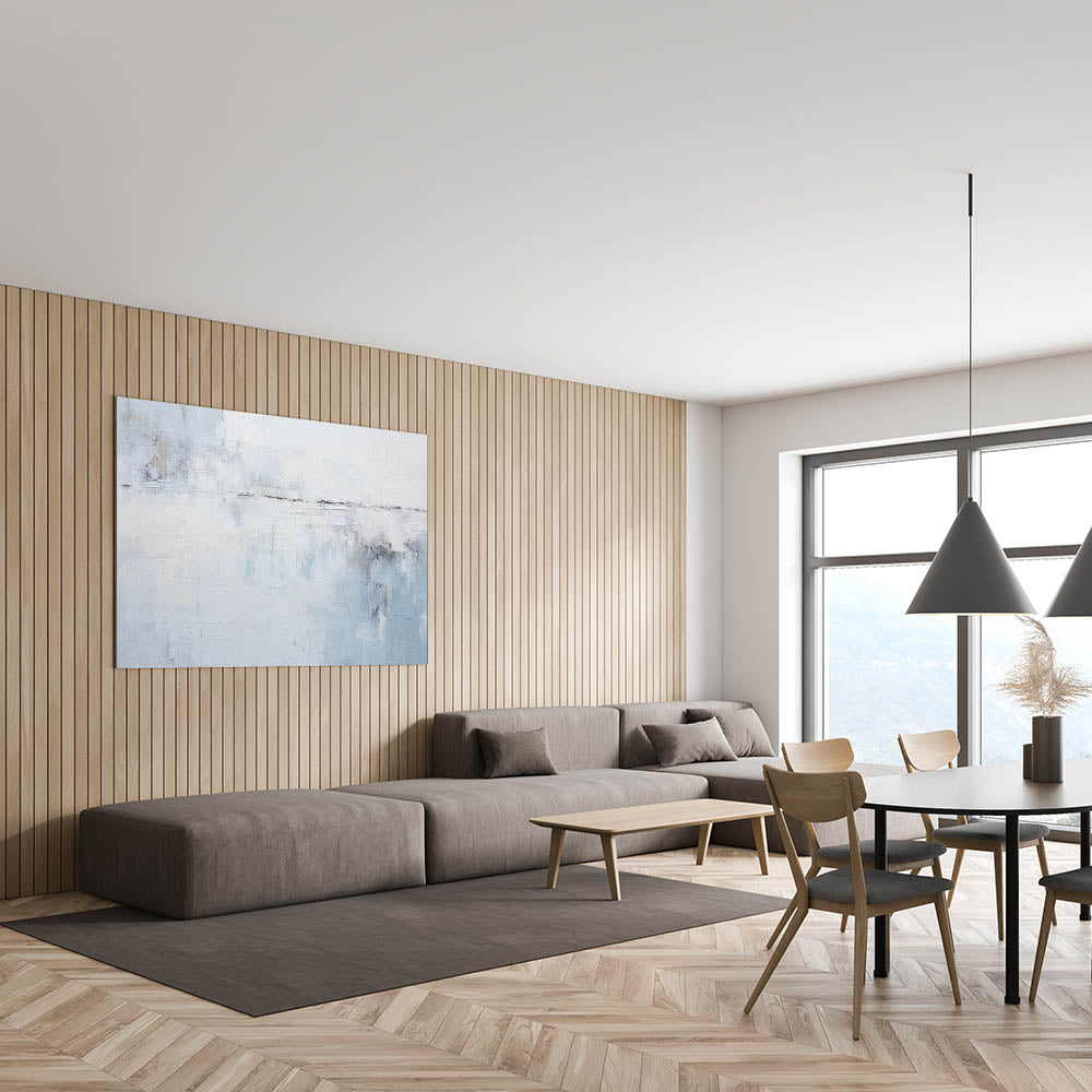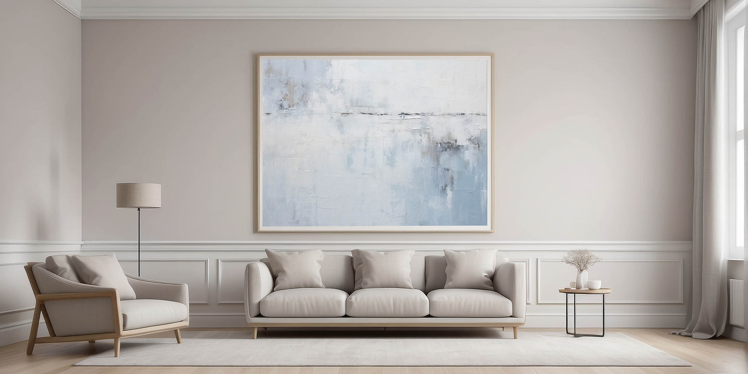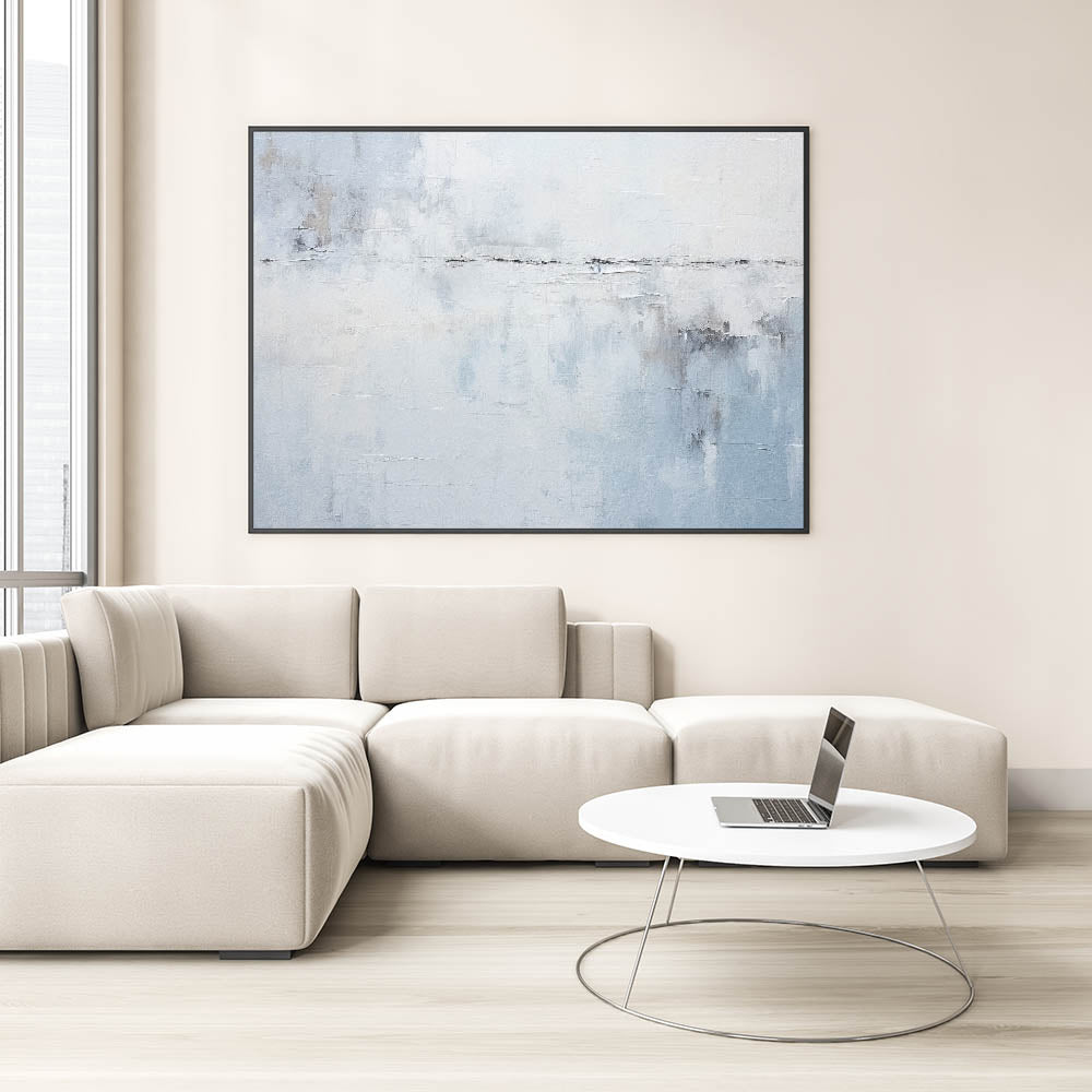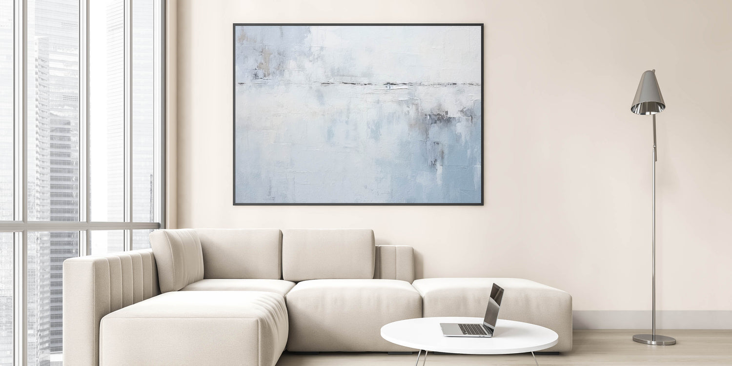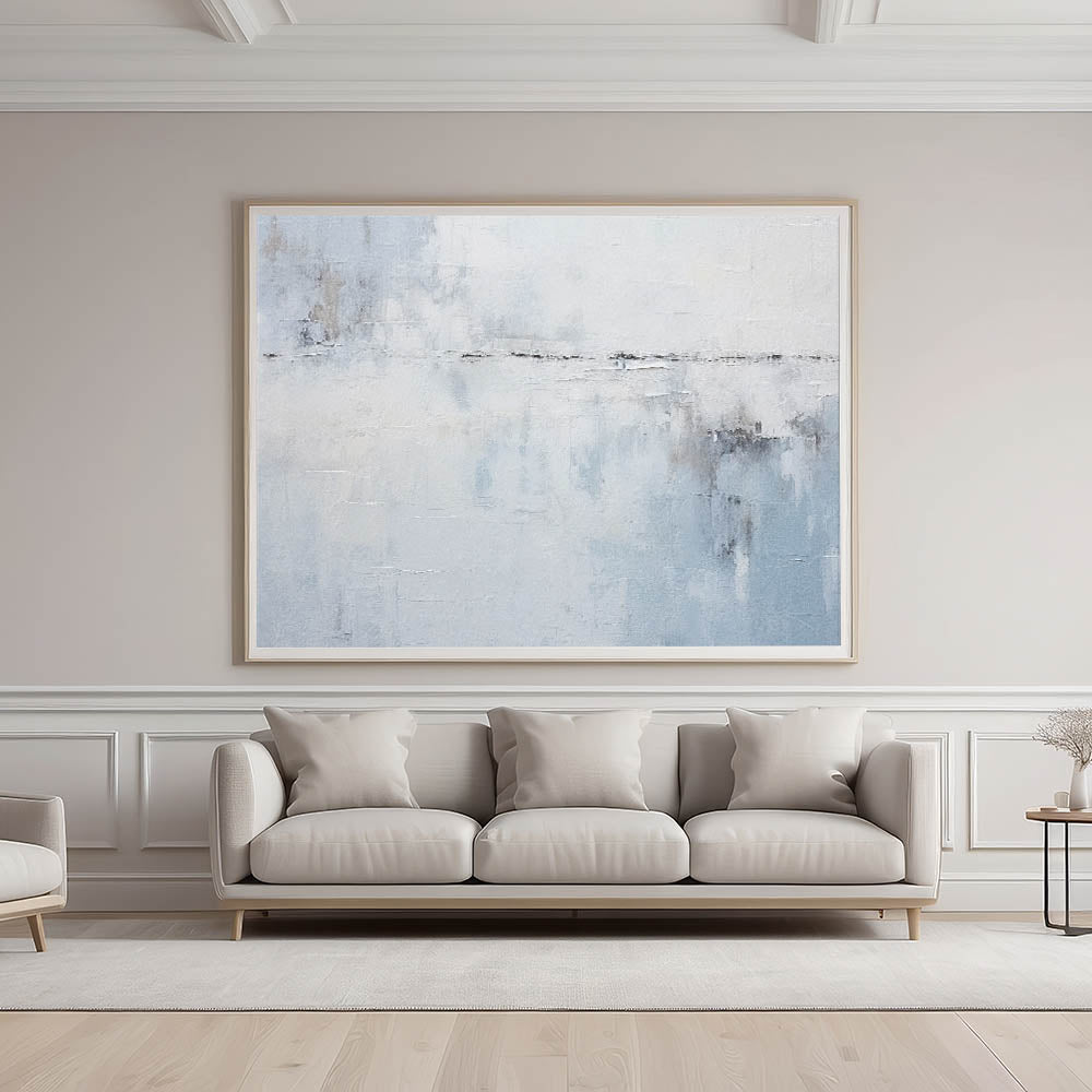 Bring calm and sophistication to your space with this minimalist blue and white abstract art. Featuring soft, misty shades of light blue, white, and subtle gray, this piece evokes the peacefulness of an open sky or serene seascape. Perfect for modern, coastal, or minimalist decor, this artwork adds a touch of tranquility to any living room, bedroom, or office.