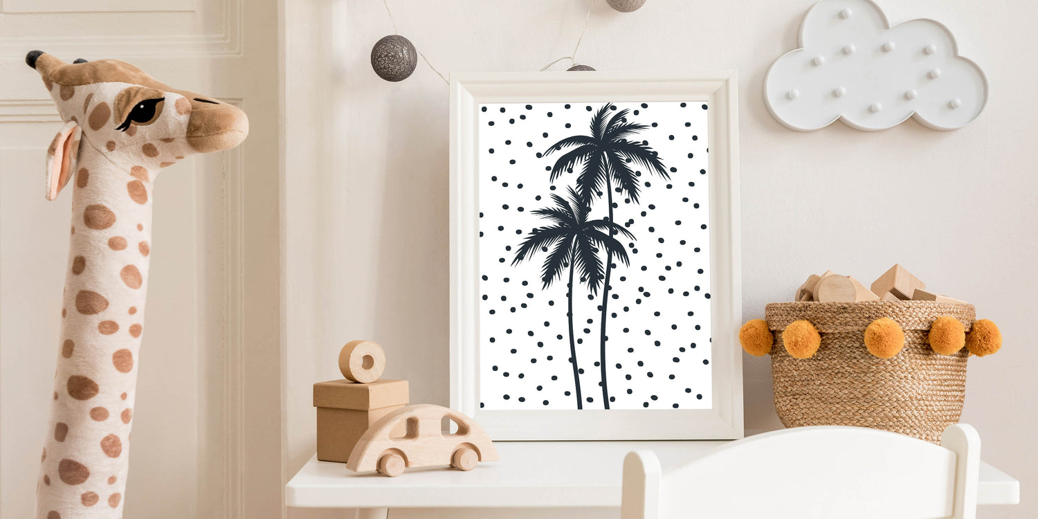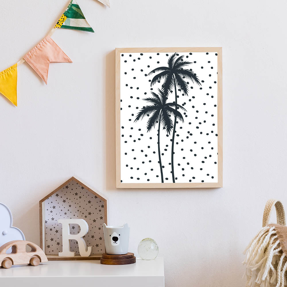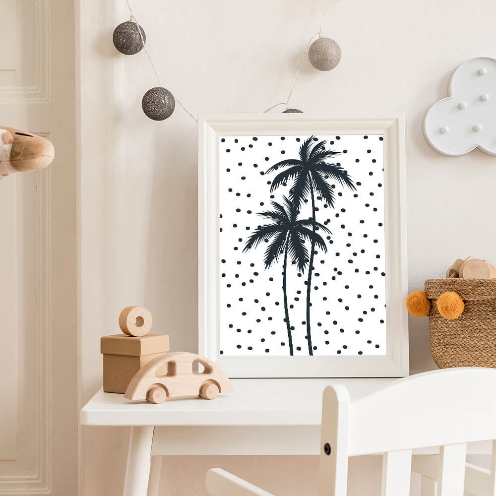 Create a stylish and playful atmosphere with this modern palm tree Boys Room Wall Art. Featuring a bold black and white silhouette of tropical palms against a dotted background, this Kids Wall Art Print adds a fun yet sophisticated touch to any Children’s Room Decor. Perfect for a Nursery Wall Art setup or as a Boys Bedroom Art statement piece, this design brings a modern coastal vibe to your child’s space.