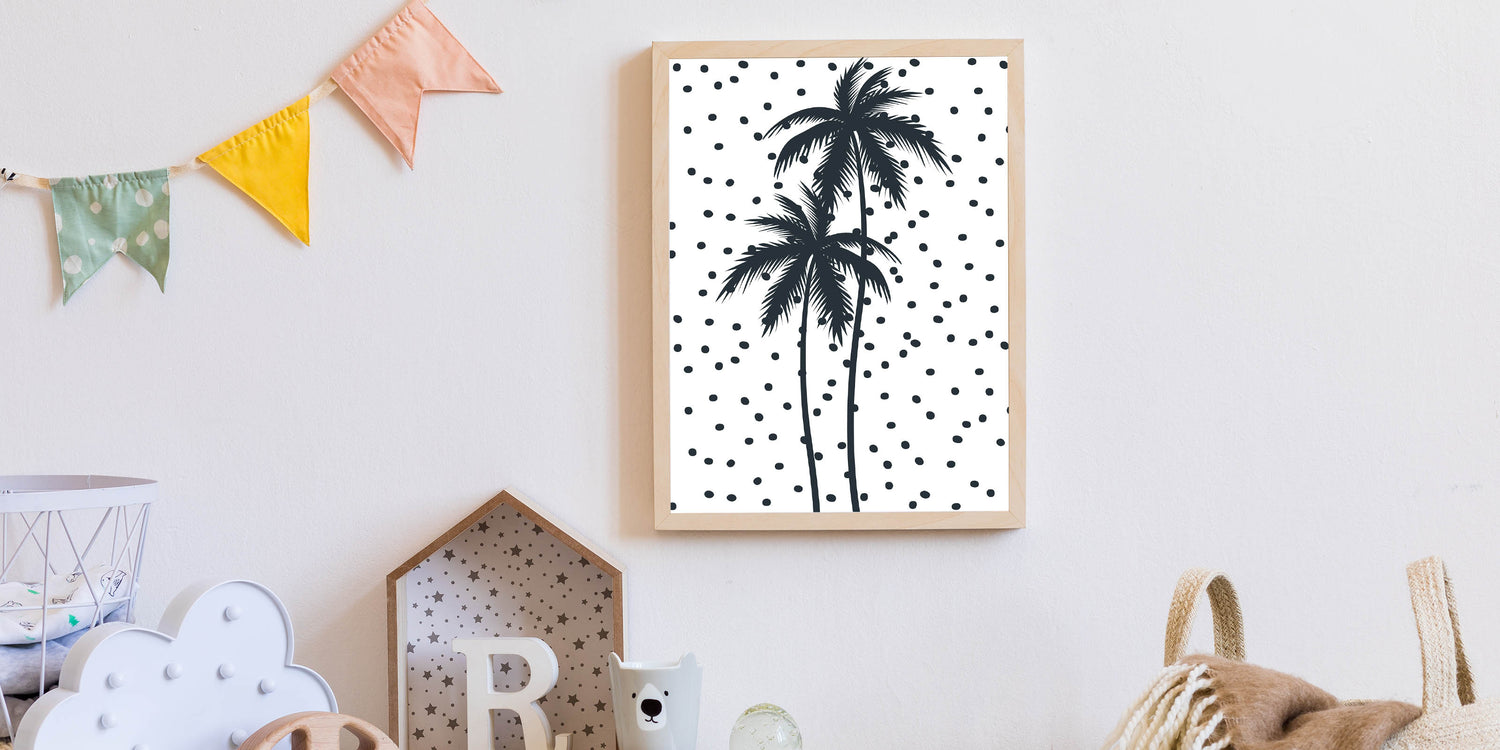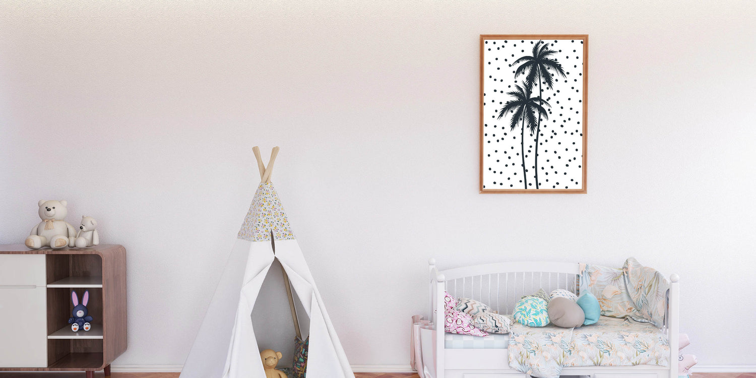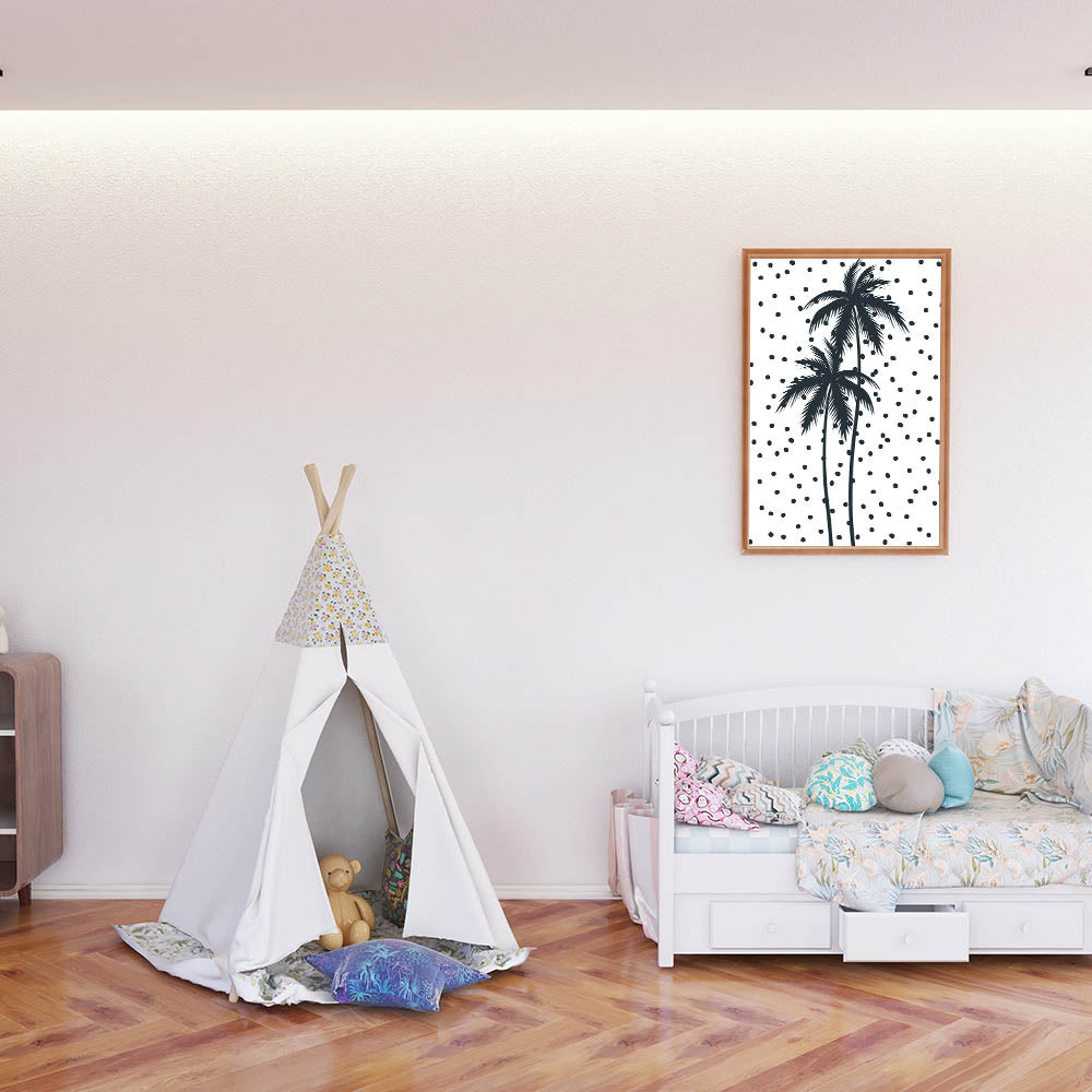 Create a stylish and playful atmosphere with this modern palm tree Boys Room Wall Art. Featuring a bold black and white silhouette of tropical palms against a dotted background, this Kids Wall Art Print adds a fun yet sophisticated touch to any Children’s Room Decor. Perfect for a Nursery Wall Art setup or as a Boys Bedroom Art statement piece, this design brings a modern coastal vibe to your child’s space.