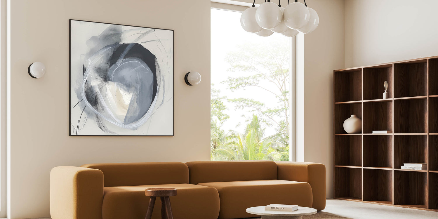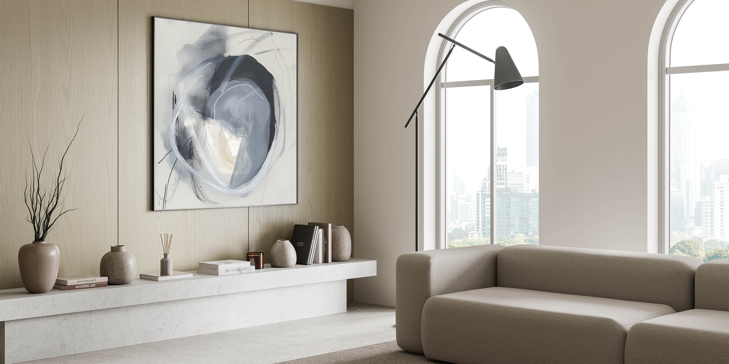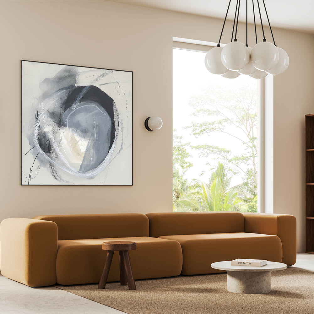 Elevate your décor with this striking minimalist geometric abstract art. Featuring layered circular patterns in shades of black, gray, and white, this piece creates a sense of balance and depth. The dynamic strokes and soft textures make it a perfect addition to contemporary, Scandinavian, or industrial-inspired interiors.