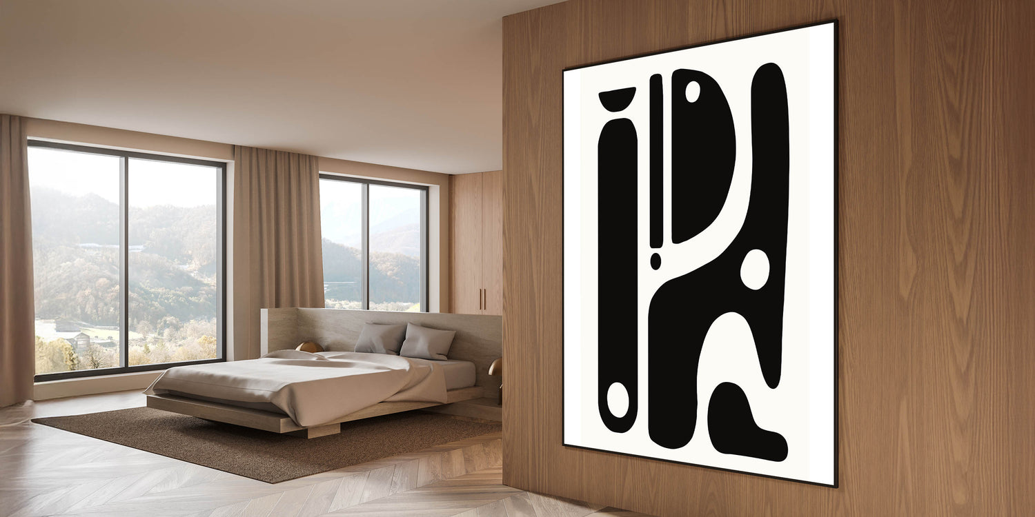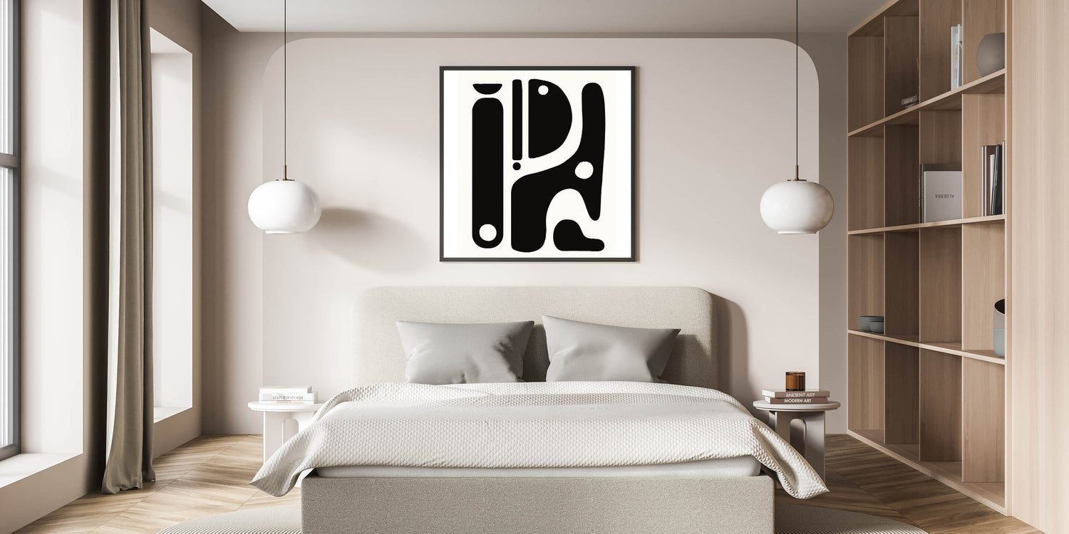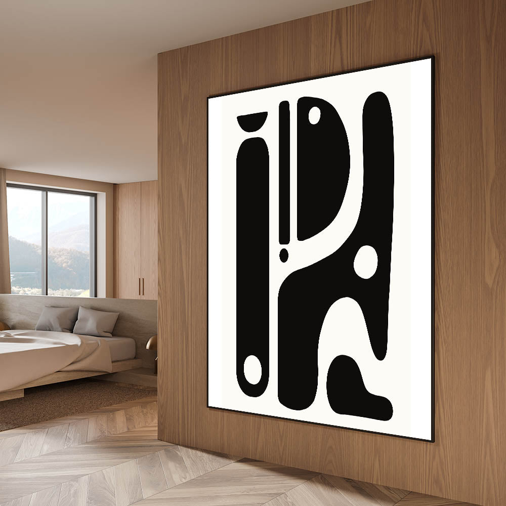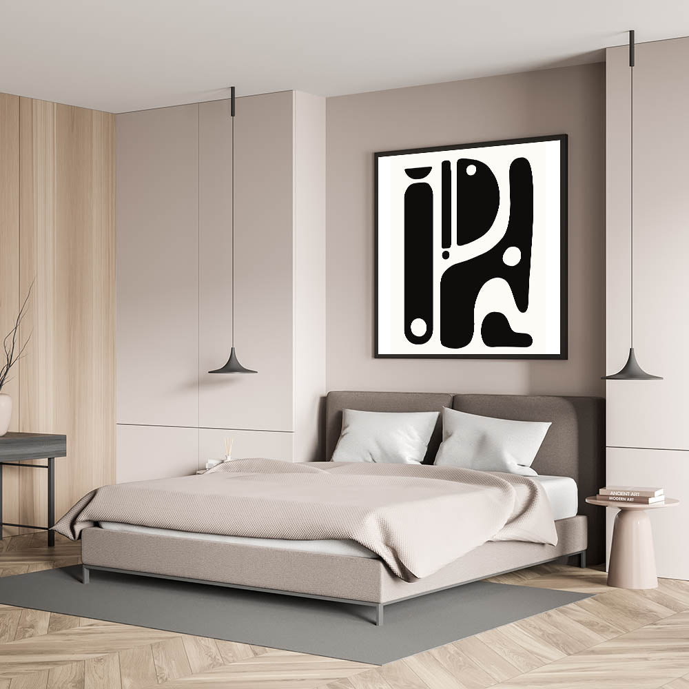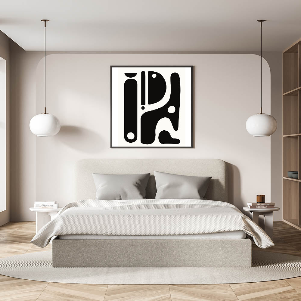 Elevate your bedroom with this modern minimalist geometric wall art, featuring bold black forms on a white background. This design embraces simplicity and abstraction, making it a perfect choice for contemporary bedroom decor. The smooth lines and structured composition create a harmonious balance, ideal for a modern aesthetic.