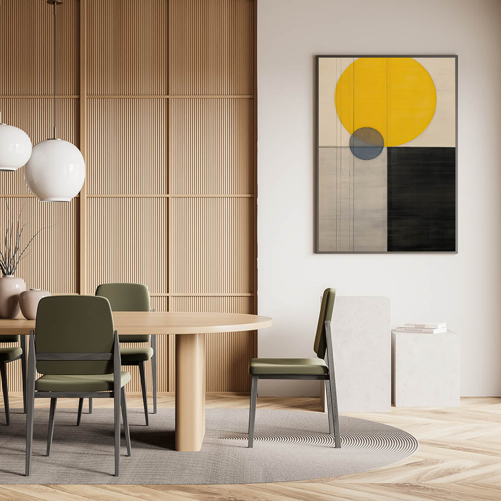 Bring modern elegance to your dining space with this minimalist geometric wall art, featuring a bold yellow circle, soft gray-blue accents, and structured black and beige elements. The strong contrast and clean, balanced composition make this piece a sophisticated focal point in any contemporary dining area. Perfect for lovers of modern, abstract, and minimalist art, this elegant dining room wall art creates a refined yet energetic atmosphere.
