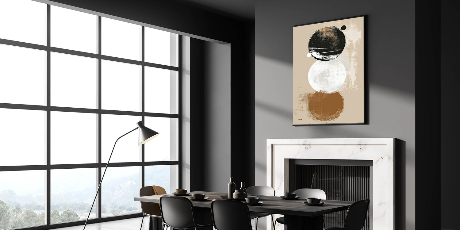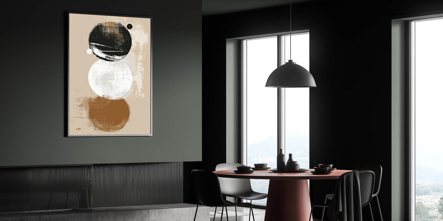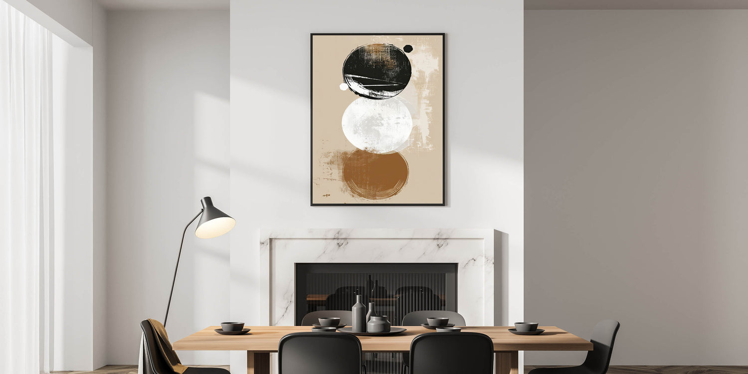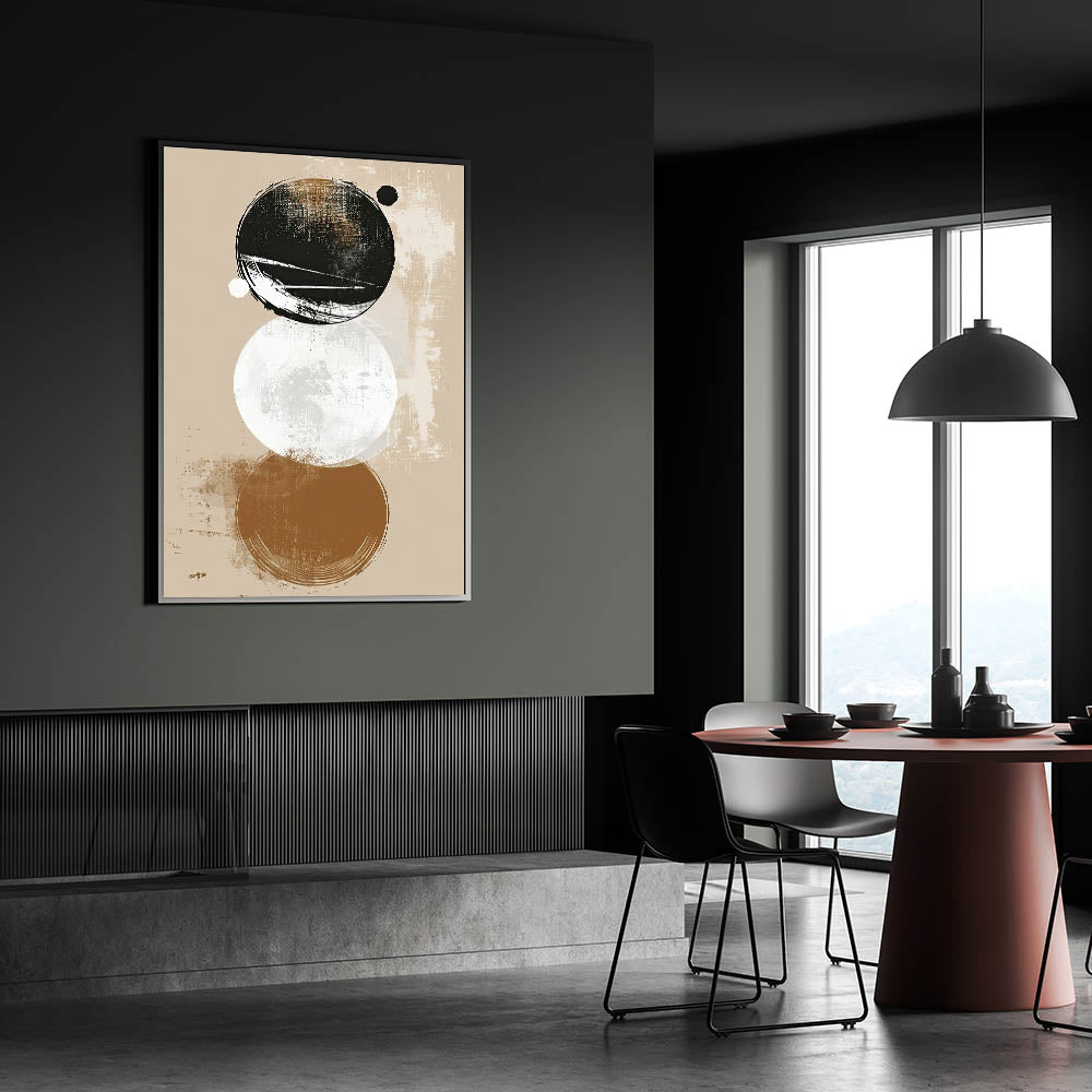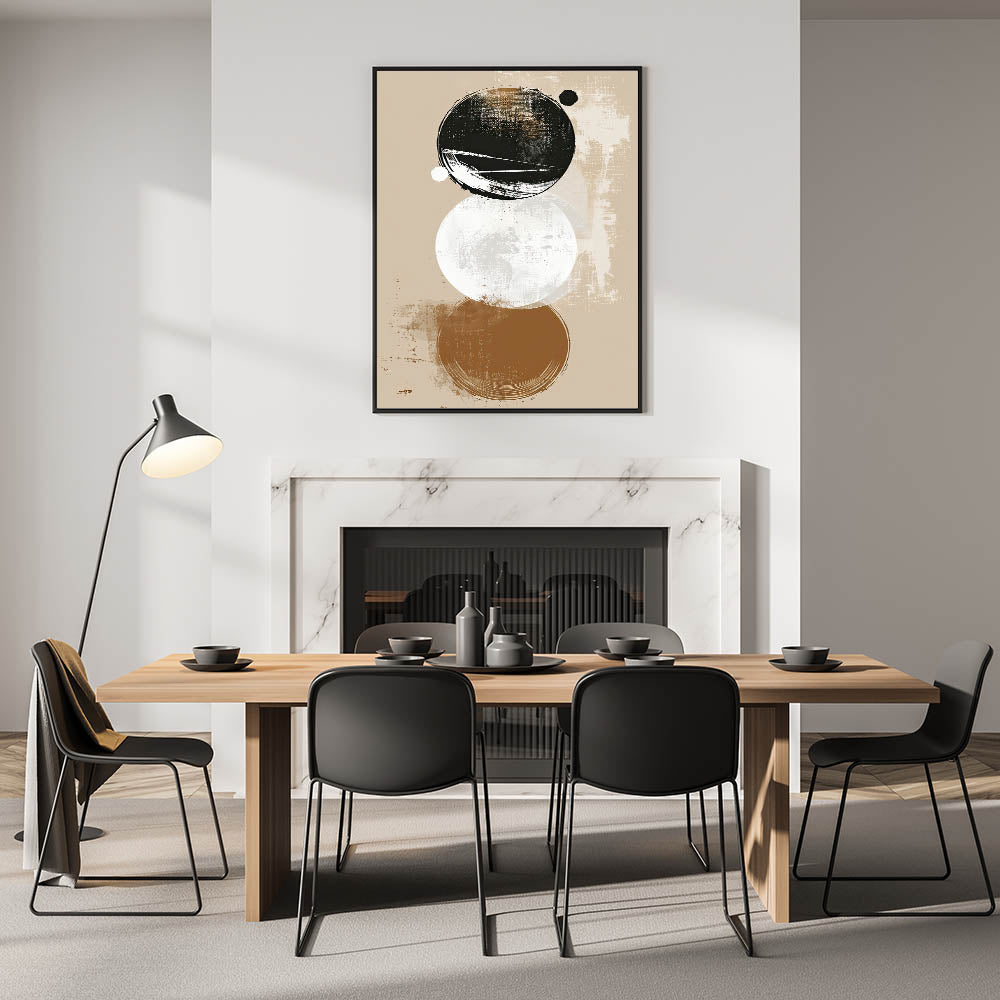 Elevate your dining space with this elegant dining room wall art, featuring a striking geometric design in neutral tones. The blend of black, white, and brown creates a contemporary dining art piece that complements both modern and minimalist interiors. Its abstract arrangement of spheres and textured details adds depth, making it an excellent choice for dining room wall decor.