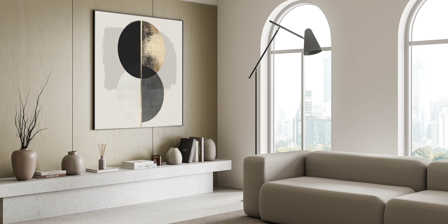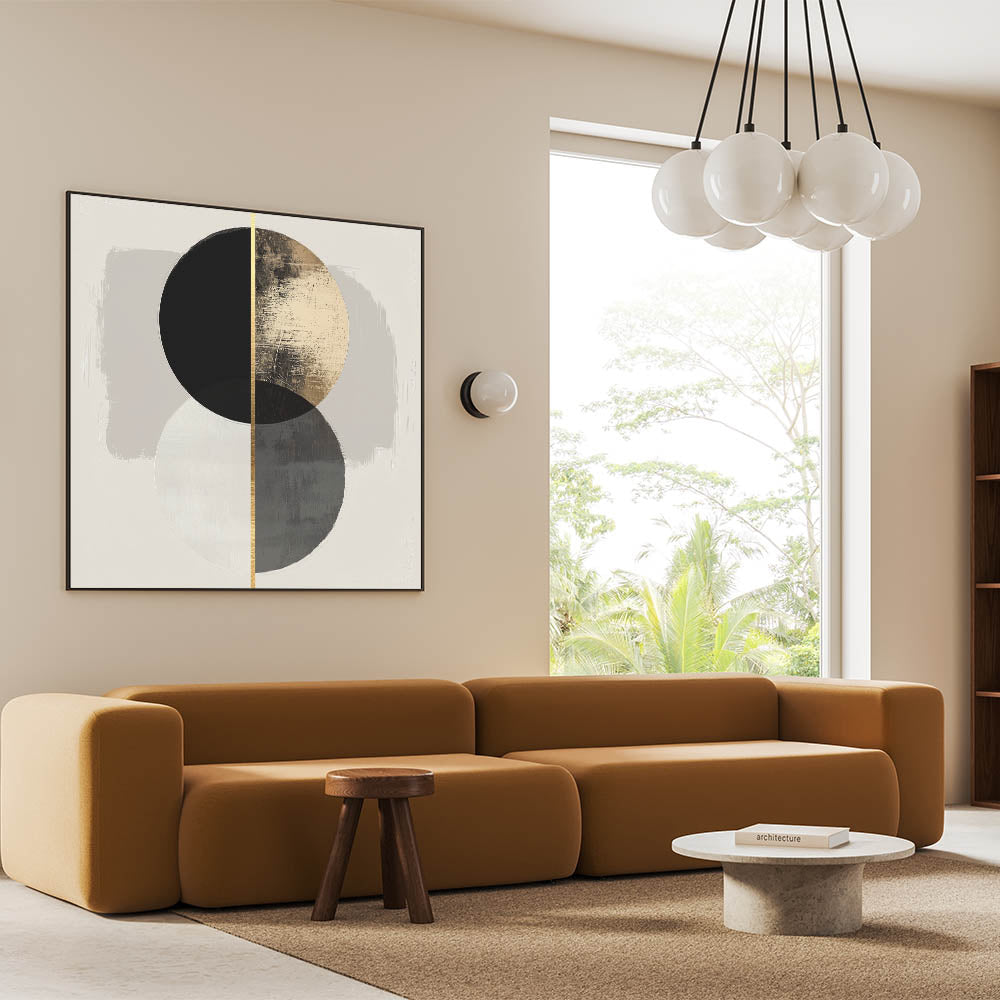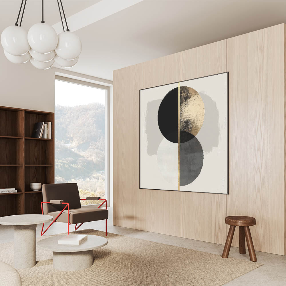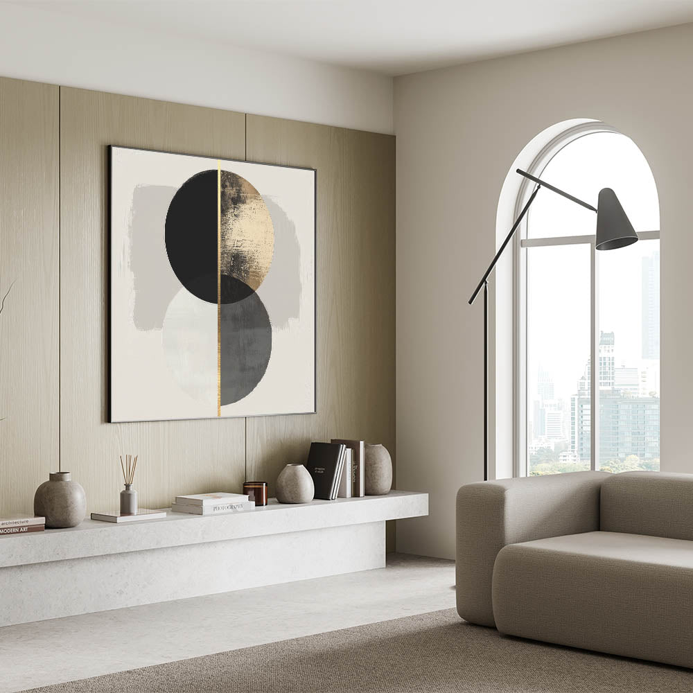Add a touch of sophistication to your space with this minimalist geometric wall art. This artwork features a harmonious composition of abstract circles in black, gray, and metallic gold, divided by a sleek golden line. The clean and balanced design is perfect for modern, industrial, or Scandinavian-inspired interiors, offering a timeless and elegant aesthetic.