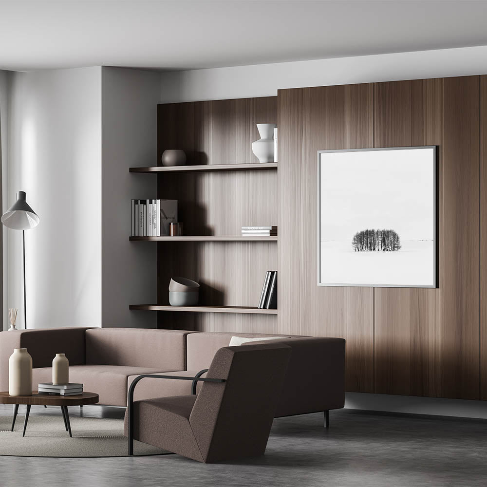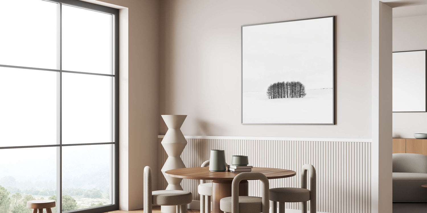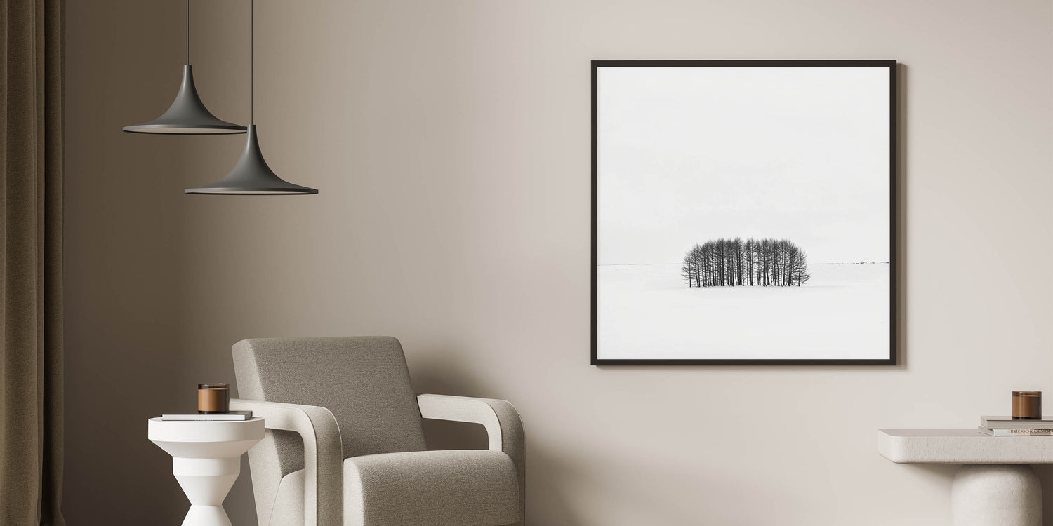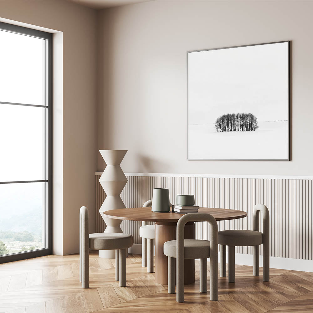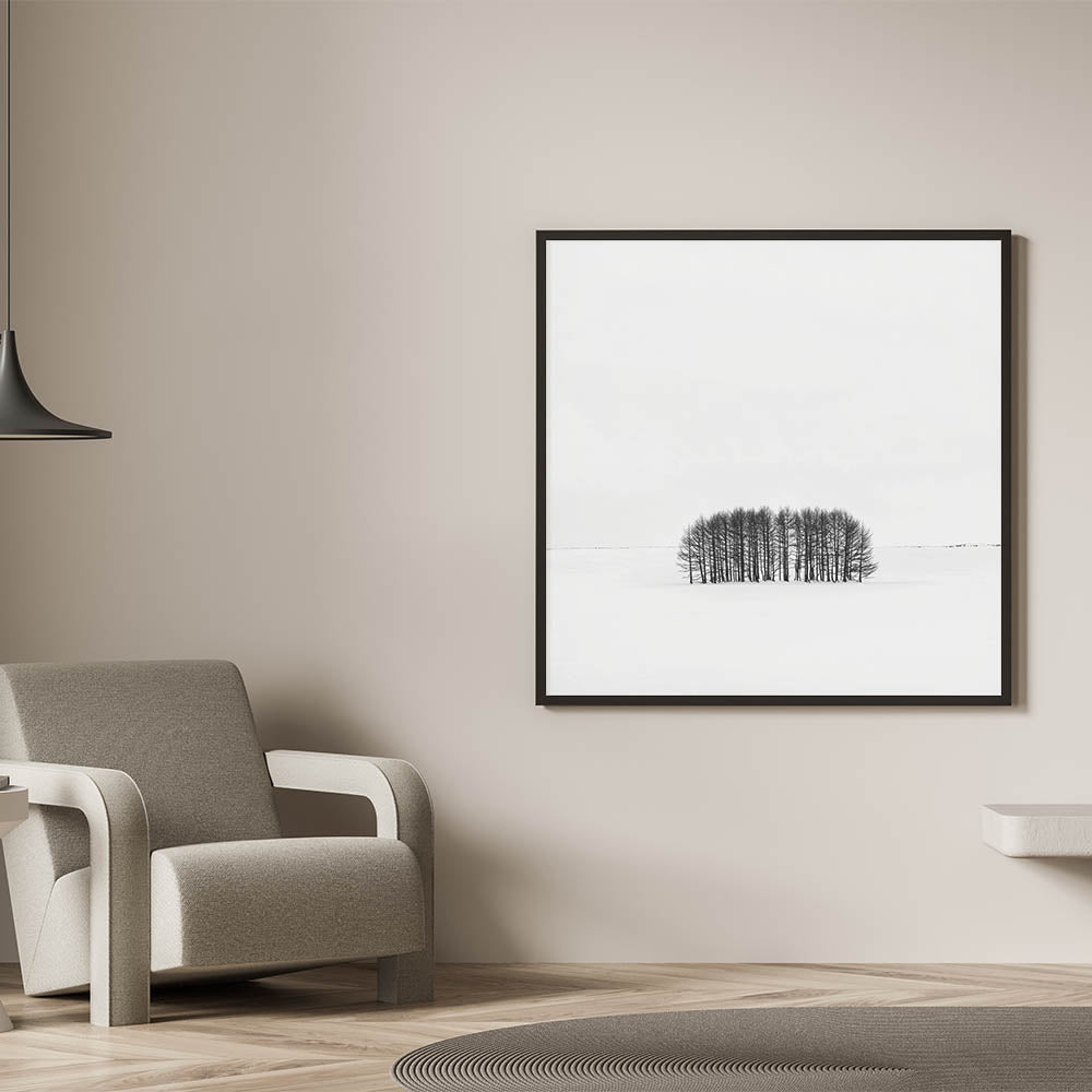 Embrace the beauty of simplicity with this minimalist landscape artwork, showcasing a cluster of bare trees surrounded by a vast, snowy field. The monochromatic tones of black, white, and gray create a striking contrast, evoking a sense of solitude and tranquility. This elegant piece is ideal for modern, Scandinavian, and minimalist interiors, adding depth and sophistication to any space.