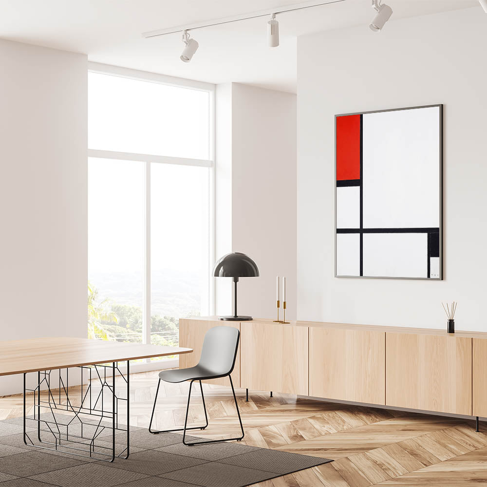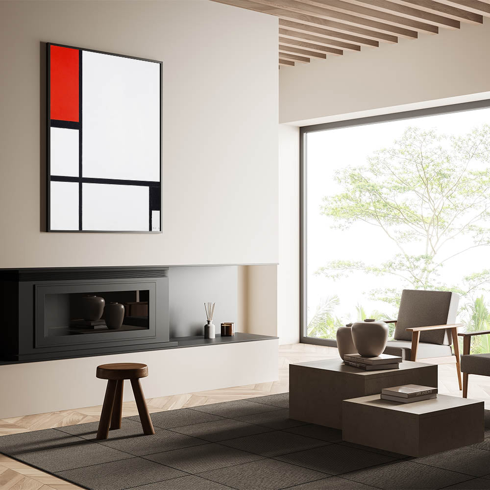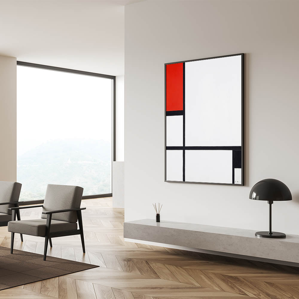Add a bold, minimalist touch to your space with this iconic abstract geometric artwork. This piece, featuring a striking red and black composition against a white background, embodies the essence of contemporary art with clean lines and balanced forms. Perfect for those seeking unique modern art that makes a statement, this piece blends effortlessly into any stylish wall art collection.