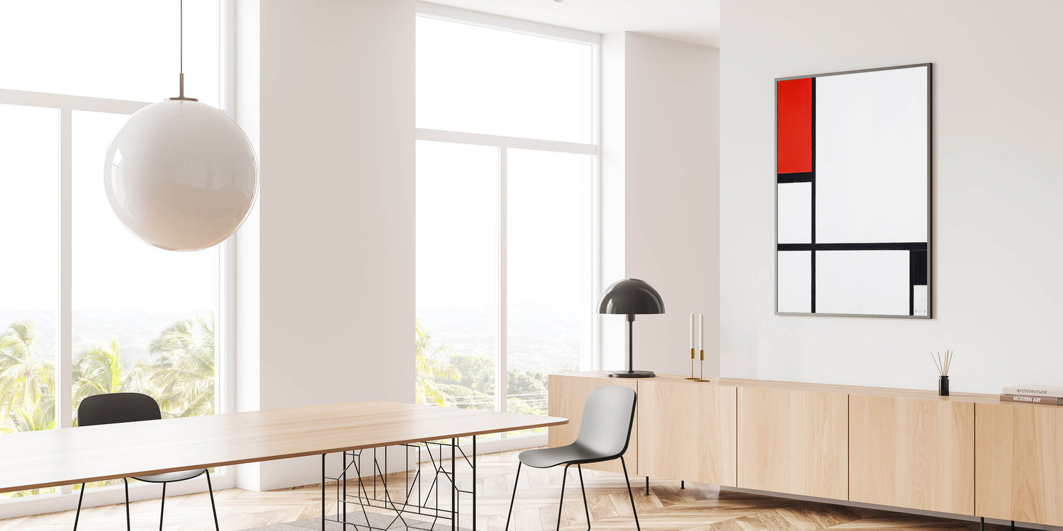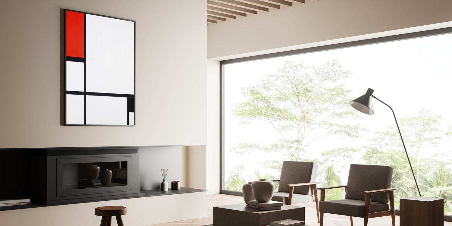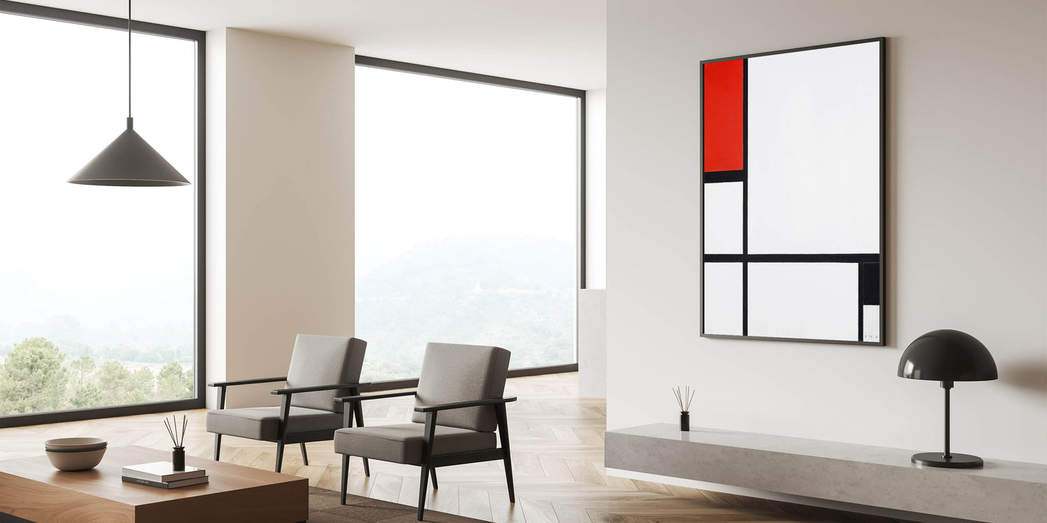 Add a bold, minimalist touch to your space with this iconic abstract geometric artwork. This piece, featuring a striking red and black composition against a white background, embodies the essence of contemporary art with clean lines and balanced forms. Perfect for those seeking unique modern art that makes a statement, this piece blends effortlessly into any stylish wall art collection.