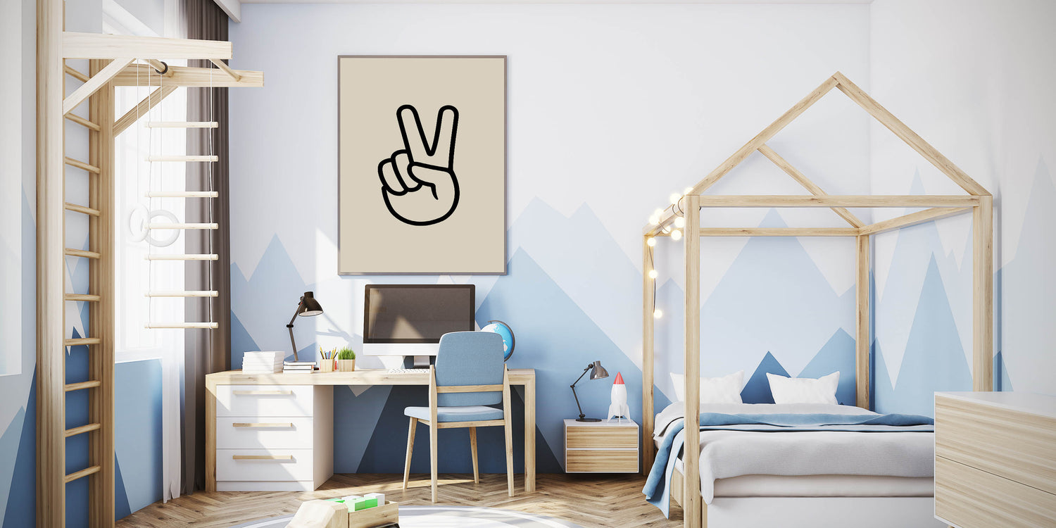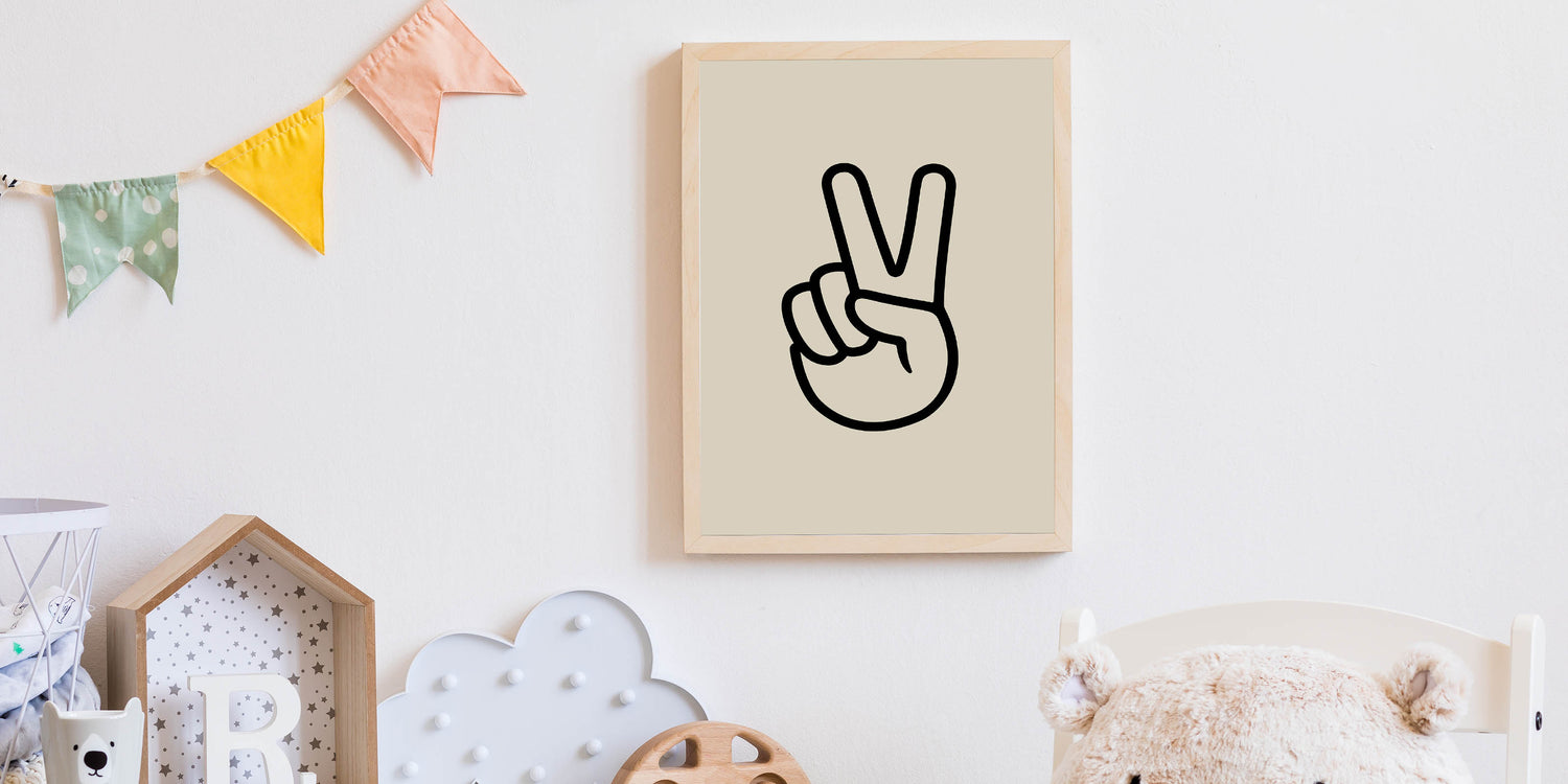 Promote peace and positivity in your child's space with this bold and minimalist "Peace" typography art print. Featuring a stylized peace hand sign against a calming beige background, this design is perfect for adding a soothing and inspirational touch to any room. Ideal for nurseries, playrooms, or study areas, it serves as both decor and a gentle reminder to spread kindness.
