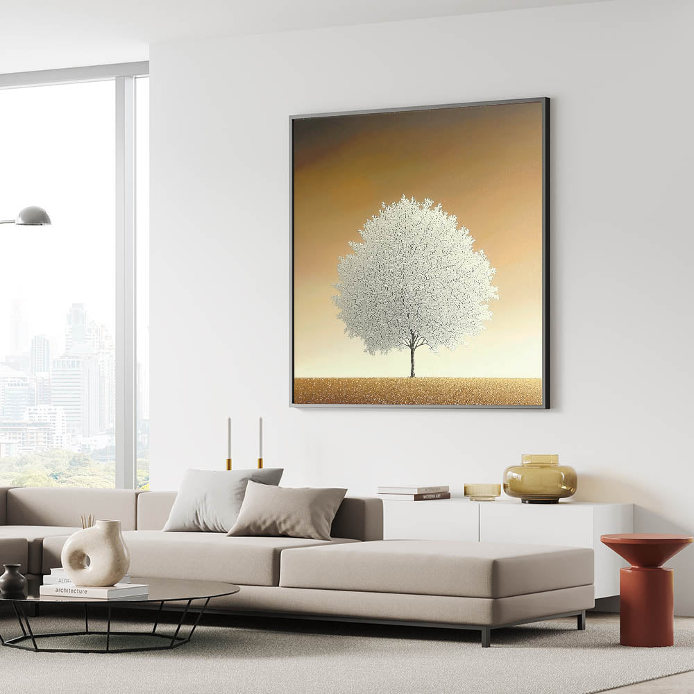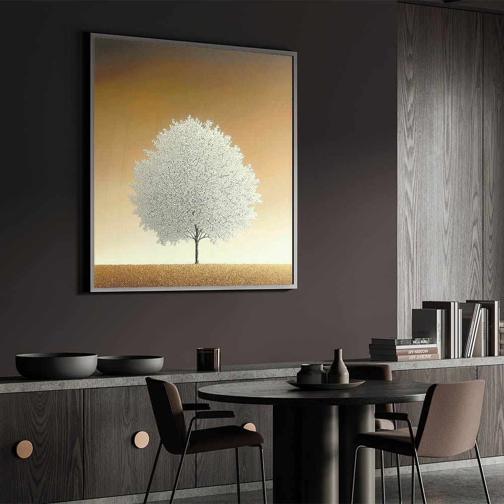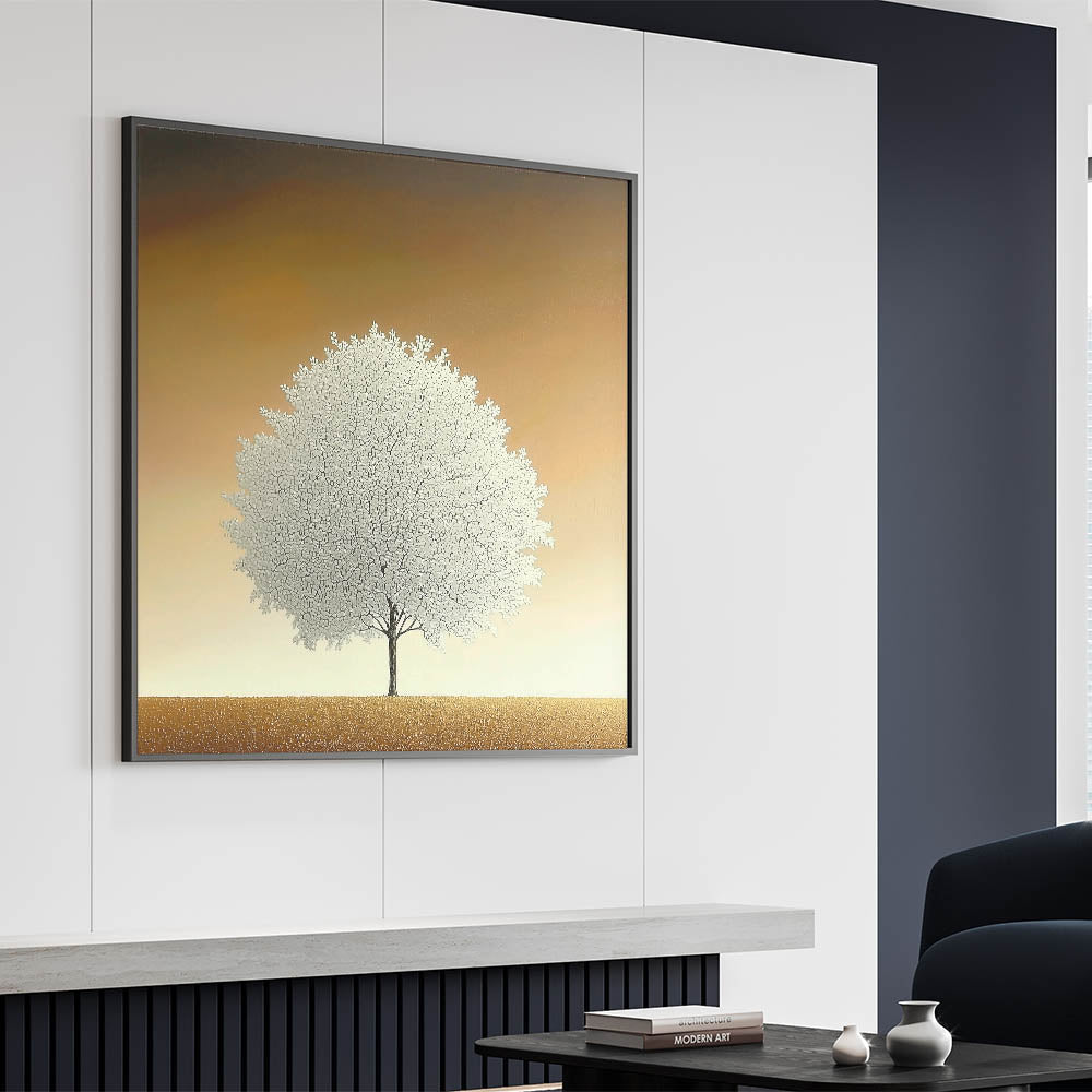 Introduce sophistication and tranquility to your decor with this stunning minimalist tree artwork. Featuring a textured white tree in full bloom, set against a gradient background of warm golden browns and soft beige tones, this piece exudes elegance and balance. The clean lines and earthy palette make it a versatile addition to both modern and traditional interiors.