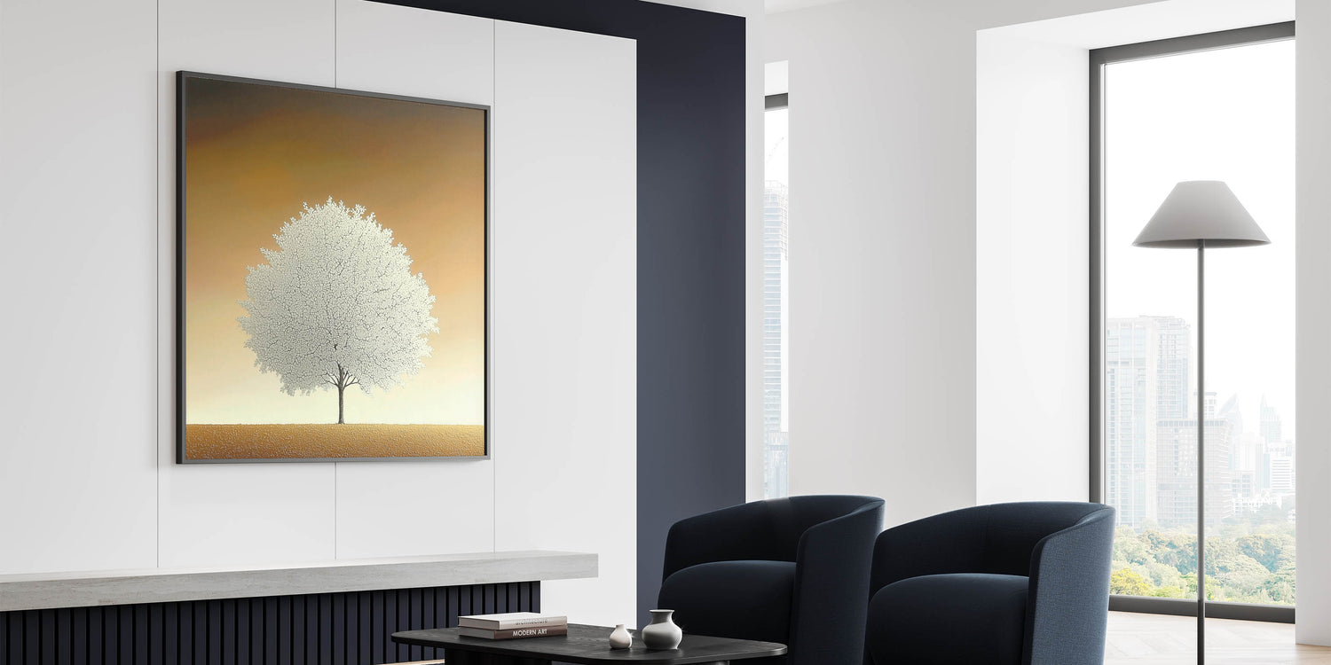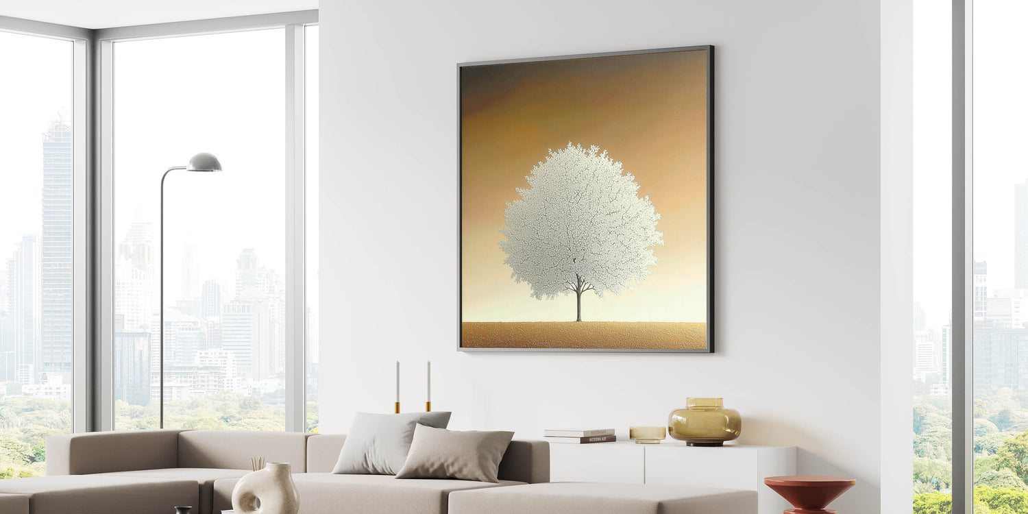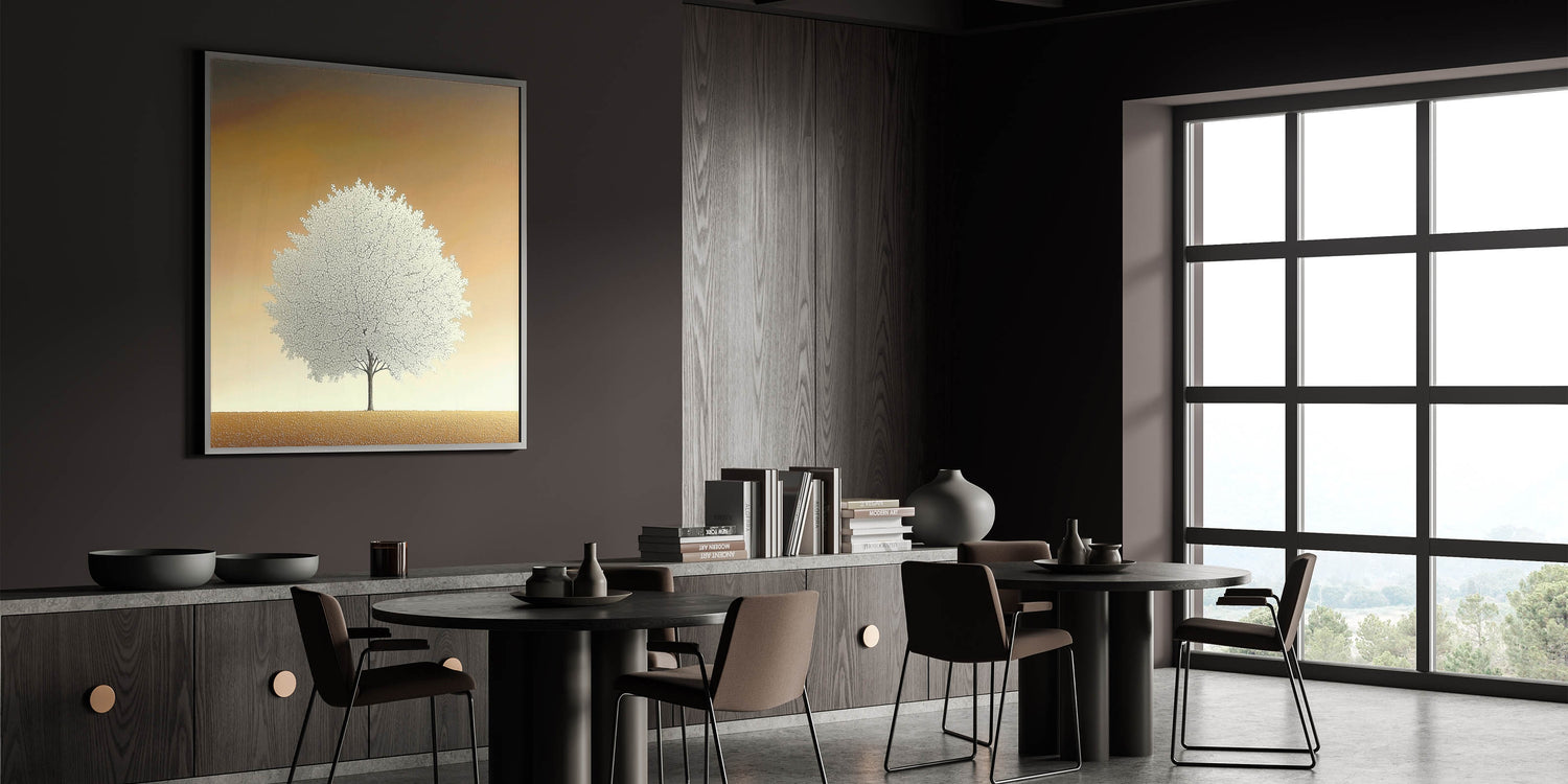 Introduce sophistication and tranquility to your decor with this stunning minimalist tree artwork. Featuring a textured white tree in full bloom, set against a gradient background of warm golden browns and soft beige tones, this piece exudes elegance and balance. The clean lines and earthy palette make it a versatile addition to both modern and traditional interiors.