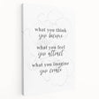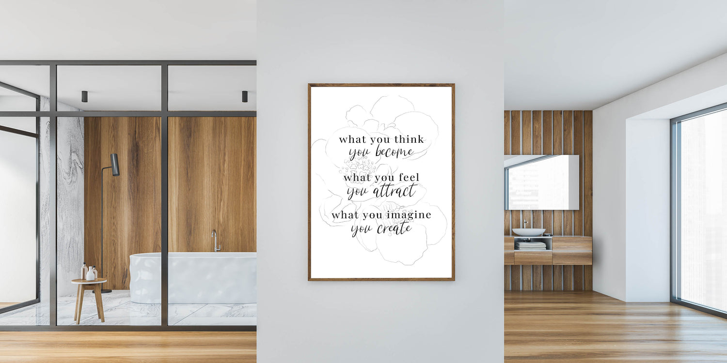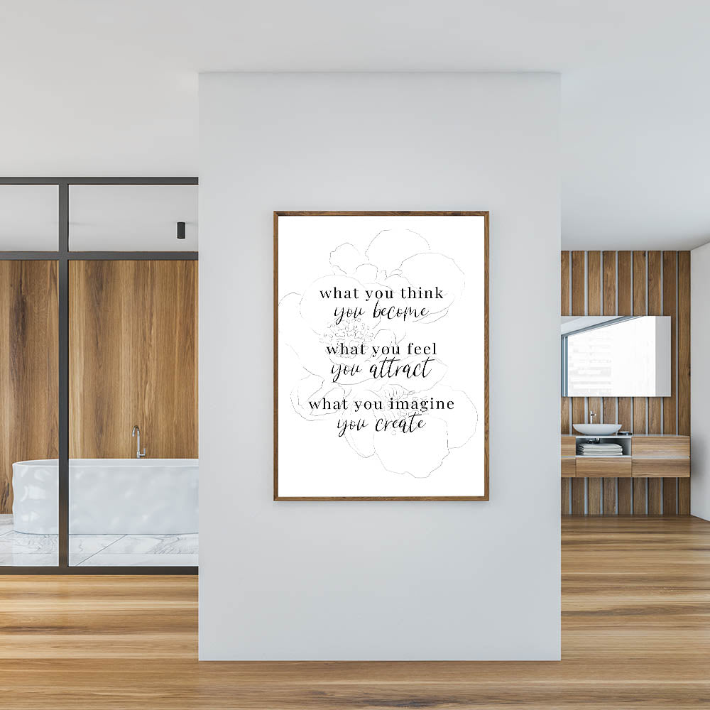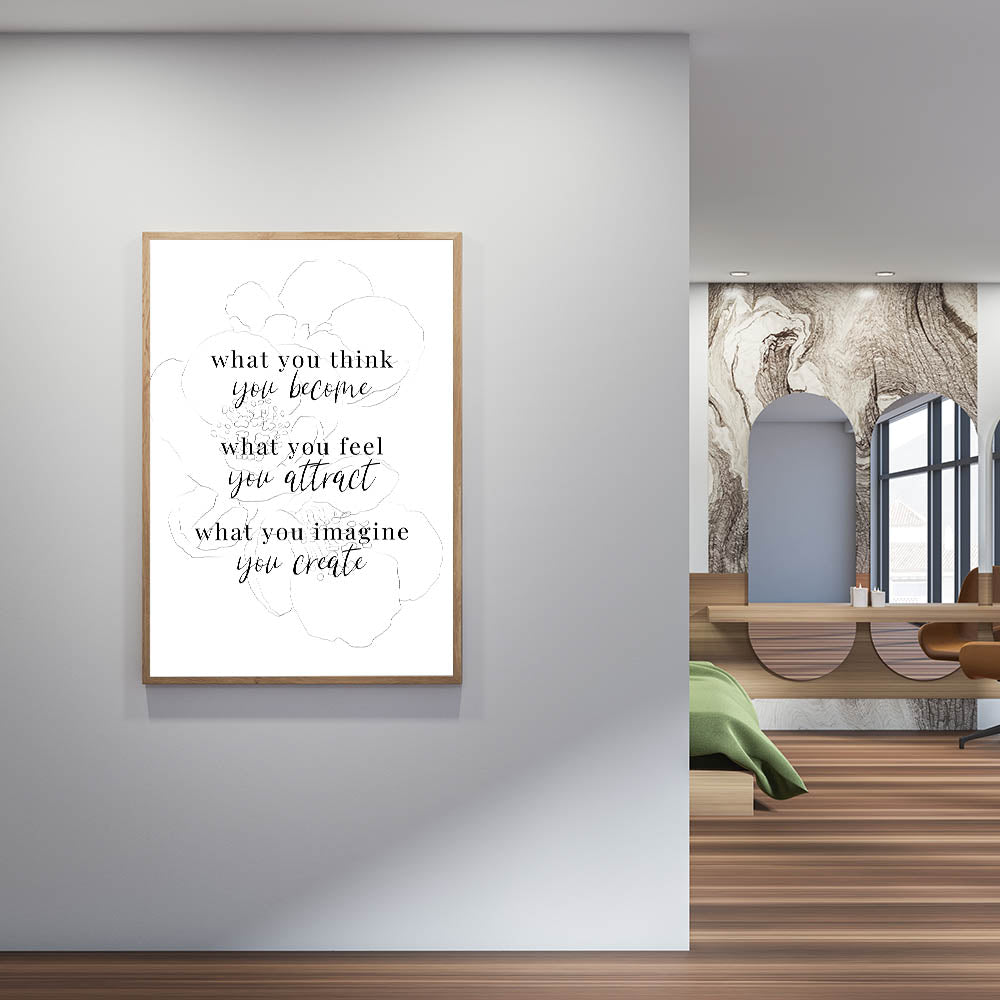 Inspire positivity and transformation with this elegant Minimalist Typography Art Print featuring the motivational quote: "What you think, you become. What you feel, you attract. What you imagine, you create." The design combines clean serif and script typography with soft, hand-drawn floral outlines, creating a harmonious and serene composition. Its monochromatic palette makes it a versatile piece for modern, minimalist, and Scandinavian interiors.