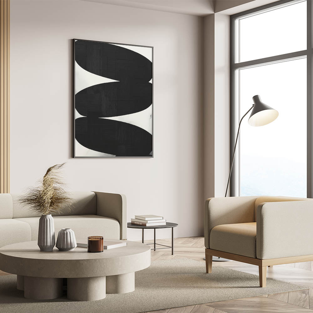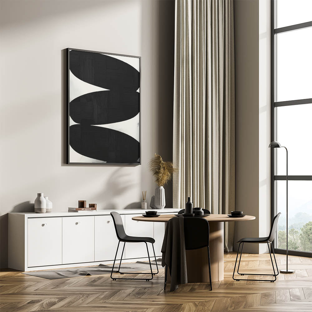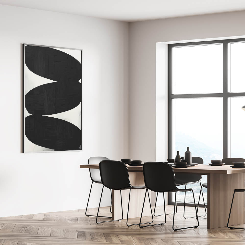 This powerful composition from the Abstracts in Earthen Harmony collection captures the essence of contrast and flow. Featuring cascading black abstract shapes over a soft white base, this modern abstract art piece evokes bold simplicity. Each form is textured with subtle brushwork, giving the piece depth and tactile appeal that draws the eye.