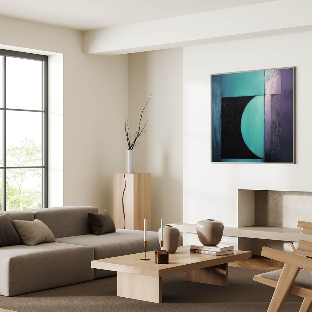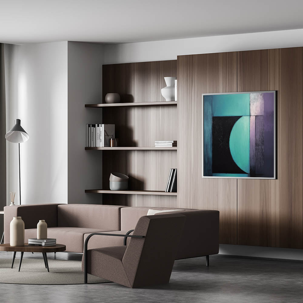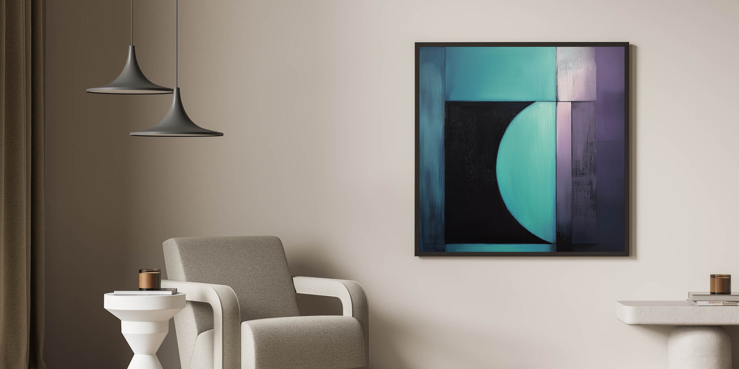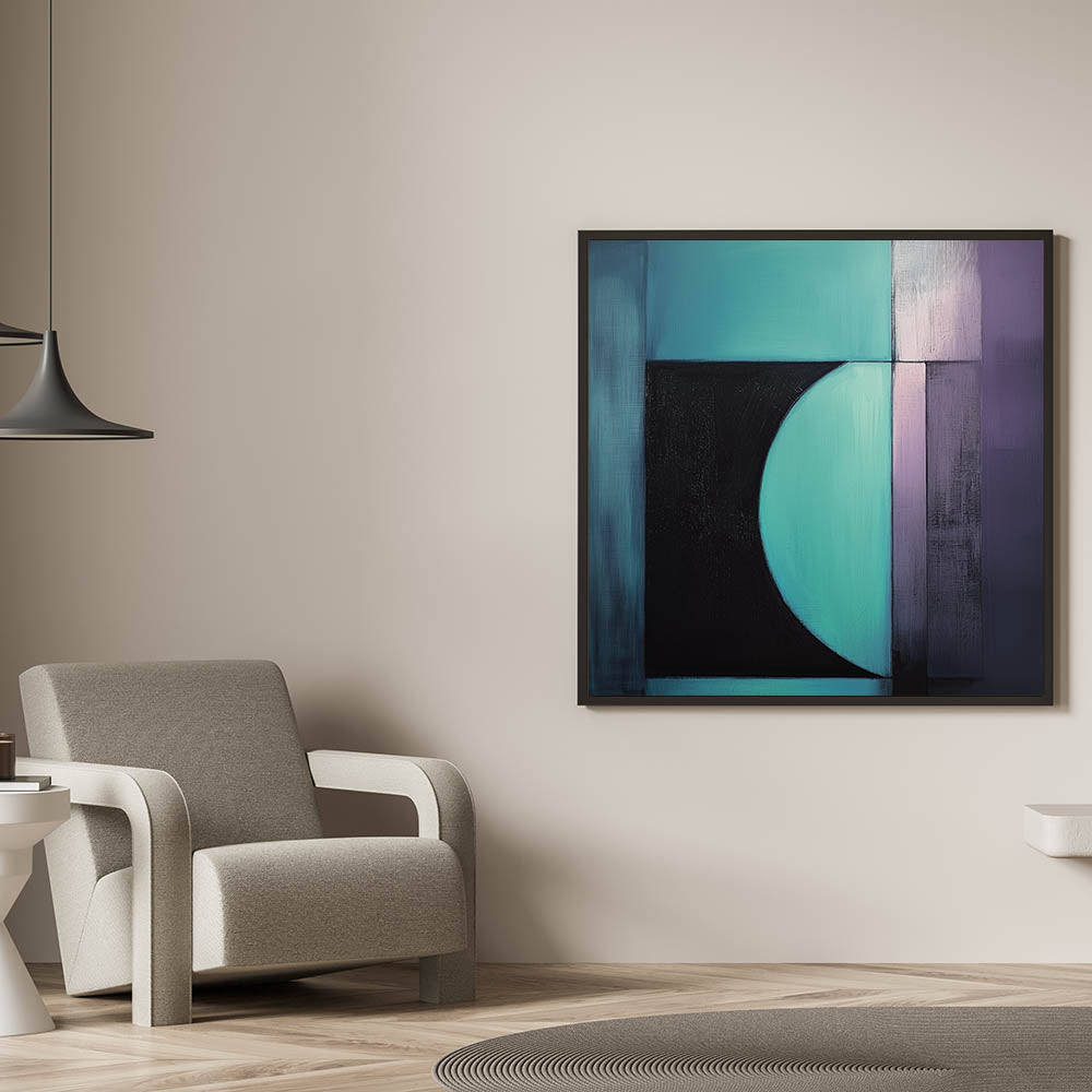 Bring a bold, contemporary edge to your home with this modern wall art, featuring an elegant composition of turquoise, black, and purple geometric forms. This living room wall art is a striking blend of vibrant and deep hues, adding a sense of movement and depth to any space. Whether displayed as canvas wall art or framed wall art, this piece is designed to complement modern living room decor with its sleek and artistic appeal.