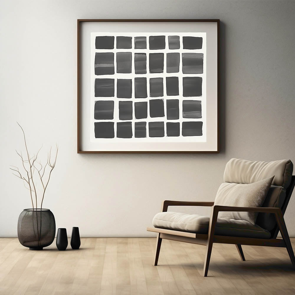 Balance and rhythm come together in this modern abstract wall art featuring a structured grid of hand-painted black and charcoal squares. The irregular brush textures bring an organic feel to a minimalist layout—ideal for bold, contemporary interiors.