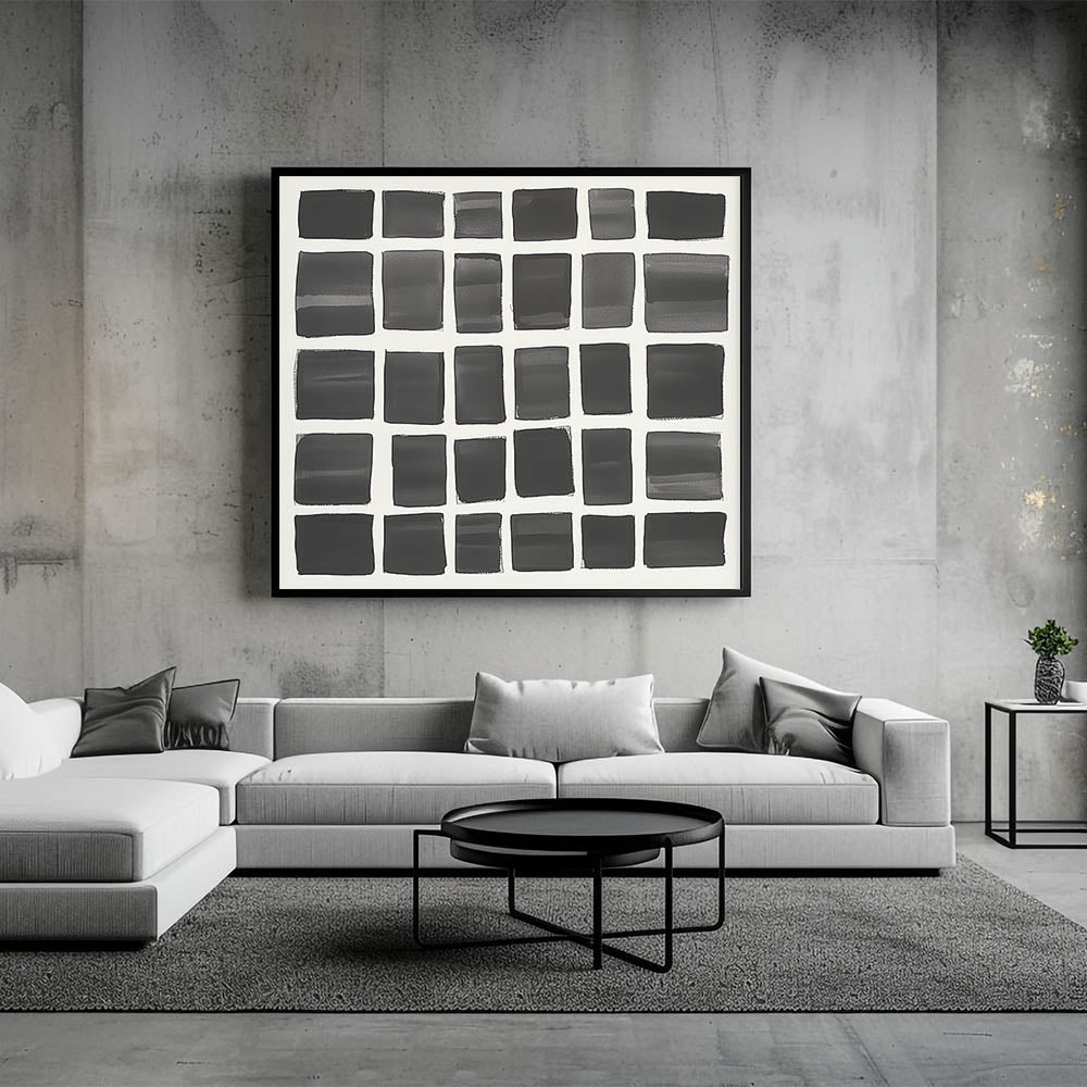 • Monochromatic grid design in varying tones of black and charcoal with visible brush texture