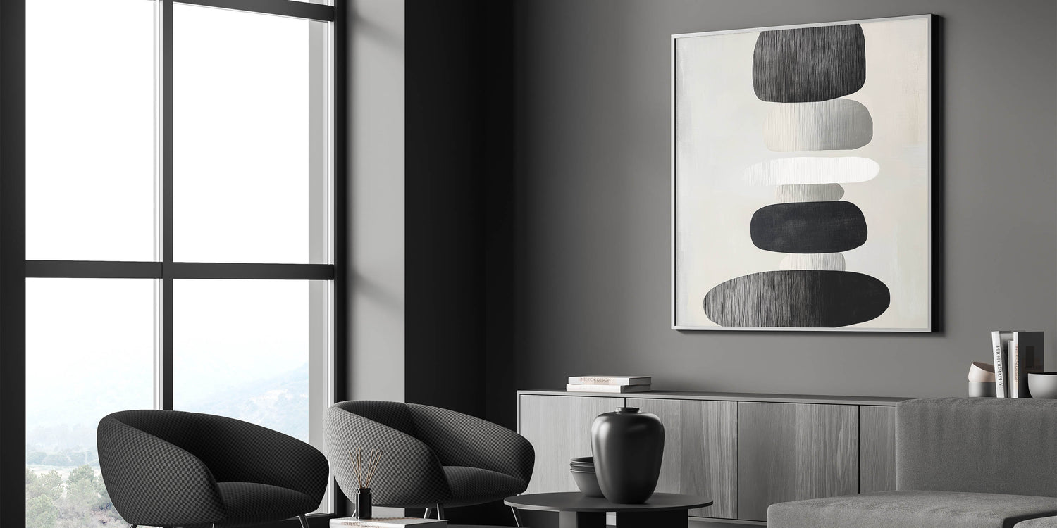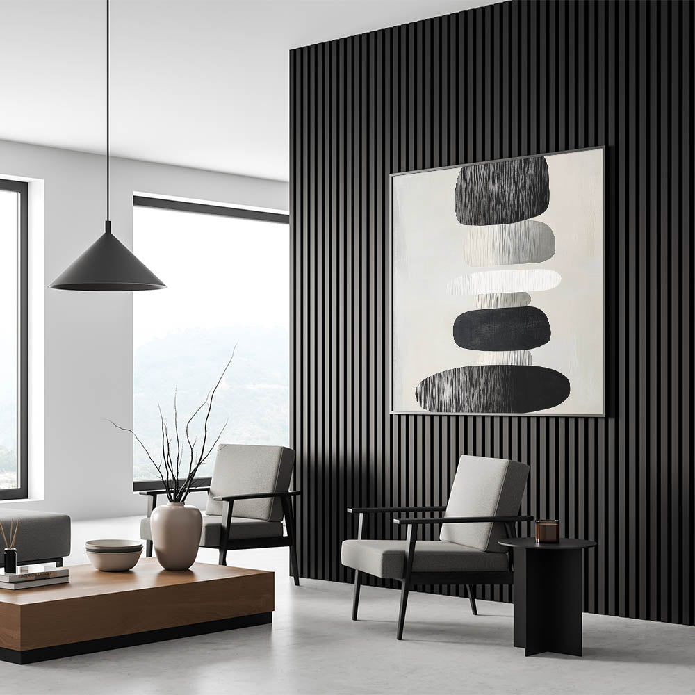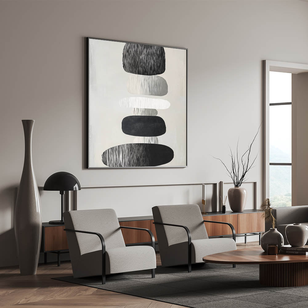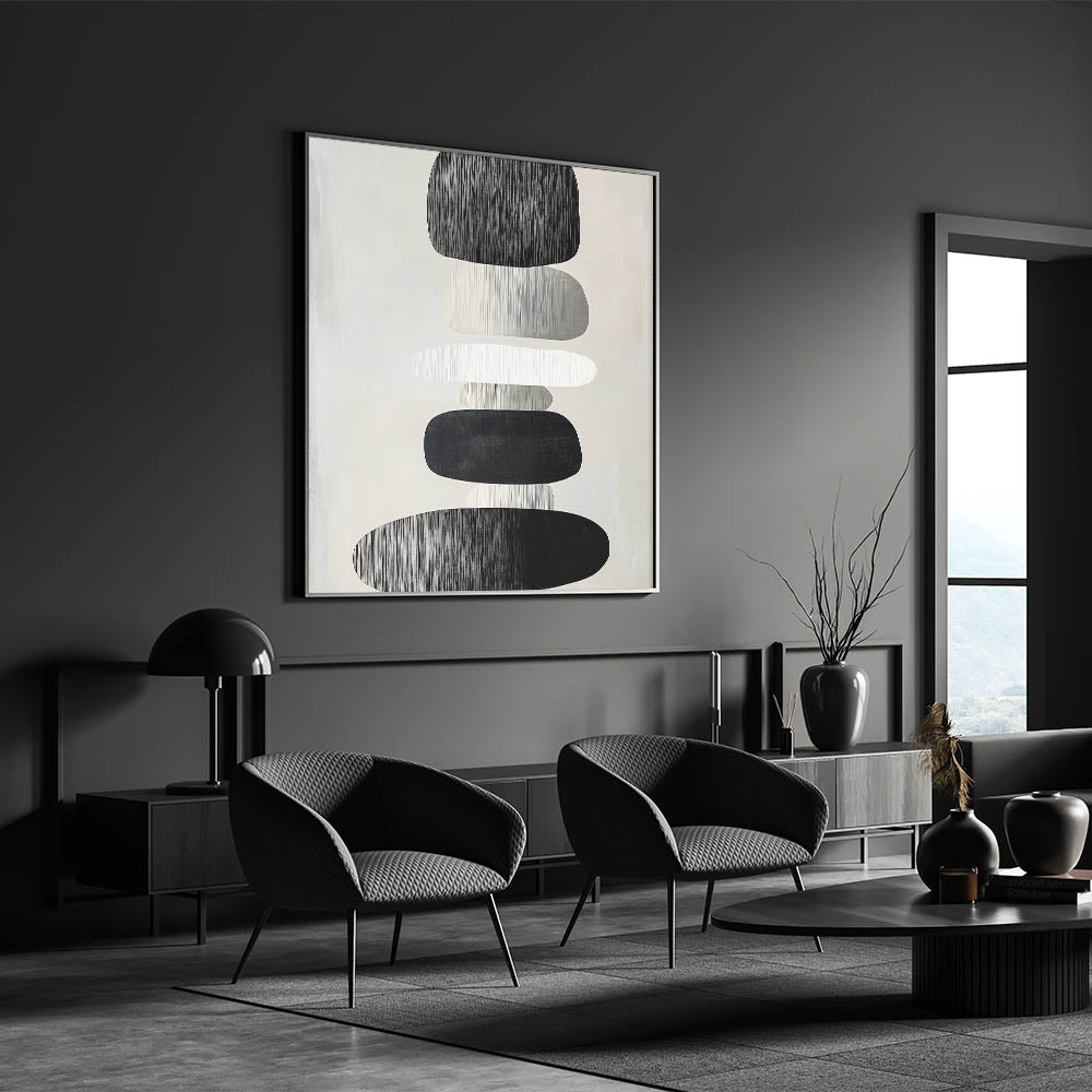 Add modern elegance and peaceful symmetry to your home with this modern abstract wall art. Featuring a stack of organic, oval shapes in black, white, and soft grays, this piece embraces calm through balance and simplicity. The subtle vertical texture and monochrome palette give it a timeless, minimalist edge that fits perfectly in both residential and professional spaces.