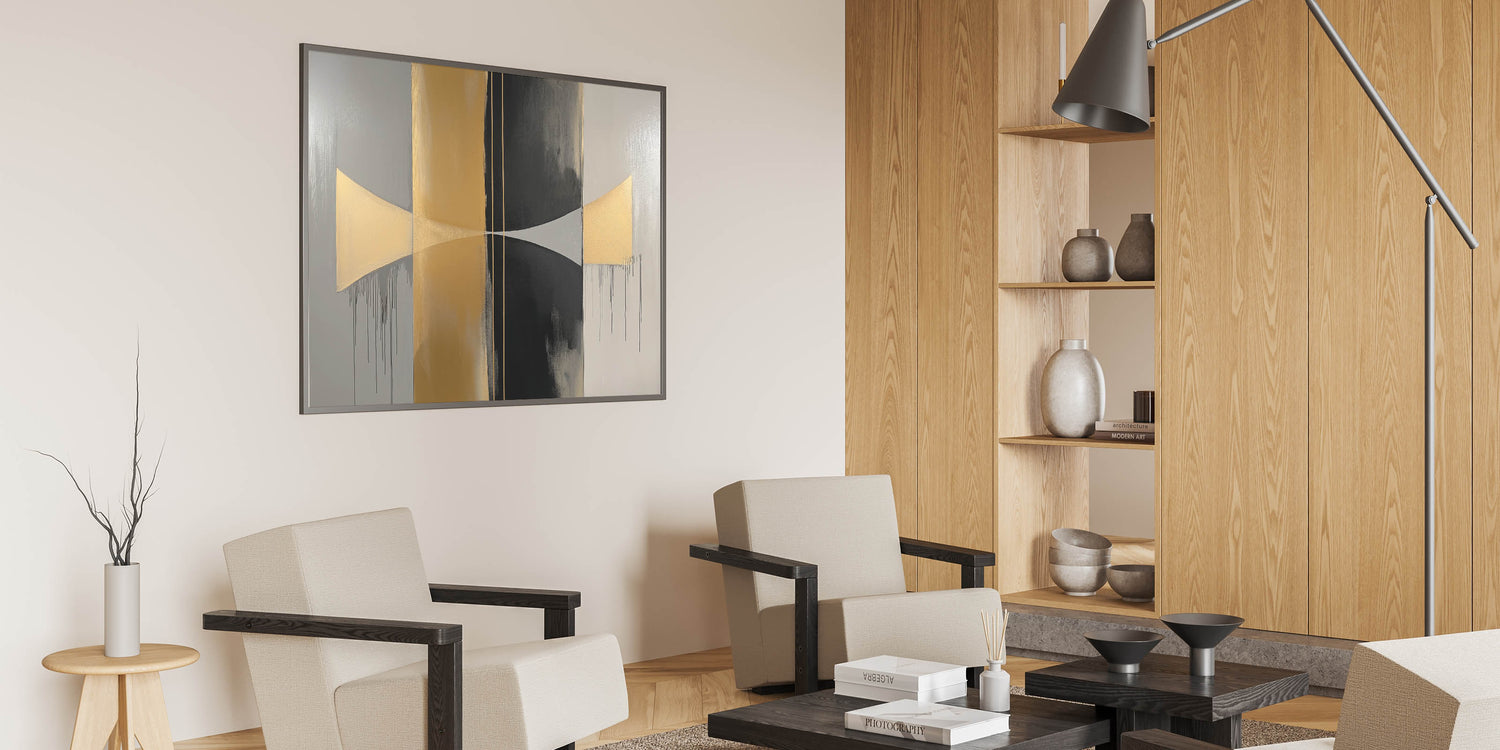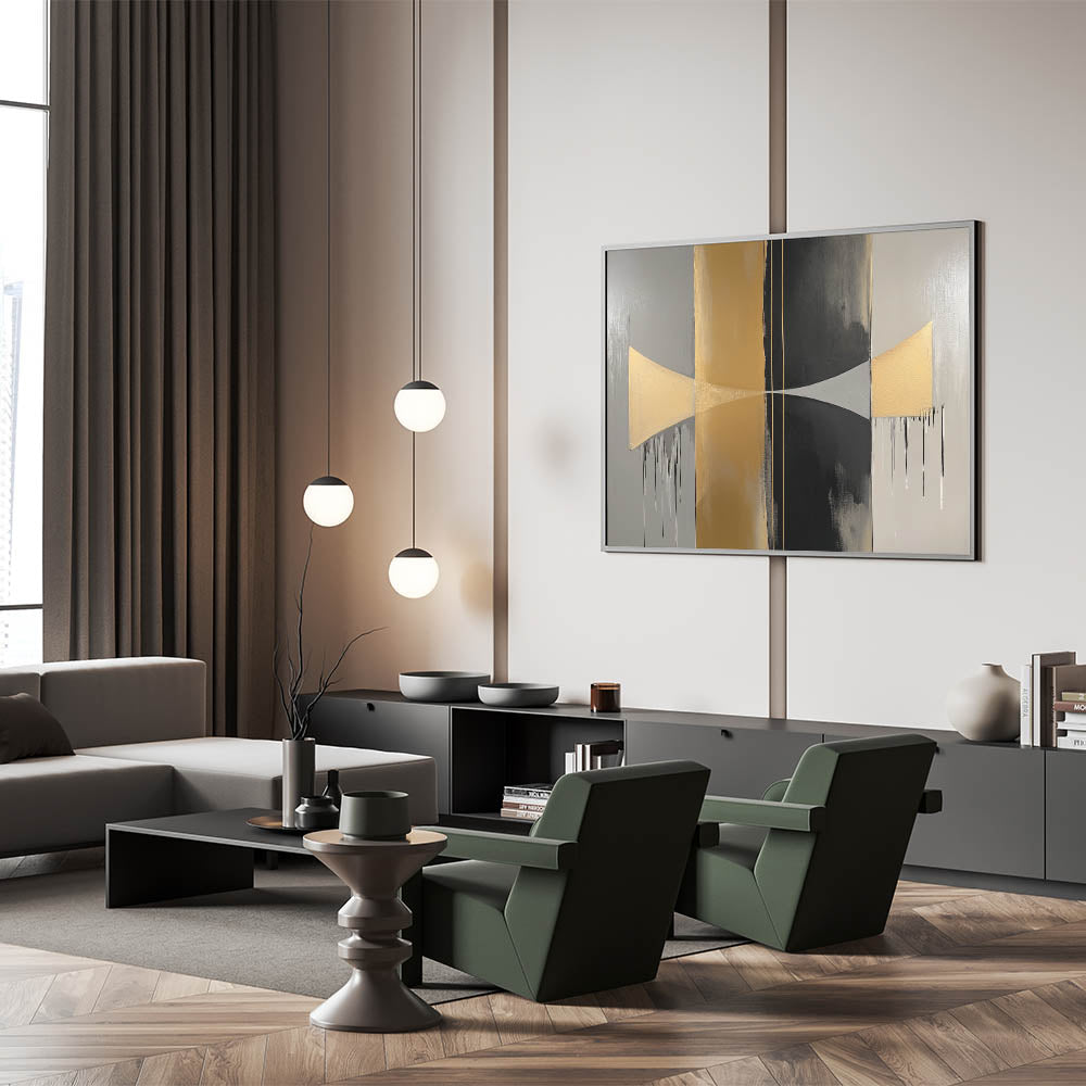 Bring elegance and balance to your space with this Modern Abstract Wall Art, featuring a striking geometric design of gold, black, and gray curved shapes. The central gold accent splits the composition, while soft gradients and dripping textures add depth and a contemporary edge. This piece is perfect for creating a focal point in modern and minimalist interiors.