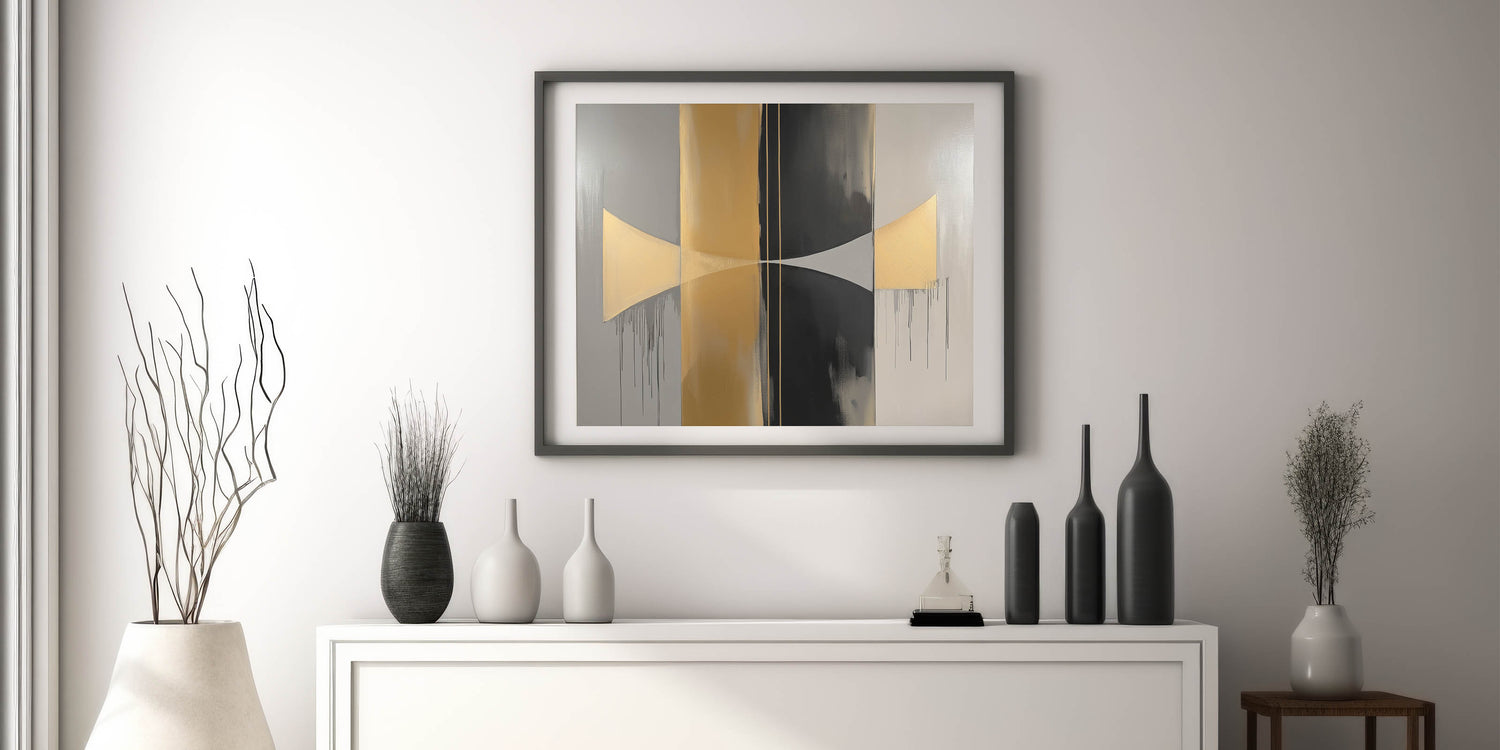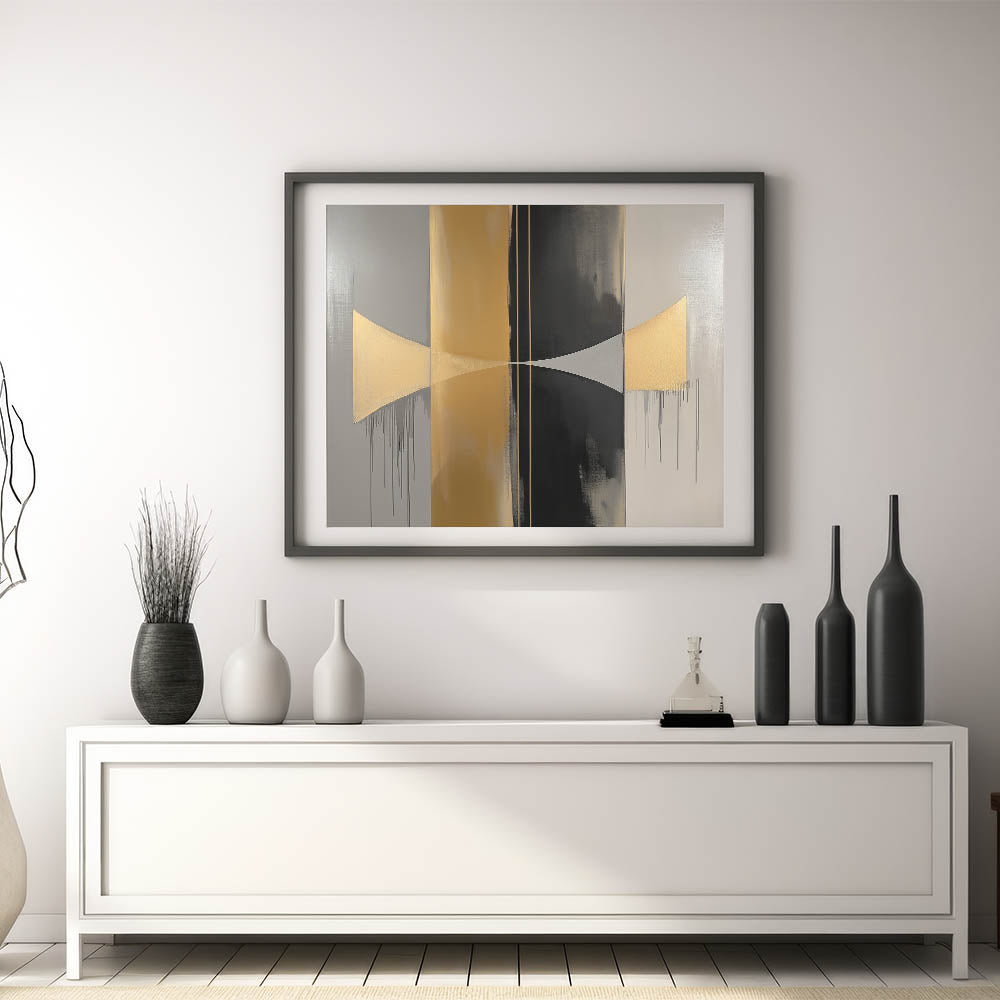 This artwork combines clean lines and fluid shapes to create a harmonious and luxurious design. The metallic gold detail adds sophistication, while the muted black and gray tones ensure versatility. Whether used as a statement piece or part of a larger gallery wall, this artwork transforms any space with its modern charm.