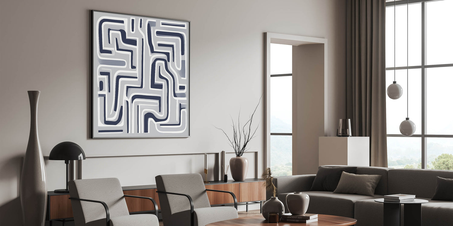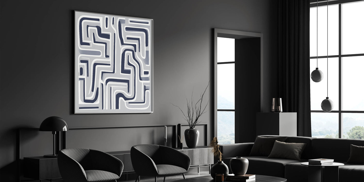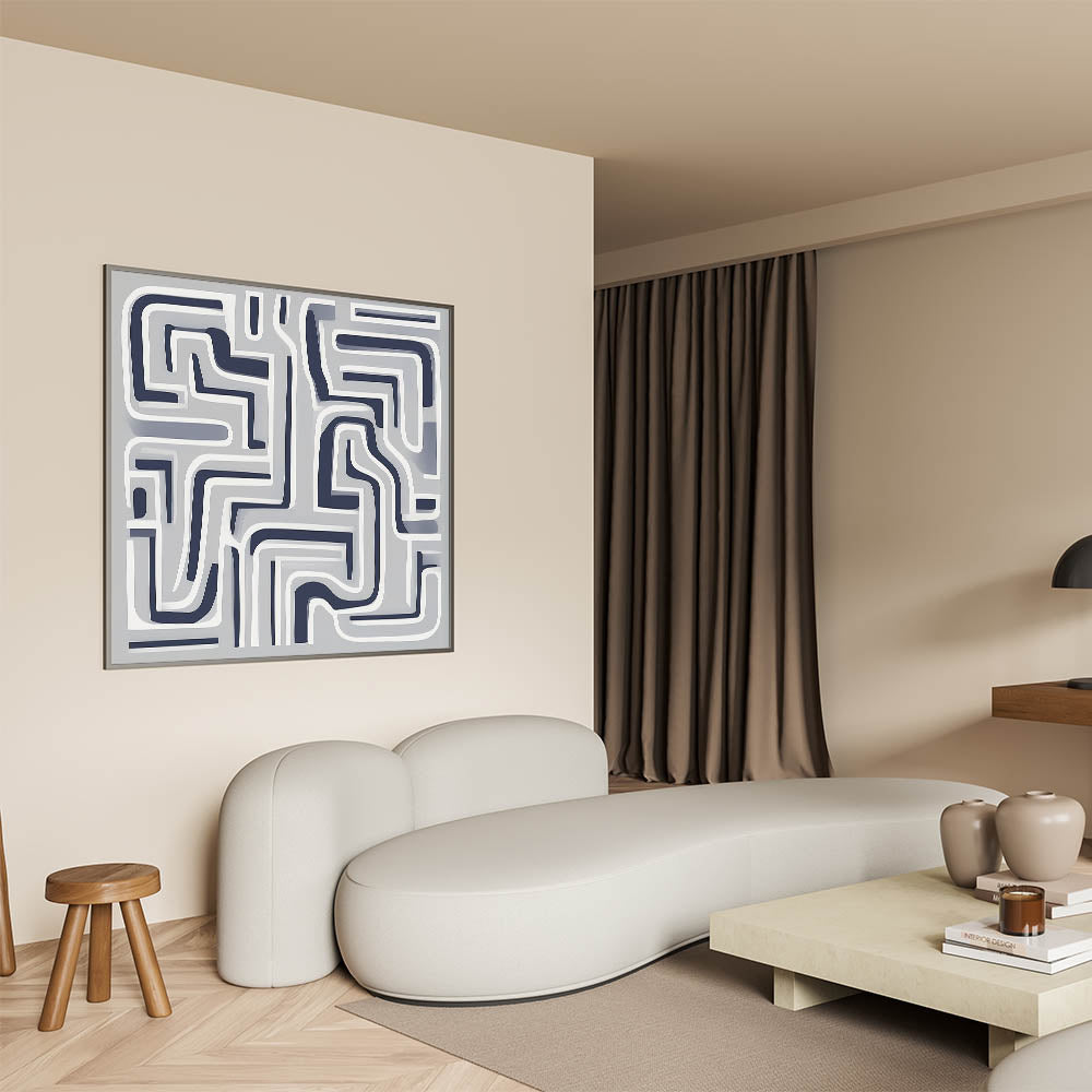 Bold, modern, and graphic—this modern abstract wall art features a maze-like pattern of curved navy and white lines set against a smooth gray backdrop. Its structured complexity adds depth and rhythm to minimalist interiors.