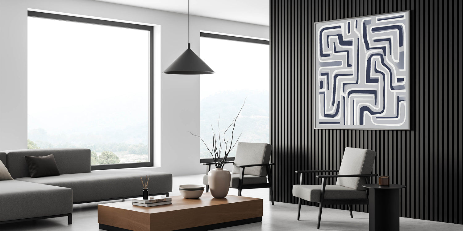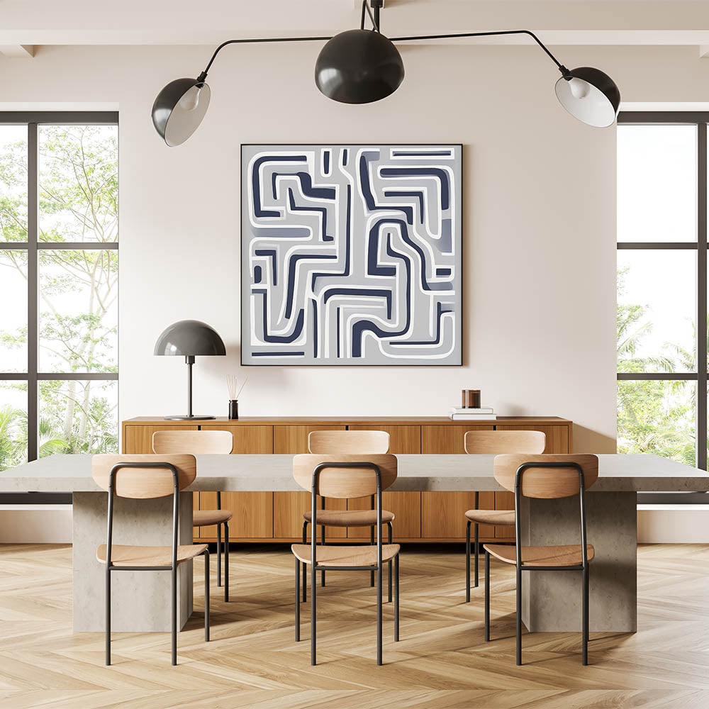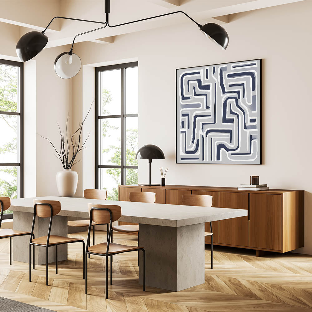 Bold, modern, and graphic—this modern abstract wall art features a maze-like pattern of curved navy and white lines set against a smooth gray backdrop. Its structured complexity adds depth and rhythm to minimalist interiors.